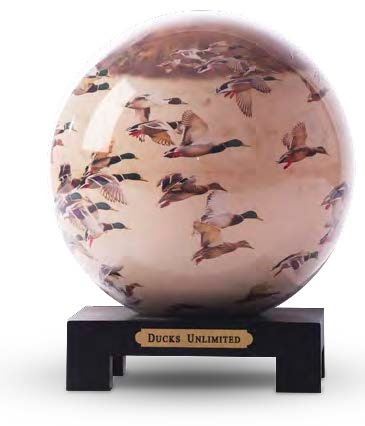 The Spinning Globe customized by Ducks Unlimited epitomizes elegance and innovation, combining aesthetic appeal with sustainable functionality. Featuring a custom design adorned with a captivating mallard image captured by photographer Dawn Wilson, this globe is a tribute to the beauty of wildlife. Powered solely by ambient light, it gracefully turns, showcasing the seamless integration of nature-inspired artistry and modern engineering. Crafted with hidden magnets that facilitate its mesmerizing movement, the globe operates without the need for cords or batteries, embodying a commitment to eco-friendly design. Imbued with a timeless charm, this globe is both a decorative centerpiece and a testament to Ducks Unlimited's dedication to preserving natural habitats.