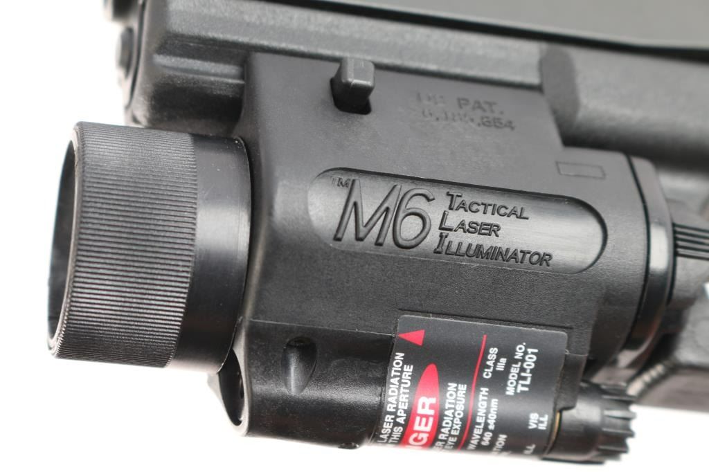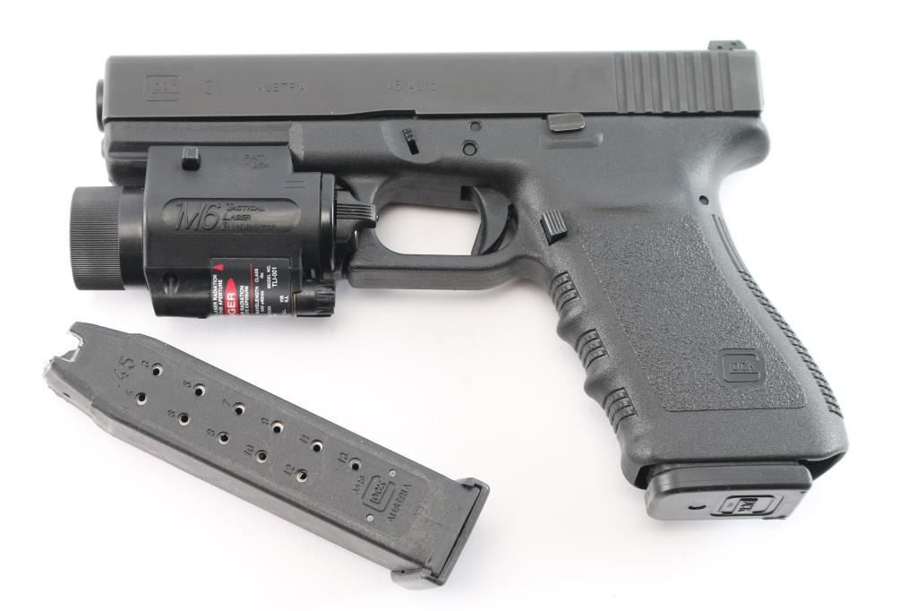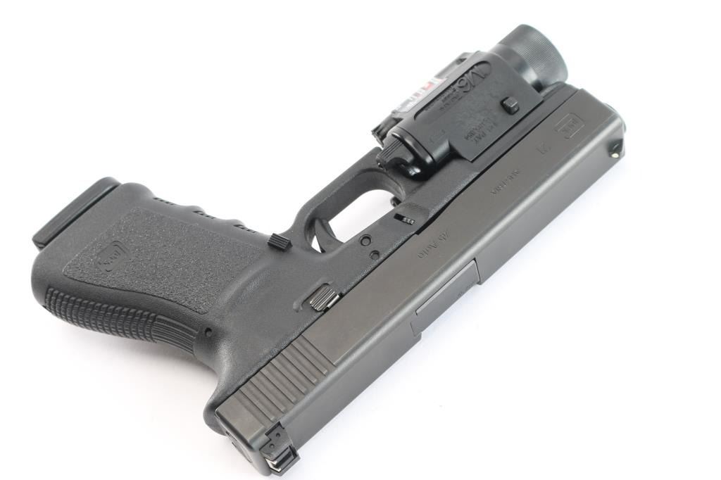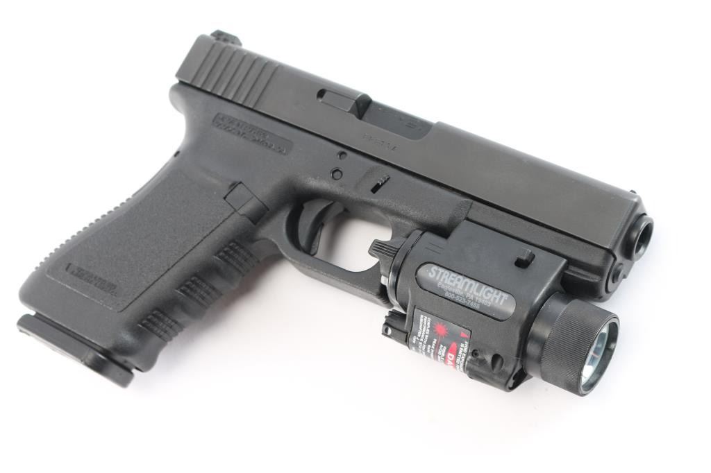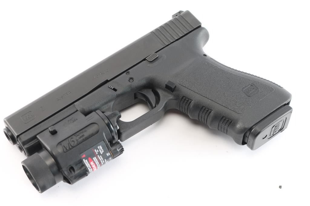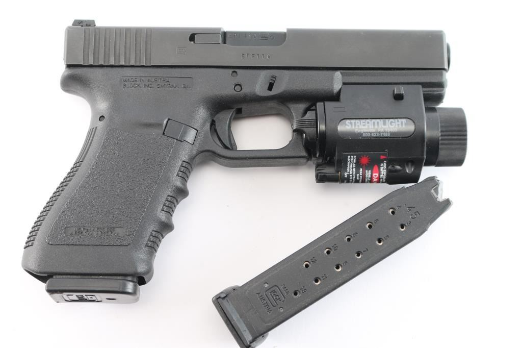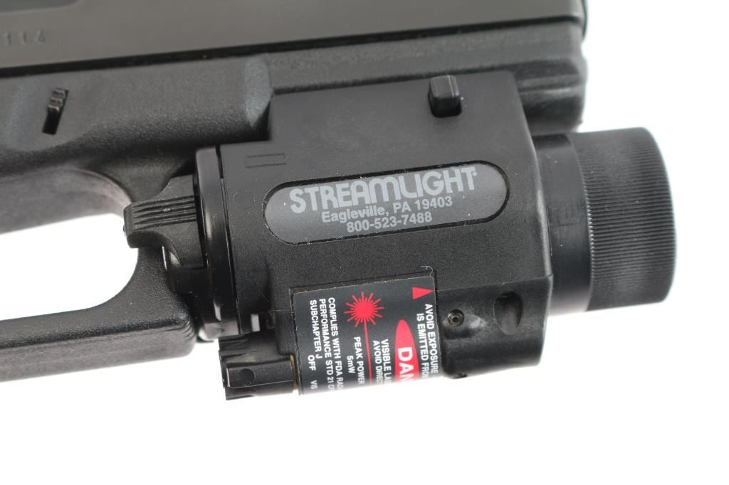 Austrian semiautomatic pistol, imported by Glock Inc, Smyrna GA. Features approx 4.4" barrel, fixed sights with white dot front & white outline rear, striker fired, manual safety in trigger, Streamlight M6 flashlight/red dot sight installed on accessory rail on dust cover. All black finish. Textured, finger grooved grips. Bore is pristine. Overall external condition is like new, with some evidence of handling and use. Includes two factory 13-rd magazines.