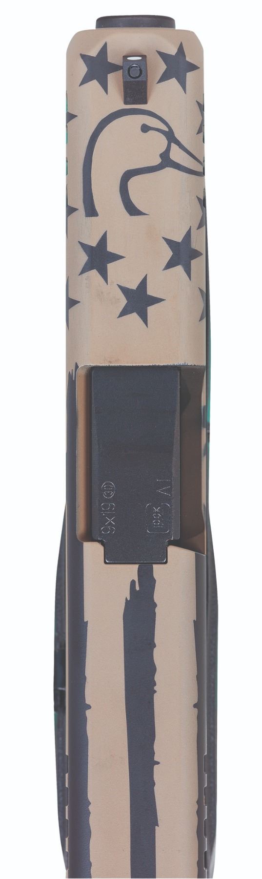 9mm semi-automatic pistol with Glock dependability. Slim, compact design with a full-sized grip for accuracy and comfort. 3.4” barrel. Ten round magazine capacity. Custom stars and stripes Cerakote slide artwork including the Ducks Unlimited logo. Gun lock included