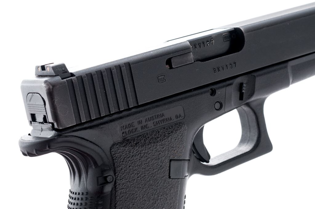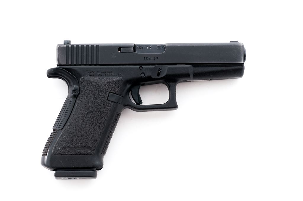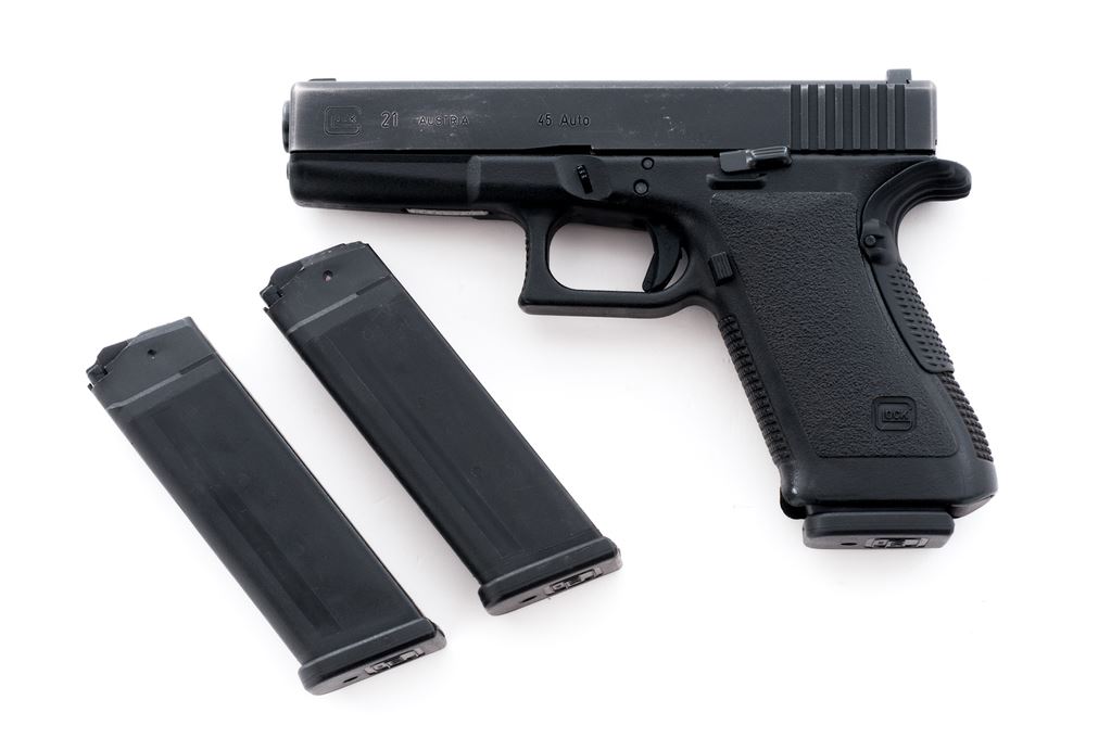 Glock Model 21 Gen 2 Semi-Automatic Pistol, #BKY137, .45 ACP cal., 4-5/8'' barrel, black slide, black polymer frame with added beavertail grip adapter, 3-dot night sights, with three (3) factory 10-round Glock magazines. Condition is very good overall showing signs of moderate use. Slide with some surface scuffs and high edgewear. Right side of grip with a few shallow impressions. Night sights are dim. Action is smooth, bore is mirror bright with a little powder fouling in the grooves; rifling is excellent. Est.: $300-$500. (Modern/PPT)