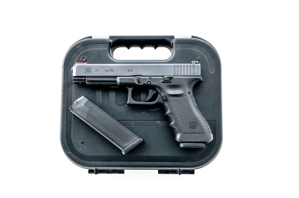 Glock Model 34 Gen 3 Semi-Automatic Pistol, #GDK265, 9mm, 5.31'' barrel, ported black slide, black polymer frame, red fiber optic front sight, white outline adjustable rear sight, lower accessory rail, with two (2) factory 10-round magazines. In original black hard shell case with matching end label, cleaning accessories, owner's manual, gun lock, and speed loader. Pistol is in excellent overall condition showing signs of little use. Slide shows only minor wear around the chamber. Action is excellent with a mirror bright bore. Est.: $400-$600. (Modern/PPT)