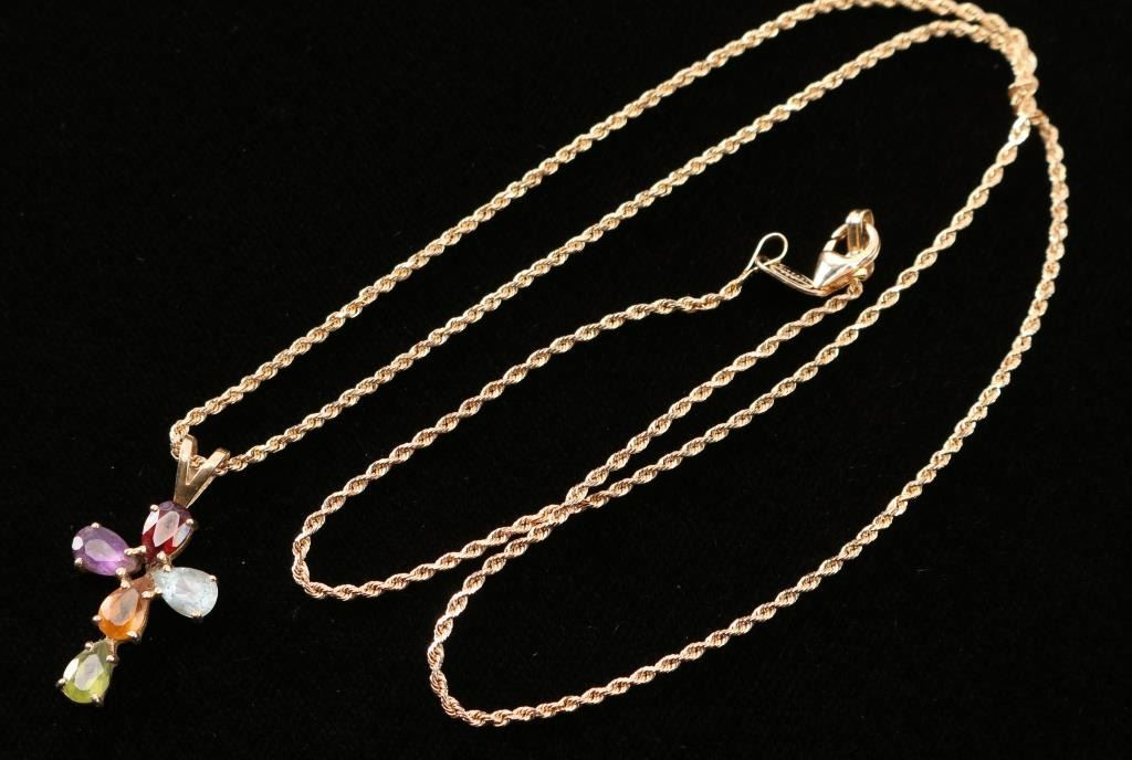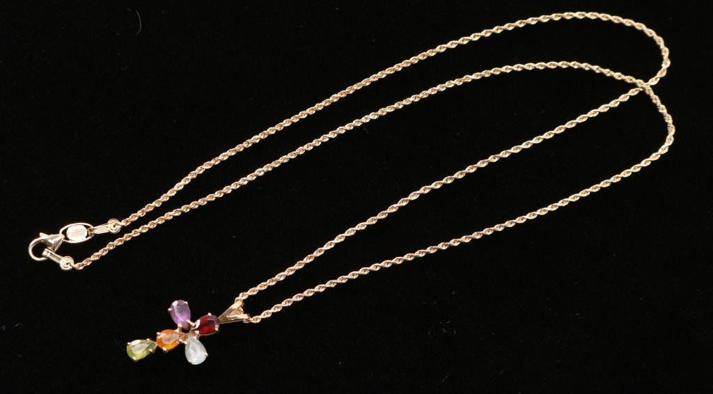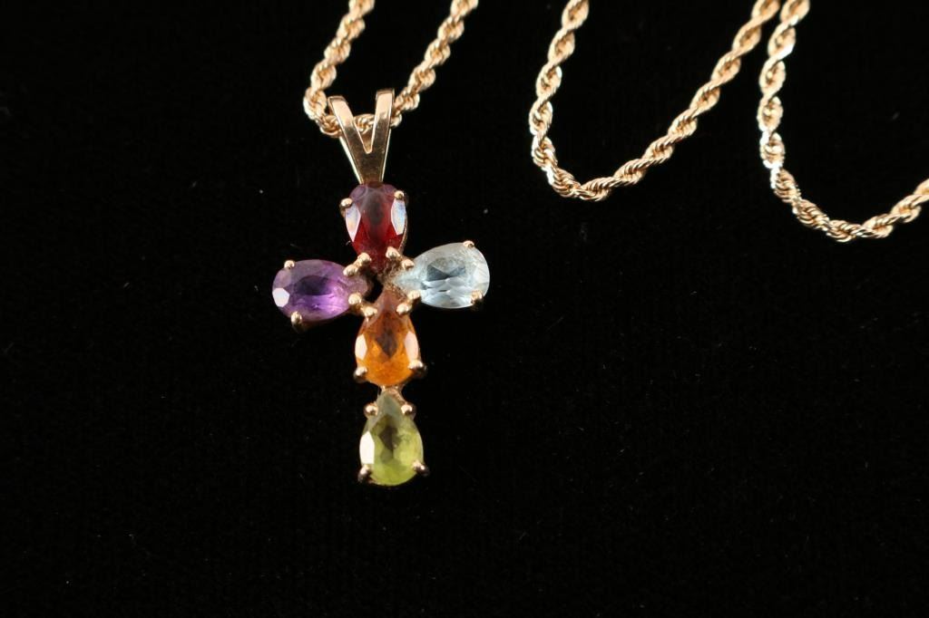 14k gold chain and pendant with garnet, blue topaz, amethyst, citrine and tourmaline cross. Pendant measures 3/4". Necklace measures 11" from drop.
