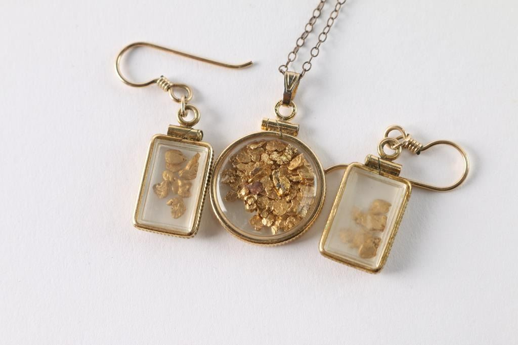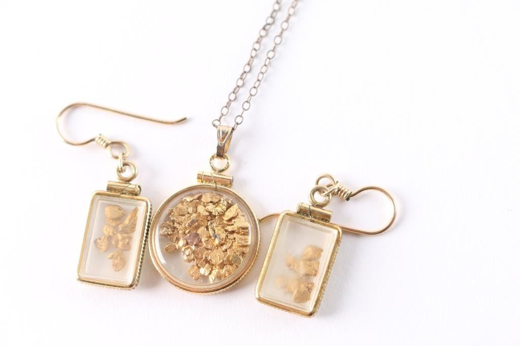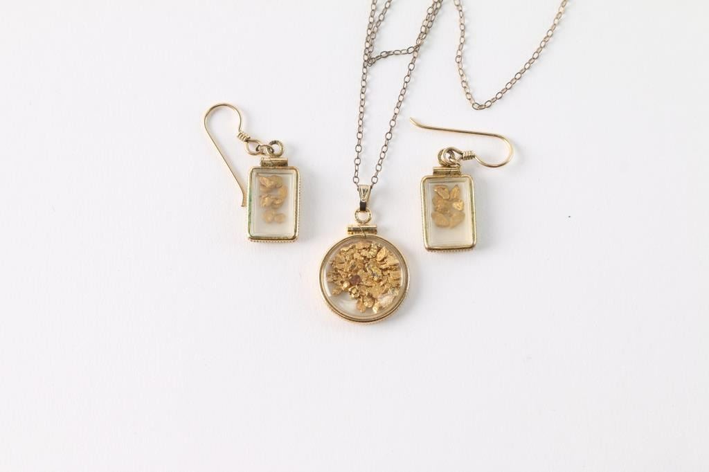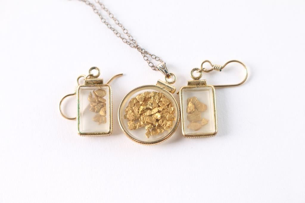 Gold necklace with pendant filled with gold nuggets, weighs 3.10g. Pair of gold dangle earrings holding gold nuggets, weighs 3.24g. Over 6g Total Weight