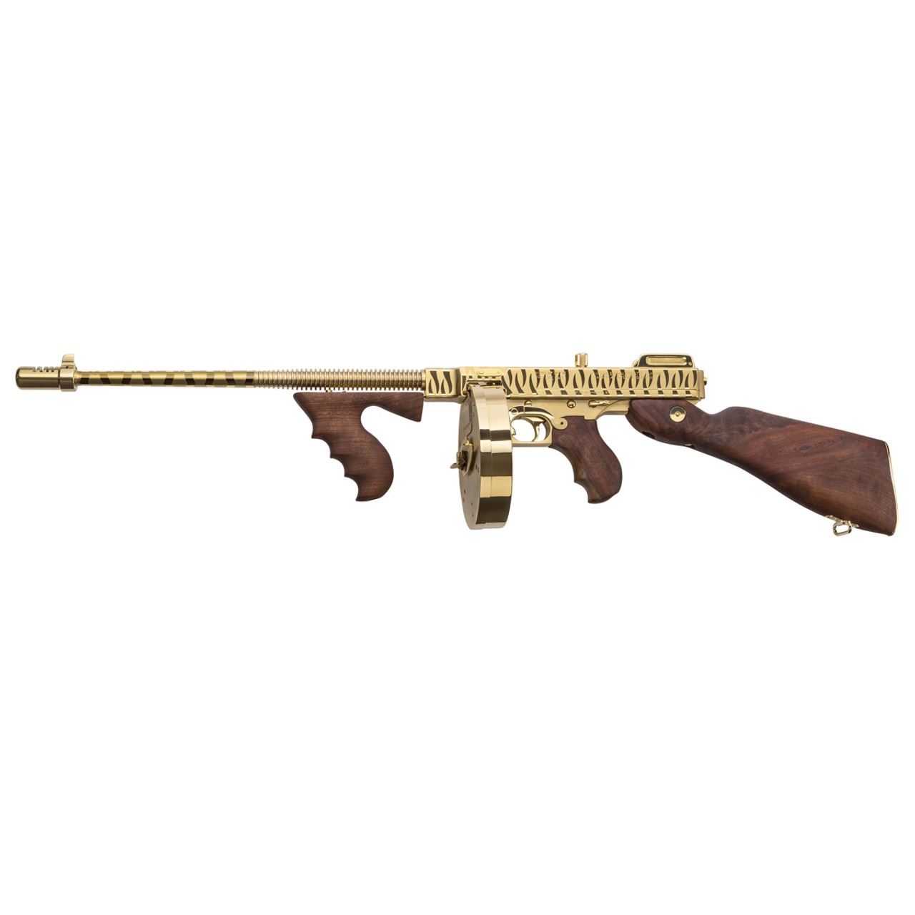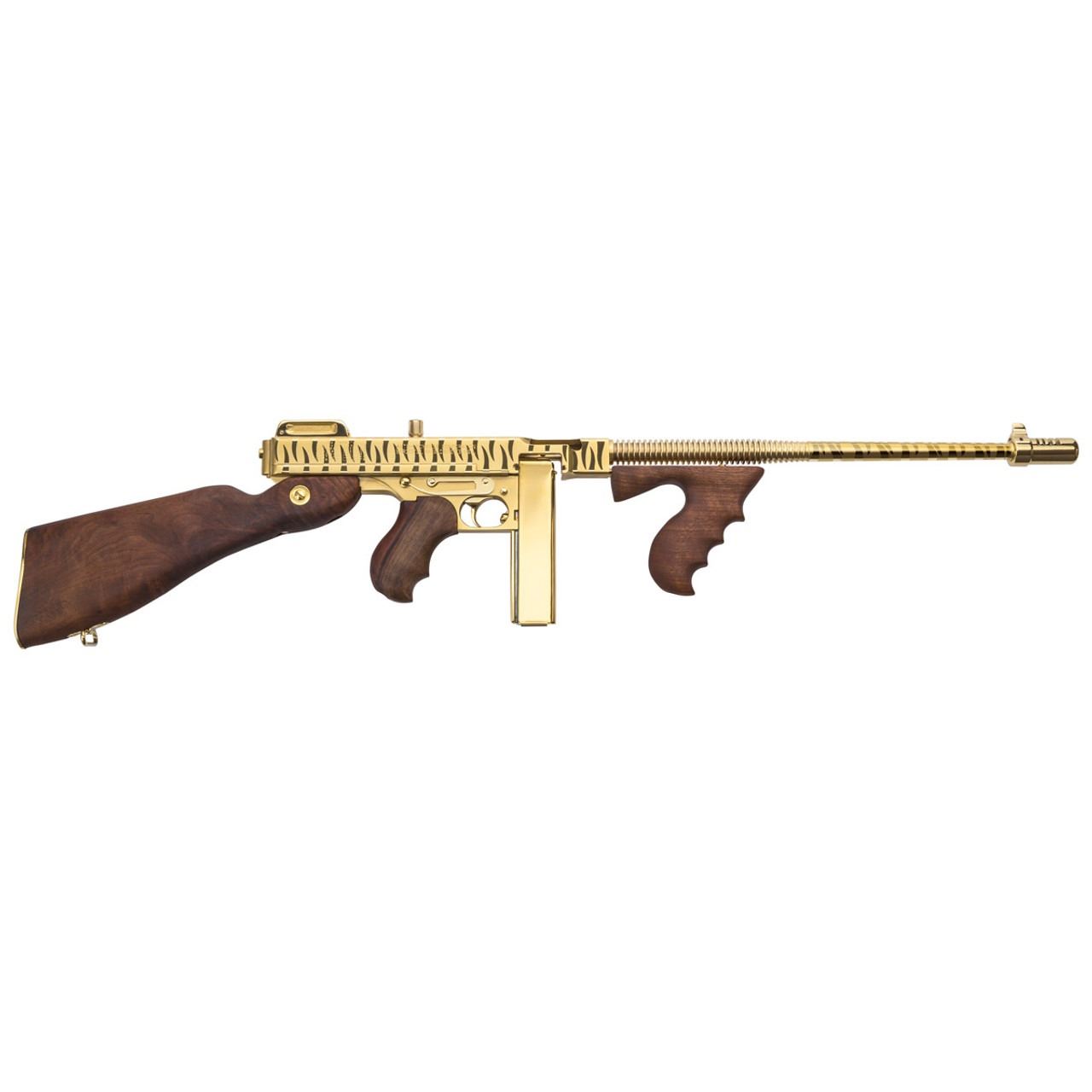 This Tommy Gun features a steel receiver with a beautiful Titanium Gold tiger Stripe finish.