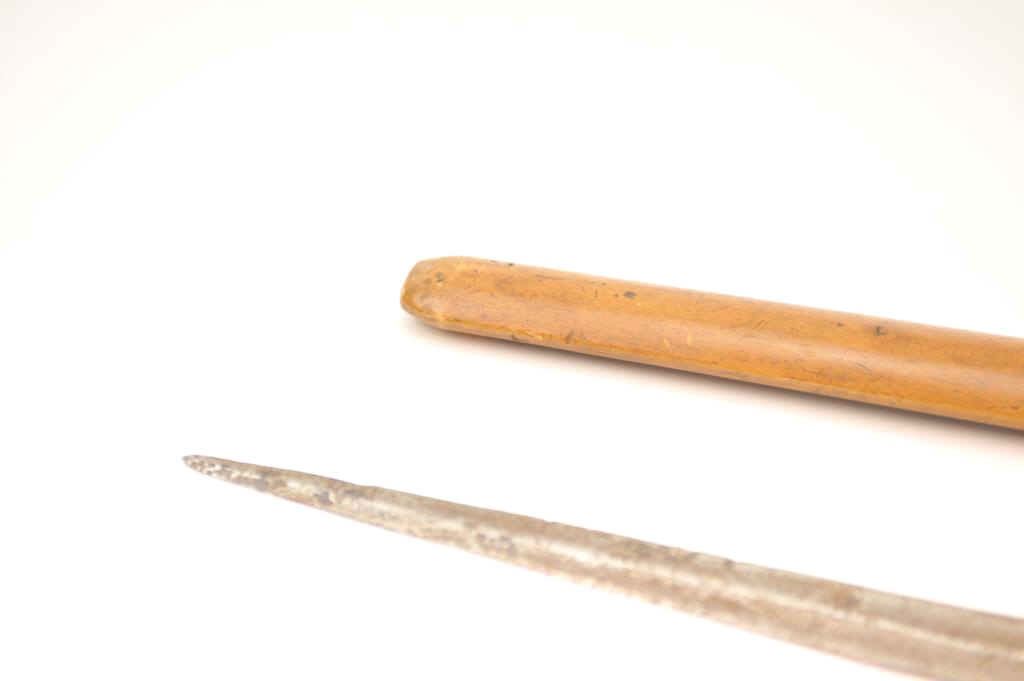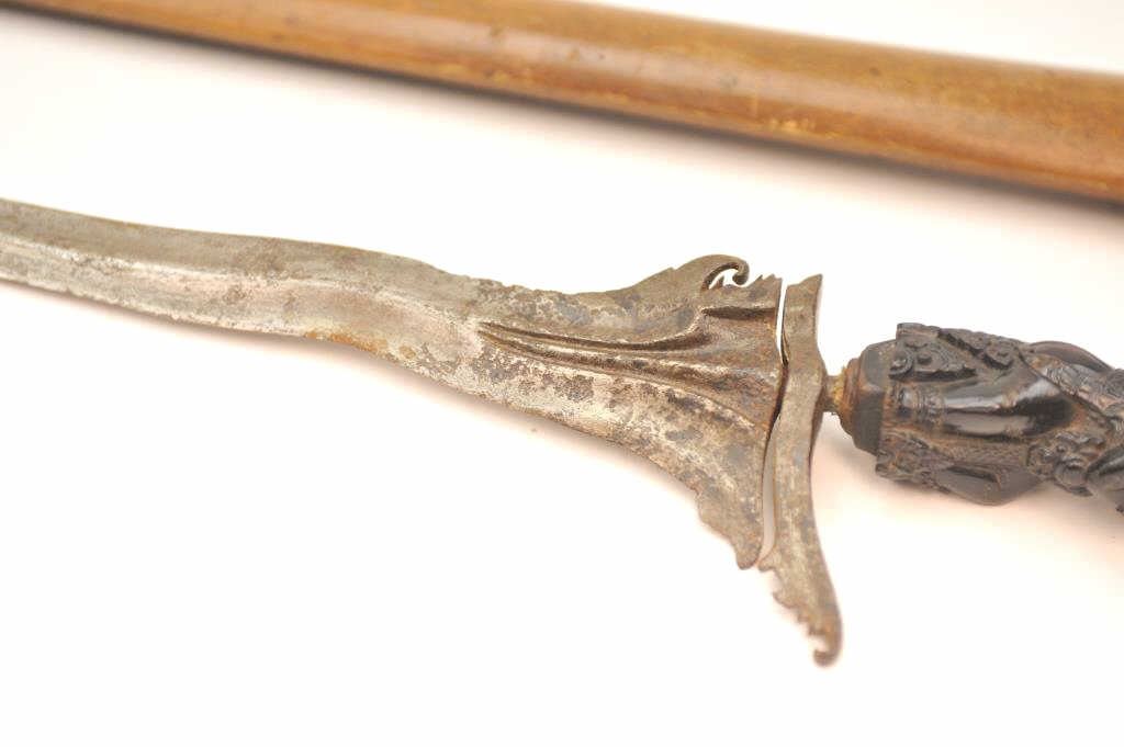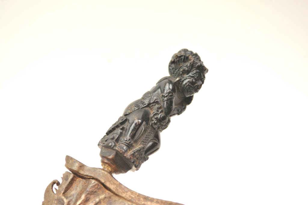 Good Malaysian Kris with meteorite steel blade and an exotic carved wood hilt depicting a deity. The scabbard is nicely figured Burl wood. The blade shows some pitting but is good overall and an authenticarm which is 100-200 plus years old. Est.: $200-$400.