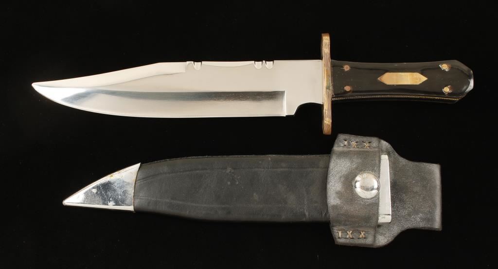 Marked "JP Henry" with motto "Liberty or Death" showing striking snake. The knife measures 14" overall and has a semi coffin shaped hilt with blackened horn grip. Condition is fine to near excellent. A collectable maker.