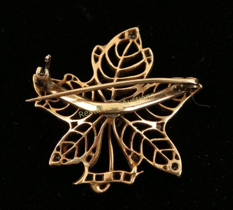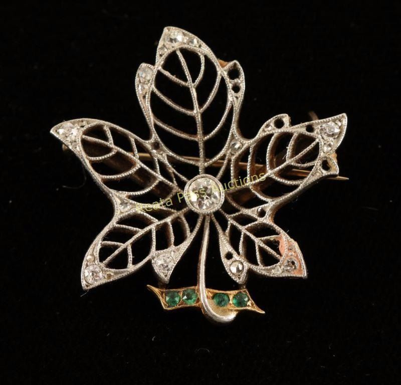Maple leaf brooch with larger center diamond surrounded by 8 diamonds accented with four small emeralds white gold front and yellow gold back from a prominent Prescott estate.