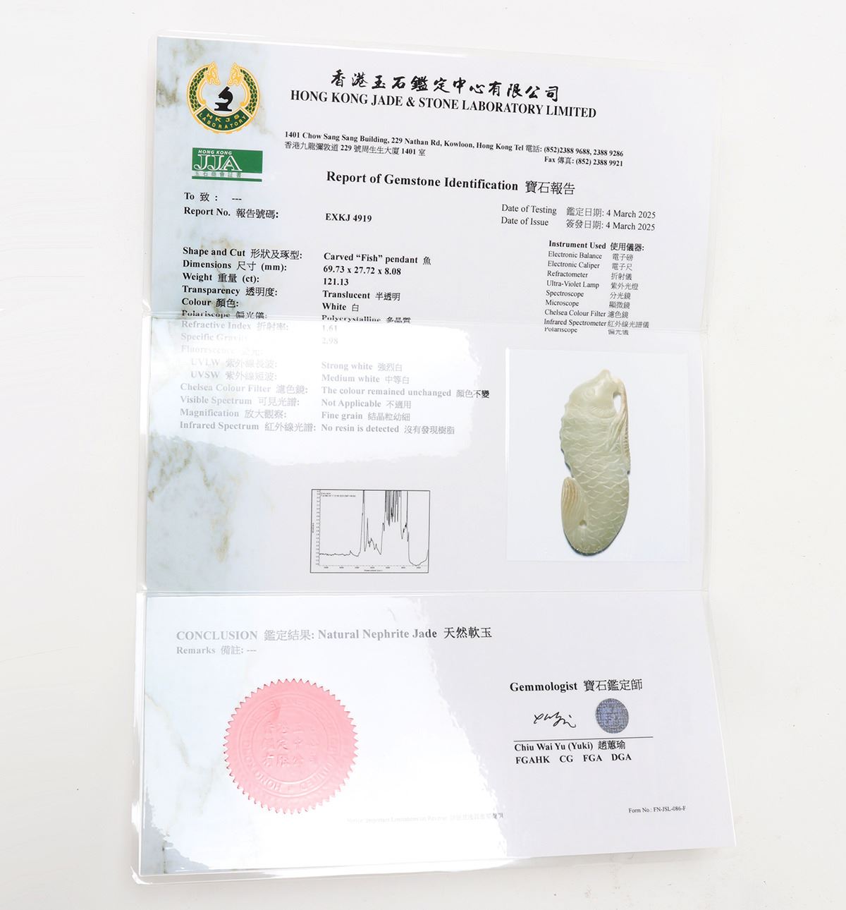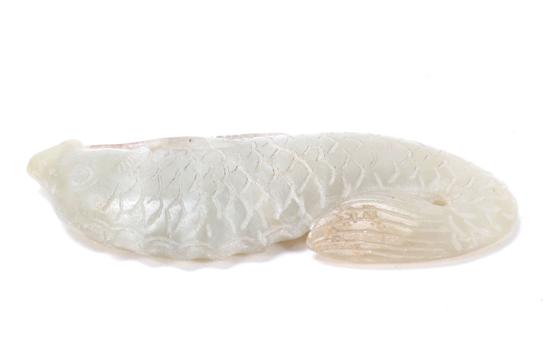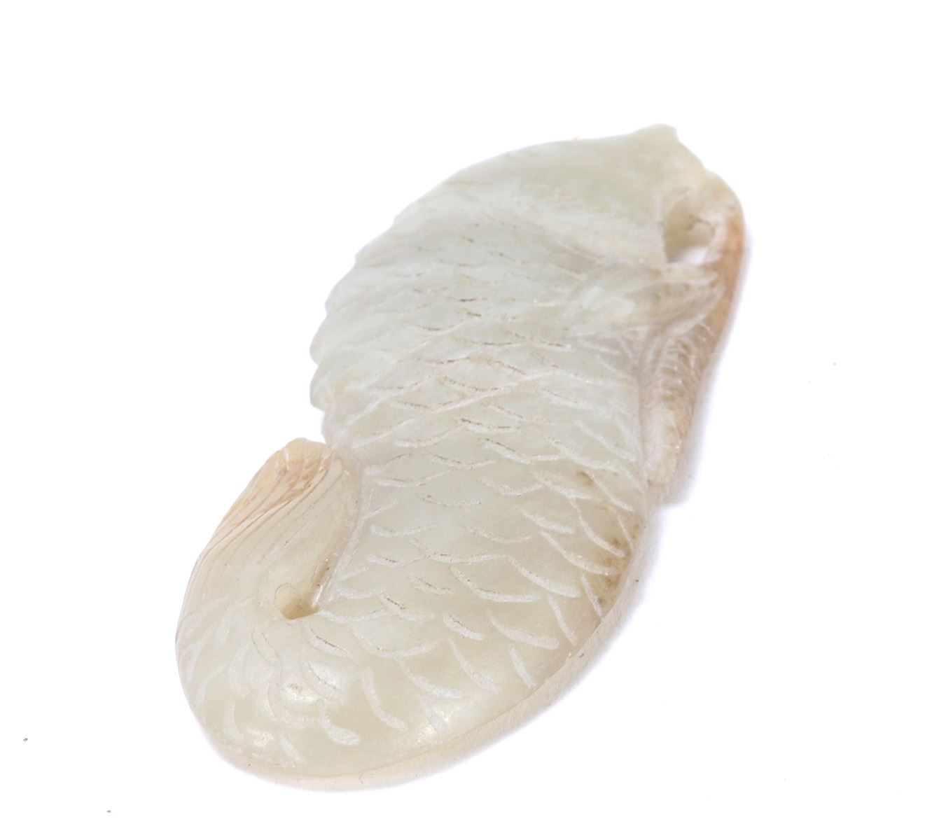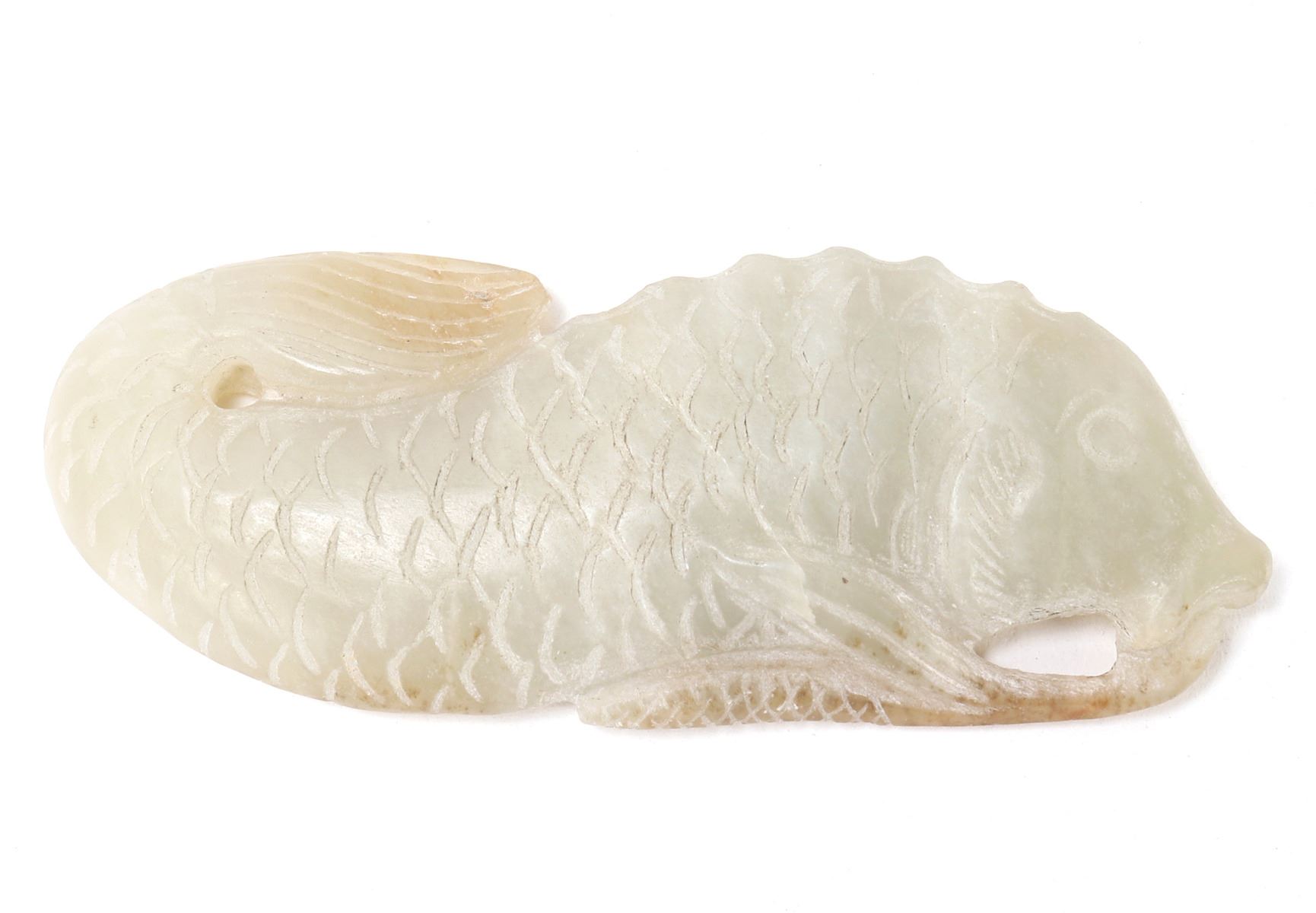 Fine Chinese natural nephrite jade fish carved pendant, looped at the tail for suspension. Incised details and scales throughout with fin and tail. Size 2 3/4" L, weight 24 g. Condition: Wonderful wearable condition.