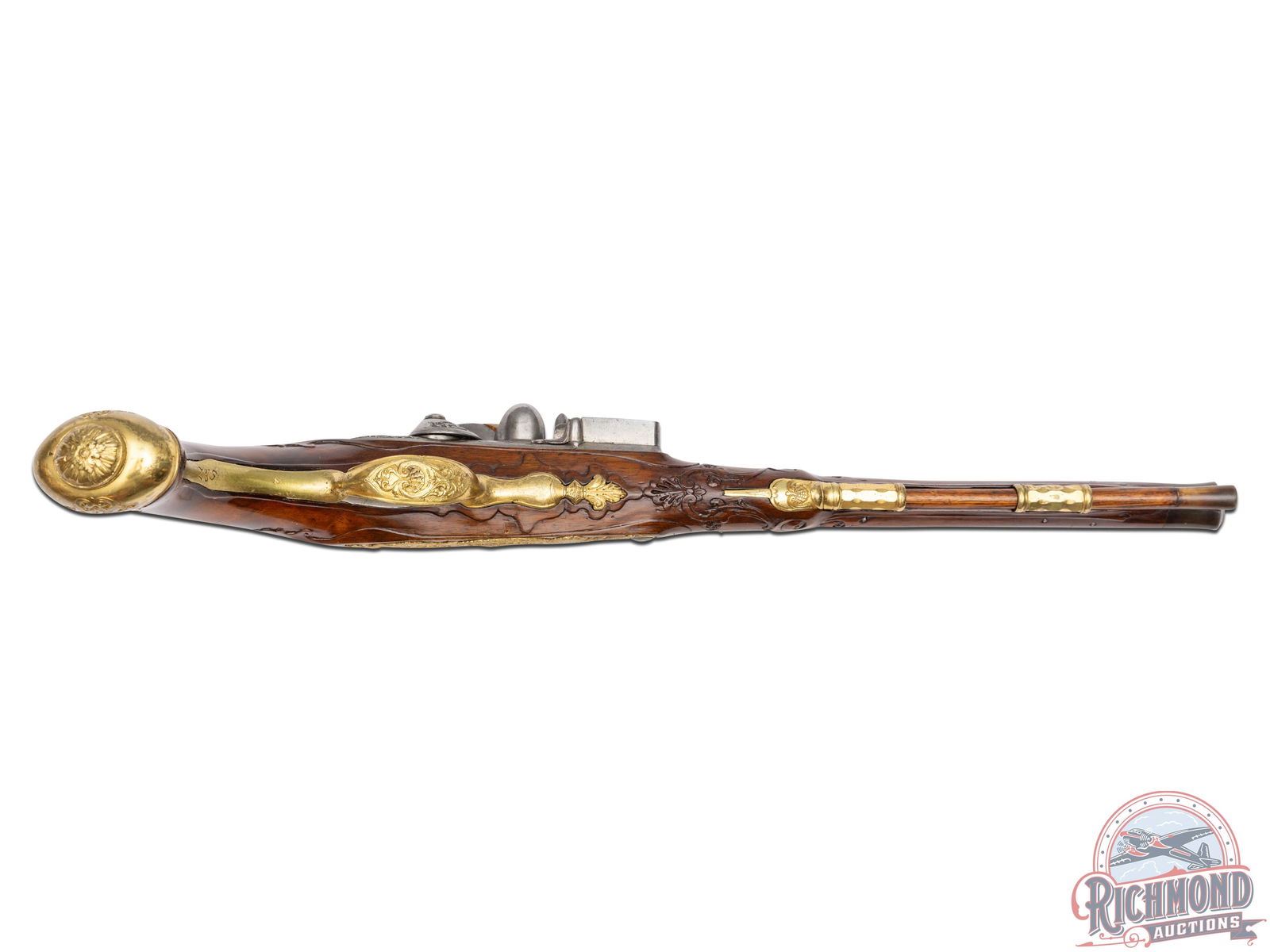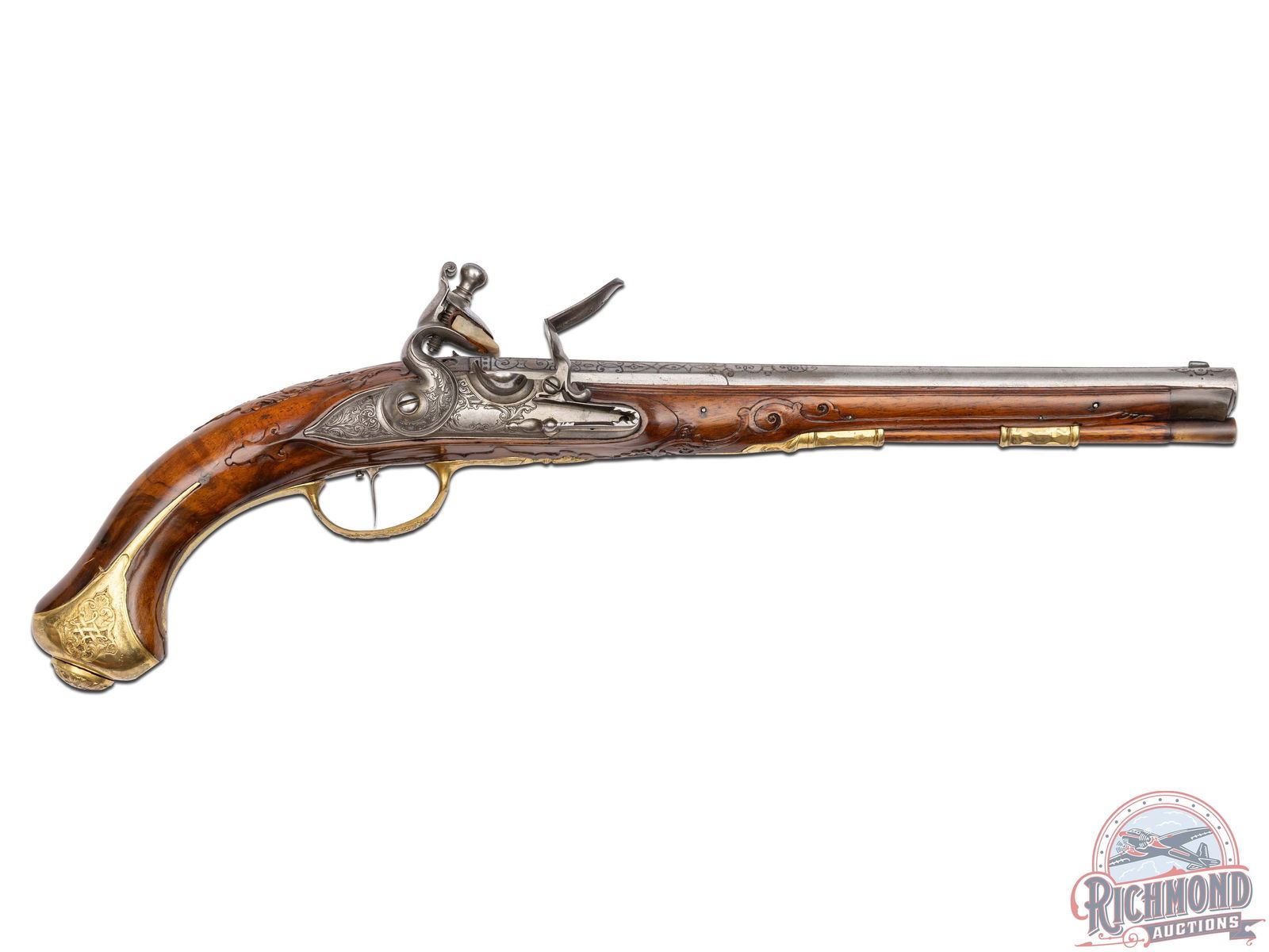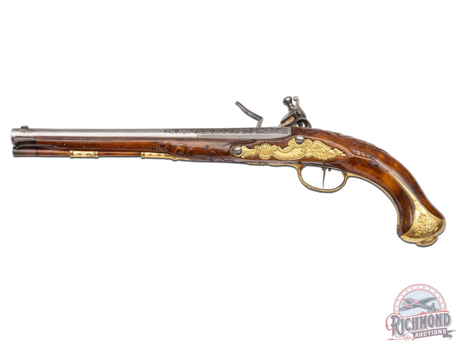 Made by Johann Andreas Kuchereuter in Regensburg, Germany circa 1750. Johann was a member of the famous Kuchenreuter Gunsmith Family who made guns for European royalty and whose surviving examples are in major museums throughout the world. A pair by this maker is on display at the Metropolitan Museum of Art in New York City. The pistol is in the style used by Officers or Military Horse Soldiers measuring 17-1/2" overall with a 11-1/4" three faceted to round polished steel barrel in 45 caliber smoothbore with countersunk muzzle for ease of loading. Barrel has silver washed scrollwork and is marked "Joh And Kuchenreuter" with first initials gold washed. Breech has recessed square with gold "Knight on Horse" inlay with tang having a "2" indicating this gun was probably once part of a pair. Pistol has silver blade front sight and fixed rear notch sight. Military style rounded floral engraved polished flintlock with floral engraved cock and frizzen with single set trigger control. Lock is held by a gold Ormolu floral raised pattern sideplate with fire blued lock bolts. European fruitwood stock with raised floral carving around tang and a raised "DEITY" face in thumb position. Pistol has Fleur-De-Lis raised pattern behind locks and around tailpipe. Butt is fitted with gold Ormolu "Skull Cracker" type butt cap with raised floral and scroll design. Gold Ormolu trigger guard with extended grip tang and marked "No. 2" with raised floral pattern on bow. Gold Ormolu tailpipe and ramrod ferrel with horn tipped hardwood ramrod and horn nosecap. Dazzling Revolutionary War Era pistol. CALIBER: 45. FFL STATUS: Antique.