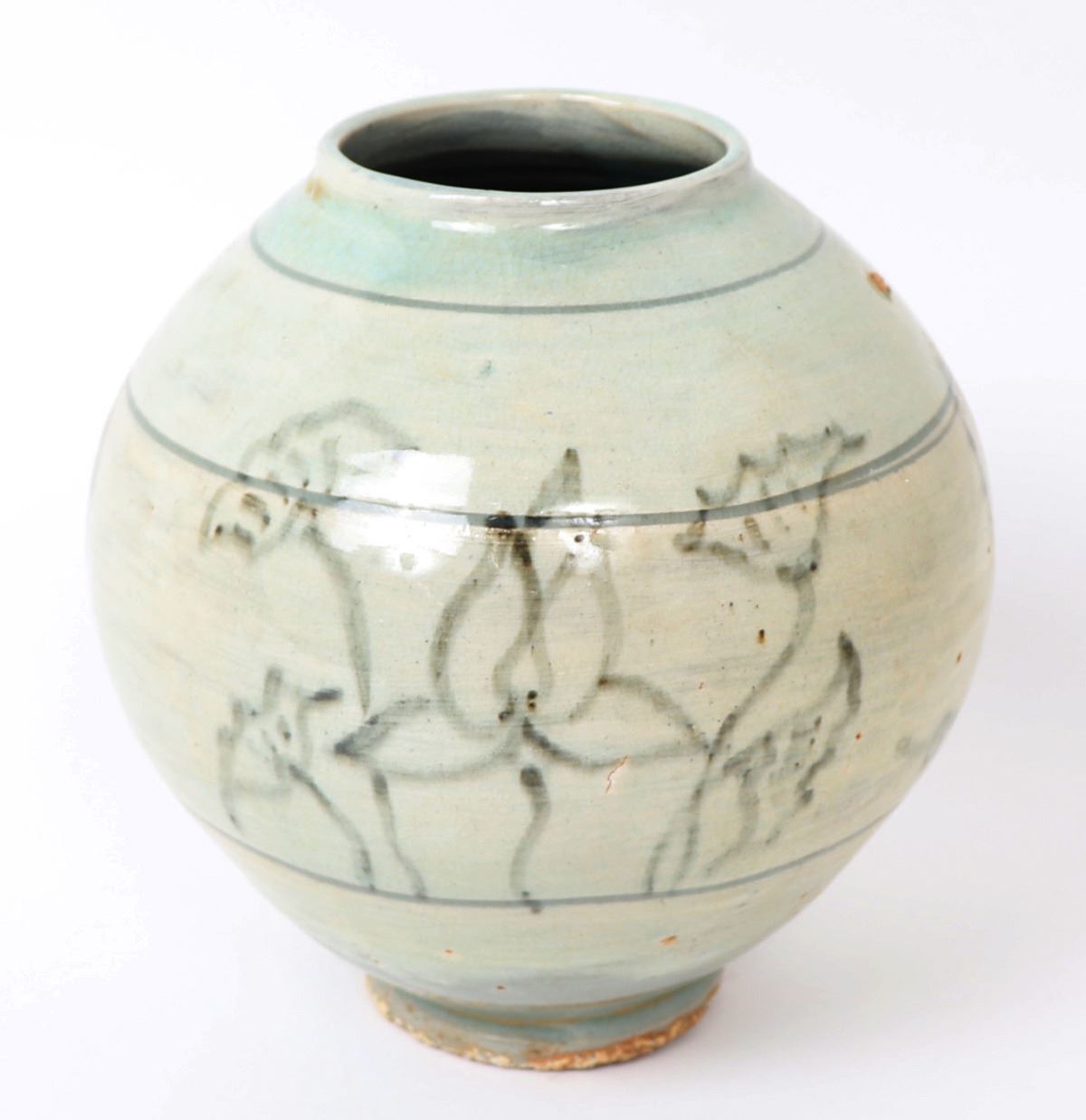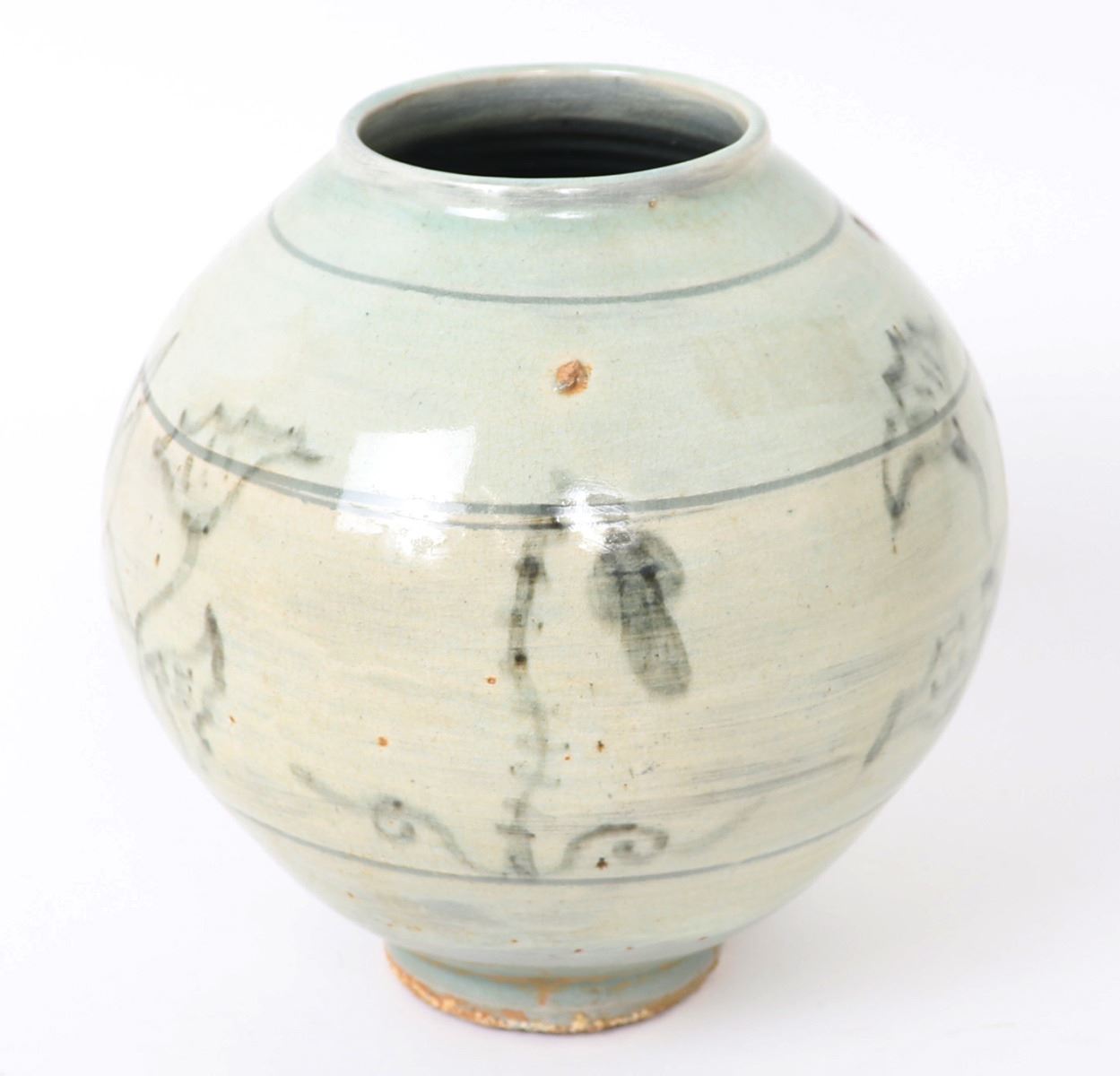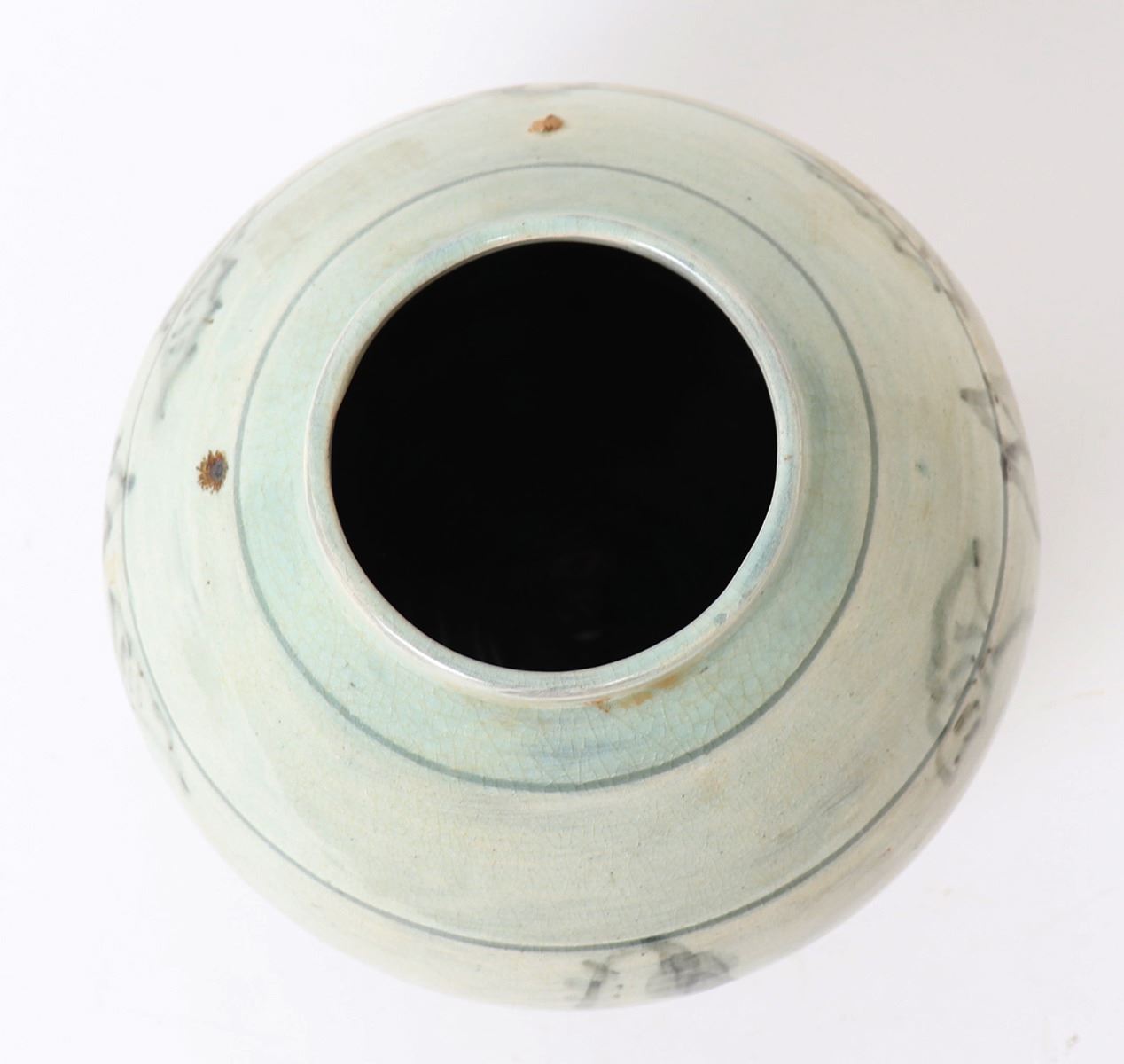 Late 19th century Korean porcelain crackle glazed vase in a unique turquoise green faded glaze. Painted with a light forest green details of blooming flowers and four bands around the body. Raised unglazed foot with possible stilt mark remaining. Size 8" H. Condition: Small firing flaw crack to foot, else in very good condition.