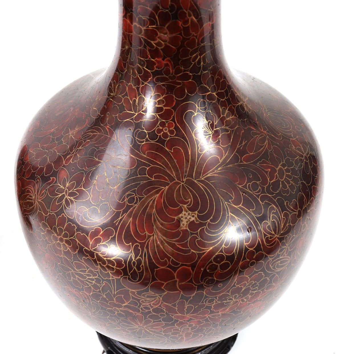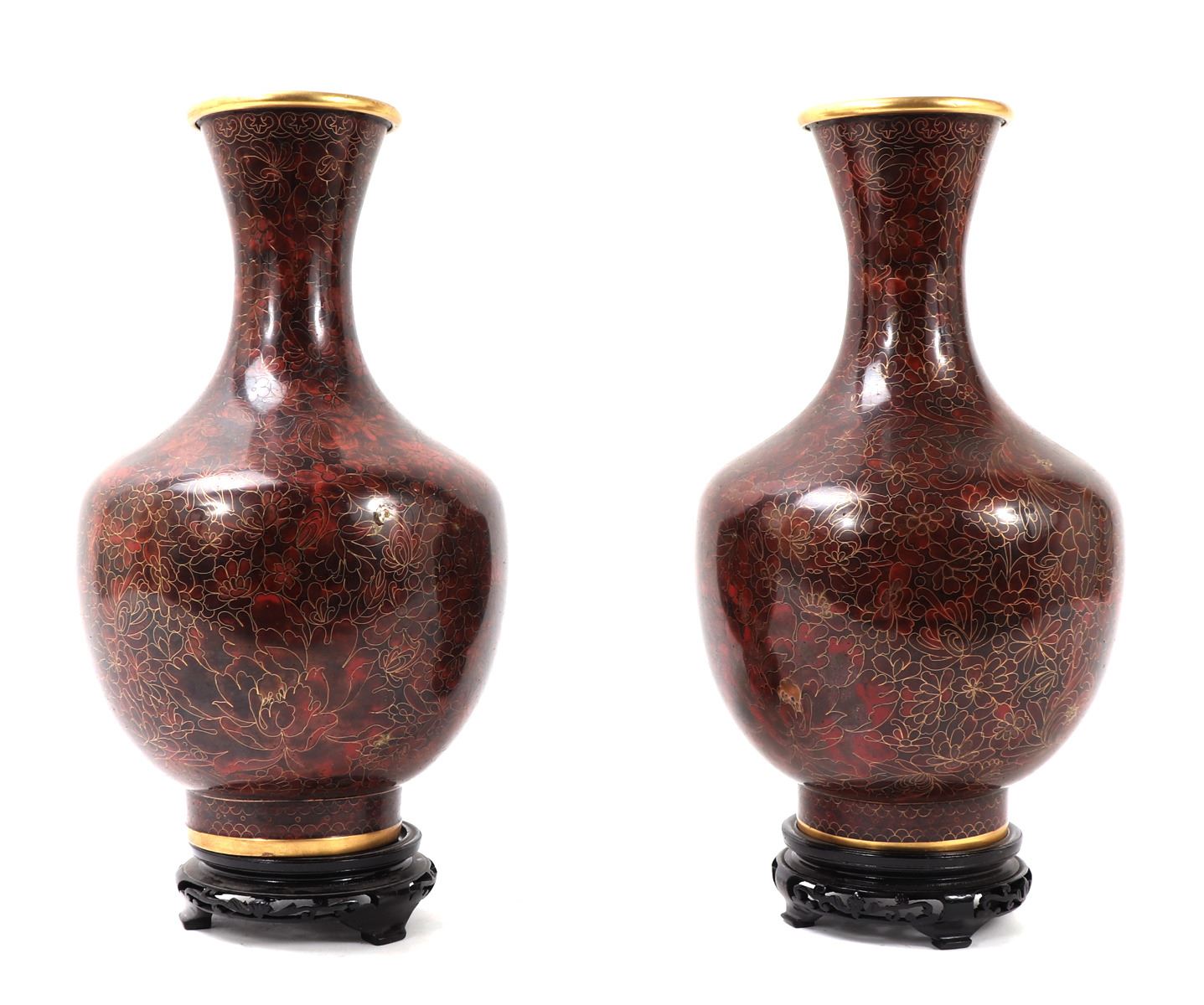 Chinese red cloisonne vases with beautiful intricate copper inlay throughout with blooming chrysanthemum flowers covering the body. Narrow taper long neck with slightly flared rim. Base is unmarked and colored in a blue with custom bases. Size 8" L x 8" W x 15" H, weight 2013g each. Condition: Beautiful overall condition.