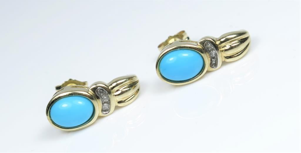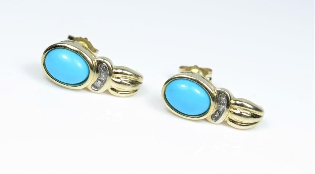 featuring 2 oval shaped cabochon Turquoise accented with 6 round cut channel set Diamonds set in 10 karat yellow gold.