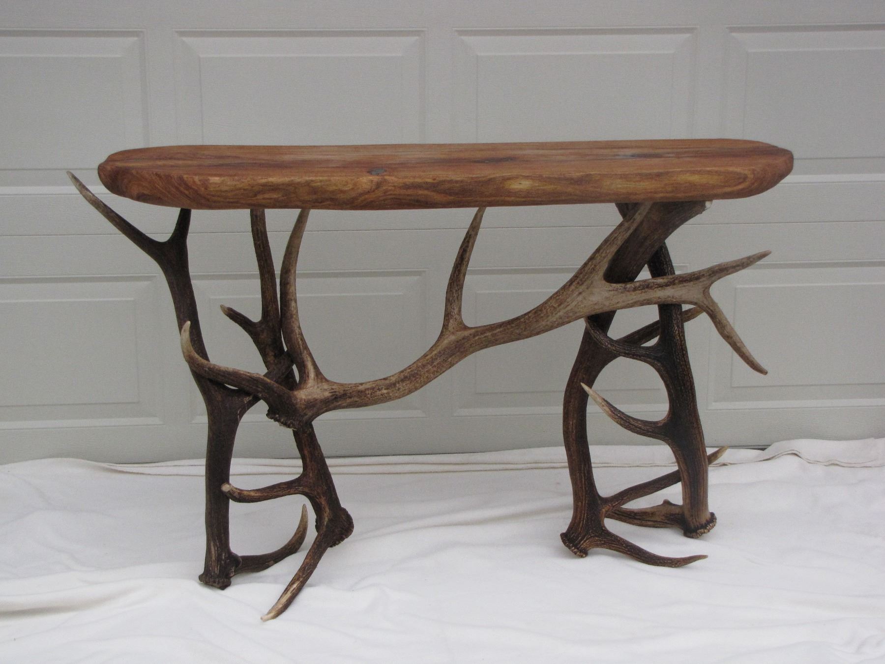 Gorgeous hand crafted sofa table made from elk antlers with a mesquite wood top. Since the late 80's, artist John Haggard has turned a fascination with antlers into a full time job by creating one of a kind furniture. Generously donated by Mark and Peggy Rose. ***Table will be at the rotg auction***
