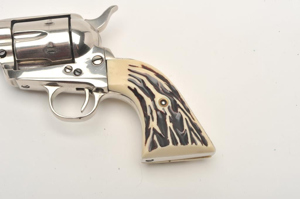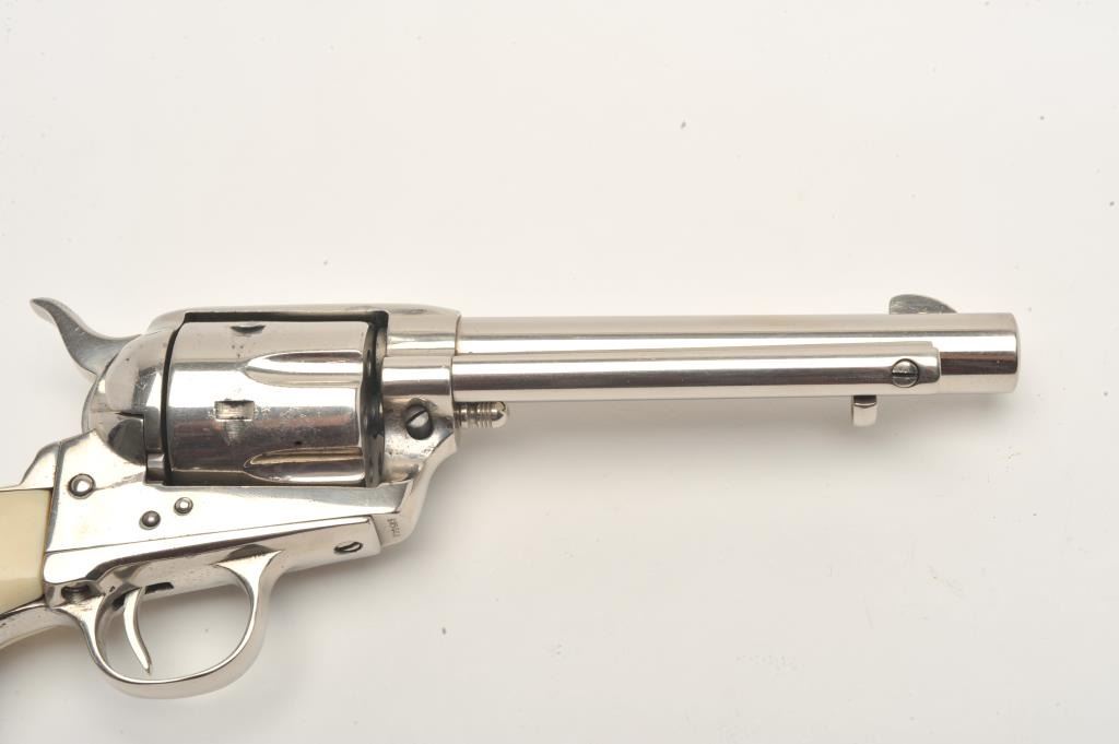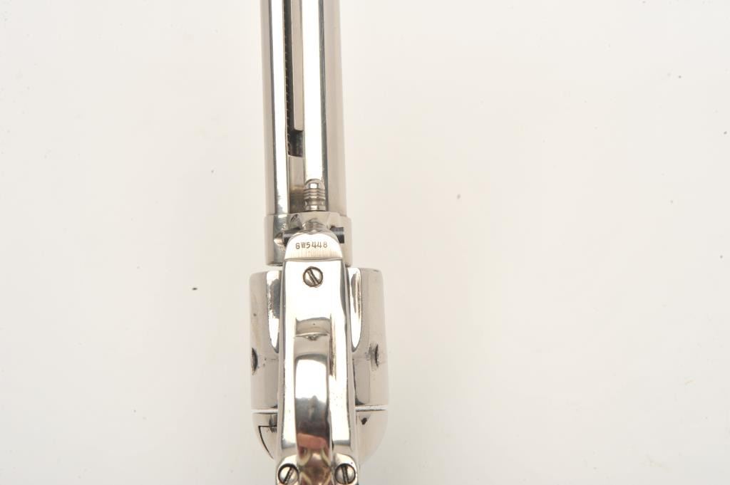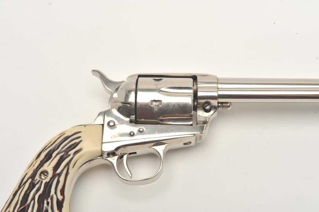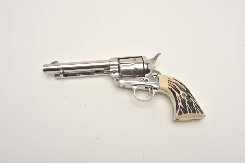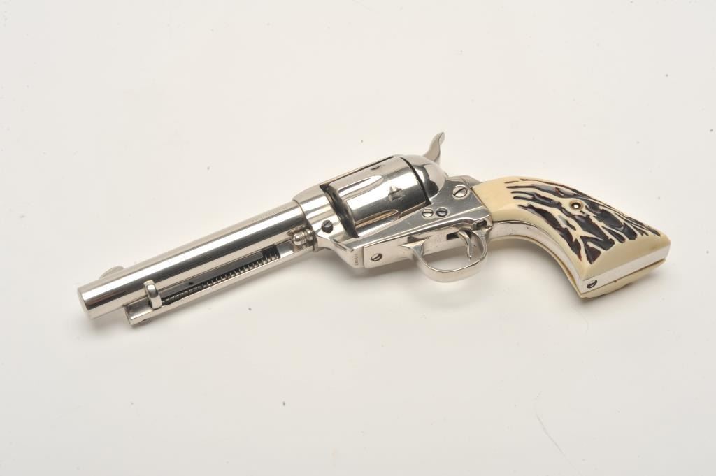 Great Western Arms Co. SAA revolver, .22 caliber, 5.5” barrel, nickel finish, faux stag grips, S/N GW5448, in overall very good to fine condition displaying the majority of its original finish, some light crazing tofinish on cylinder, fine bore, crisp action, sharp markings and fine grips. (Modern/No PPT). Est.: $350-$700.