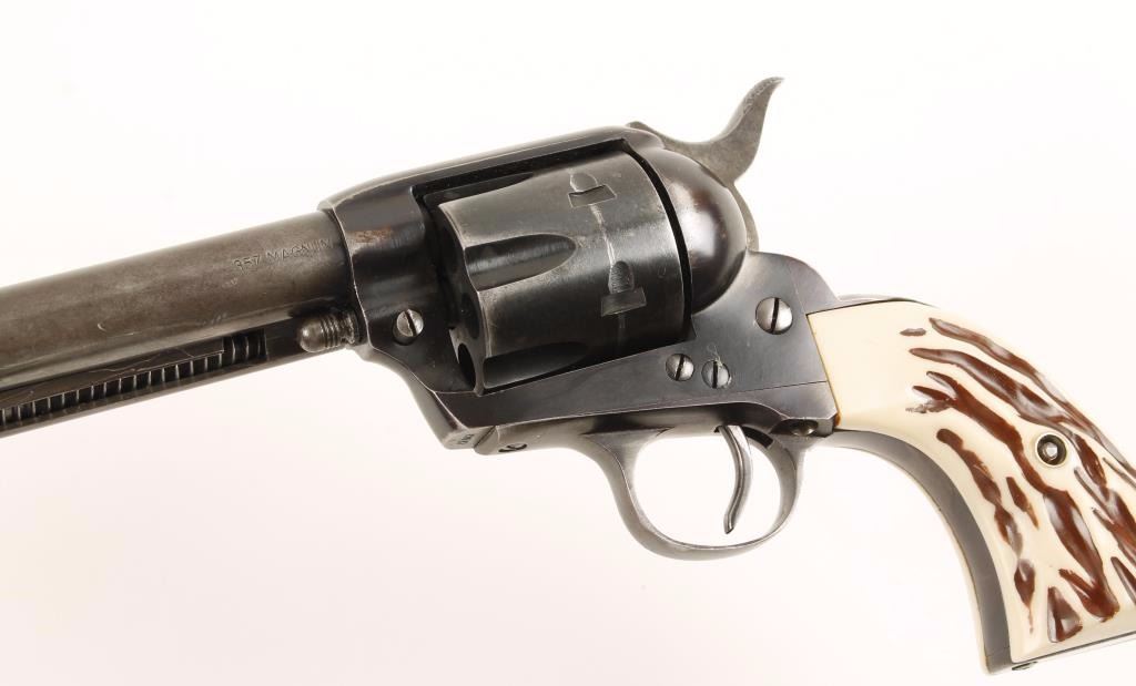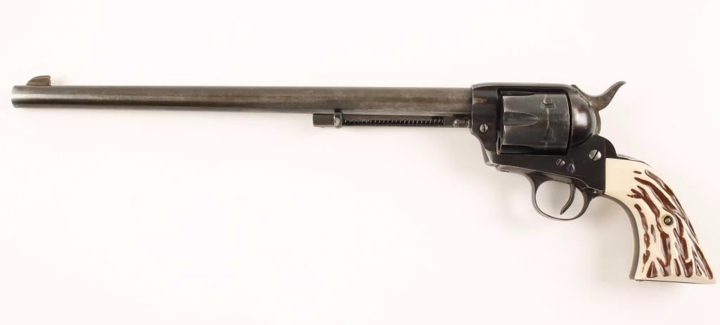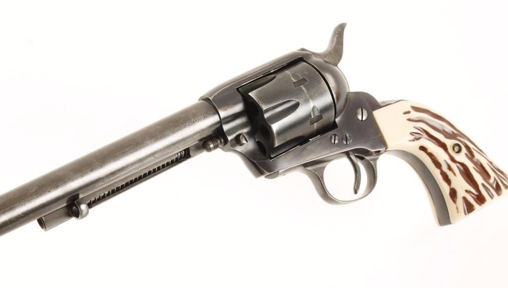 'Buntline' Single action revolver chambered in .357 Magnum, replica of the famous Colt Single Action Buntline. Features a fully blued finish, 12 1/2" barrel, ejector rod, reduced blade front sight, notched rear sight, fluted 6 shot cylinder, checkered hammer spur, and two piece faux stag grips. Finish shows heavy holster or carrying wear, a moderate dragline and overall 60-70% original bluing retained. Condition is very good. ***Modern Firearm***