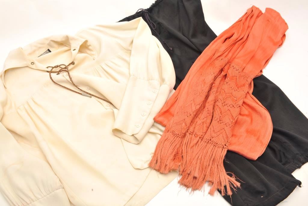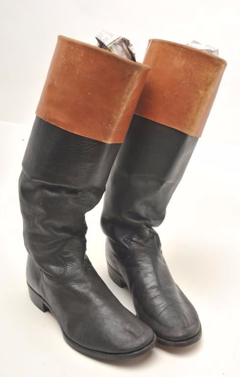 Great pirate costume including a medium size ivory colored shirt, a black pair of knee high pants, an orange waist sash, pair of high top leather boots and a bag of misc. accessory items; ARRRR! Est.:$75-$150.