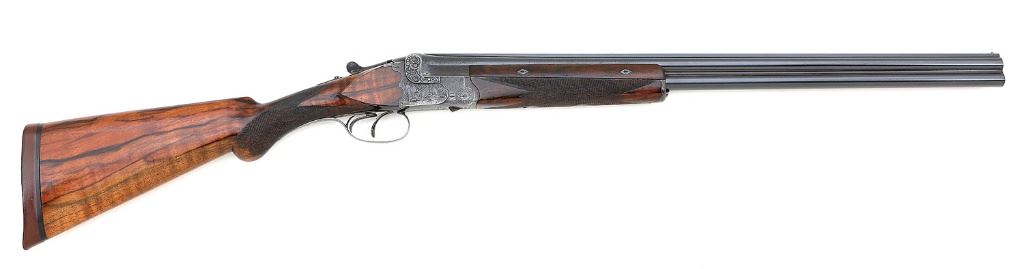serial #30418, 20 ga (2 5/8''), 26'' solid rib Krupp Fluss-stahl barrels choked cylinder and light modified with bright excellent bores. The barrels of this June 1925 proof-dated double retain about 94% original blue showing some scattered mild thinning and a bit of light oxidation staining along the top barrel approaching the breech. The breeches show lovely filigree scrollwork and floral bouquets and the barrels are retailer marked by Von Lengerke & Detmold of New York City. The action retains generous vibrant case-hardened colors throughout under an old protective lacquer, drifting somewhat to a pleasant smoky gray patina, and is embellished in full coverage with very fine filigree scrollwork, chiseled floral bouquets on fences, and very finely executed game scenes of pheasant right and partridge left. The bow of the guard retains fine original bright blue with the tang flaked to gray and ''SAFE'' is inlaid in gold at the upper tang. The checkered walnut pistolgrip buttstock, forend and smooth side panels remain in about very good condition showing some scattered light dings and the most noticeable apology being a moderate 2'' split at the toe. This was caused by lead weights that were added to the buttstock that have since oxidized and expanded, also resulting in the solid red rubber pad warping outward. The wood otherwise exhibits some nice grain figure and there are little diamond horn inlays at the points of the stock flats. Length of pull is about 14 5/8'' with drops of 1 3/4'' and 2 3/4'' and weight is 6 lbs. The gun is sighted with single brass bead and the gun features double triggers and automatic safety. Barrels lock-up solid on-face via double Kersten locks and the action seems to function well mechanically with robust in-time ejectors. A fine quality and attractive German double, intended for the American market with its more desirable 20 gauge chambering rather than the typical German 16. (13D11108-12) {C&R} [Tom Devers Collection] (3000/5000)
