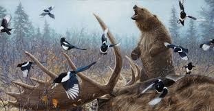 Grizzly roaring in aggravation and driving away the birds that dare flock to the moose he has taken down. The artist describes his work in the following way: “On a recent trip to Northern British Columbia, Canada, near the border of the Yukon, a close friend had a successful morning hunting moose. We had seen sign of bear on this trip but fortunately they kept their distance that morning. I often visualized what it might look like had the winner have been the Grizzly. In any grizzly encounter the terms are always dictated by the Bear!”-John Banovich- John Banovich is one of the most respected and award-winning animal artist in the world and with the Safari Club International. 21” x 40”. www.johnbanovich.com