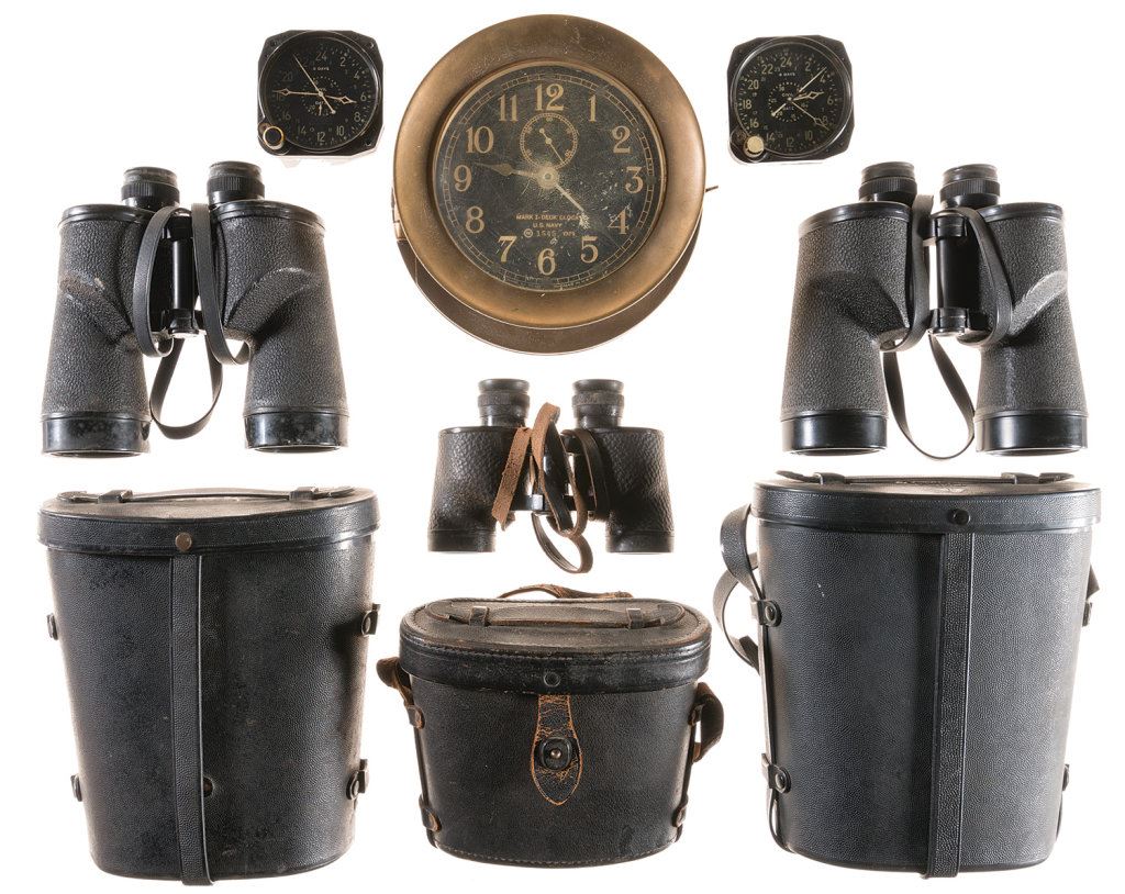 The lot includes: 1) U.S. Navy marked Mark I brass deck clock. Fair showing some oxidation and handling marks, the plastic face is detached and no winding key is included. 2) Two Walthram 8 day aviation clocks. Very good, both clocks function and show general handling marks. 3) U.S.M.C. Mark 46 binoculars with rubber case. Very good with general handling marks and clear optics. 4) U.S. Navy Mark 28 binoculars with rubber case. Very good with general handling marks and clear optics. 5) U.S.M.C. Mark 19 binoculars with leather case. Fine with handling marks and slightly hazy optics.