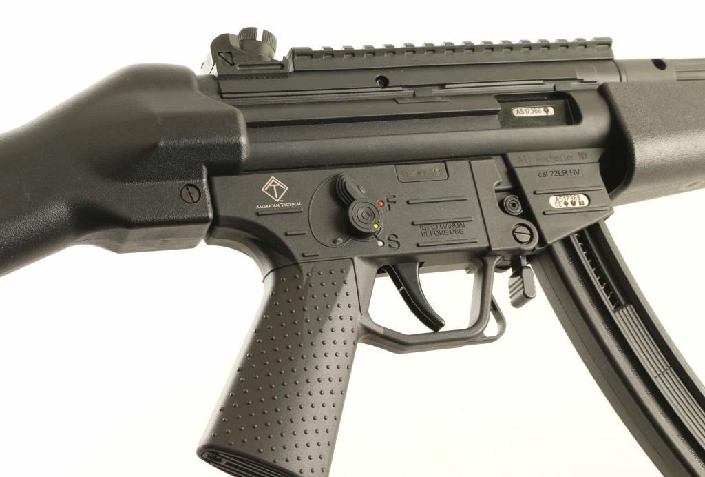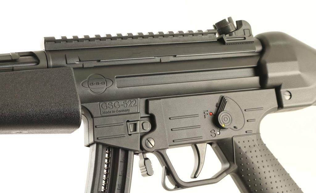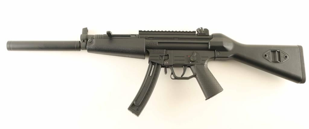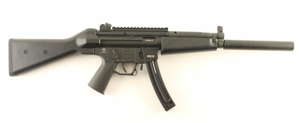 Rifle. Semi-automatic. German made. 2007-present. Imported by ATI, NY. (Left receiver) Blowback action. Styled after the H&K MP5. 9.1" barrel, with rear rotary drum, and hooded post front sight. Picatinney style rail attached Ambidextrous safety. Black polymer stock. Faux suppressor. Bore appears excellent/bright. Metal is near excellent with some very minor scratches. Stock is excellent. Action is crisp/tight. Comes with a GSG 22-rd magazine. NRA Condition-Excellent. Modern Firearm.