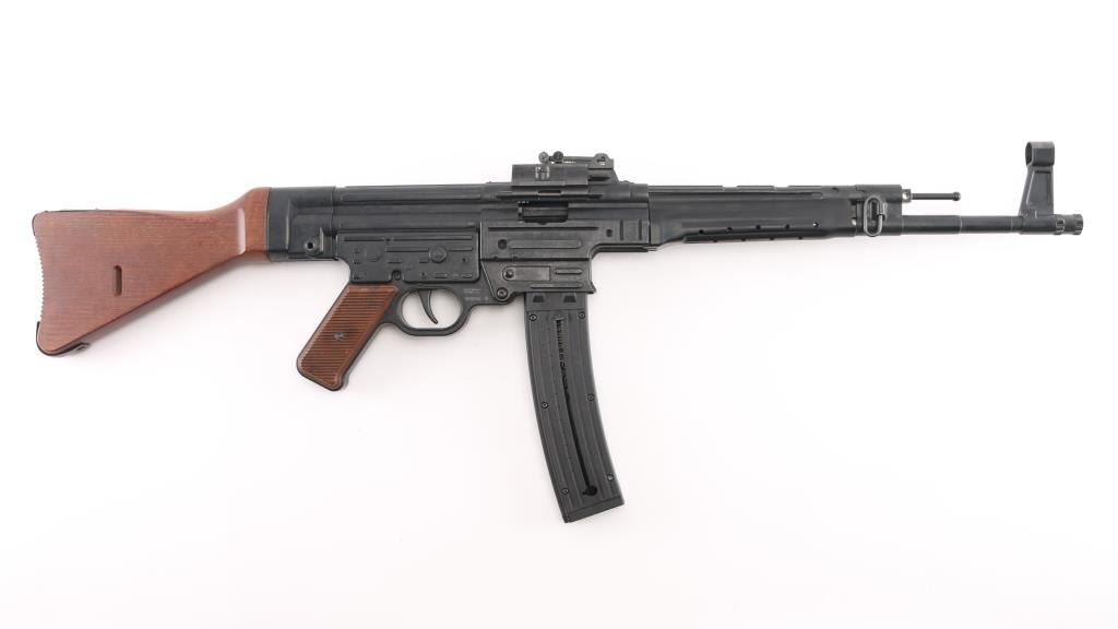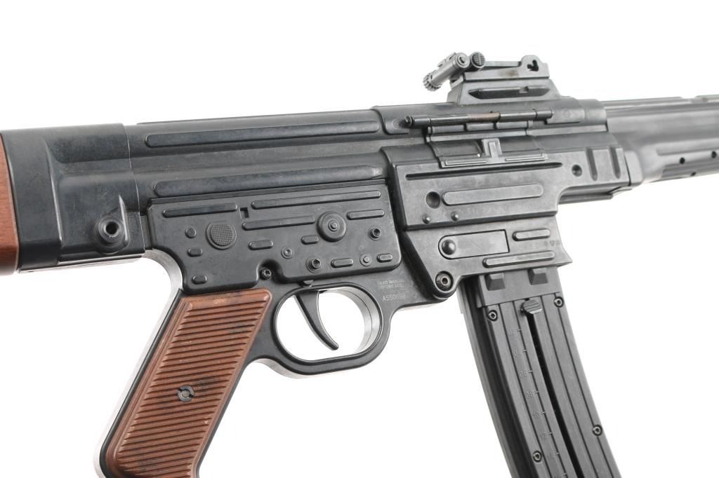 German Sport Guns (GSG) manufactures a variety of . 22 LR semi-automatic replicas designed to look like famous and historical firearms. These replicas are affordably priced and less expensive to shoot than the sometimes expensive or difficult to obtain originals. Features a black finish, 16.25" barrel, raised & hooded blade front sight, tangent rear sight graduated to 1,000 meters, front sling swivel, rear sling slot, manual safety selector on the left side of the grip frame, dust cover, stacking rod, cylindrical charging handle with flared tip, push button magazine release, factory 25 round magazine, grooved brown synthetic pistol grip and smooth wood shoulder stock with trapdoor & serrated bare butt. Overall condition is like new with few handling marks. Includes one magazine. Condition is NRA Excellent - like new *** Modern Firearm ***