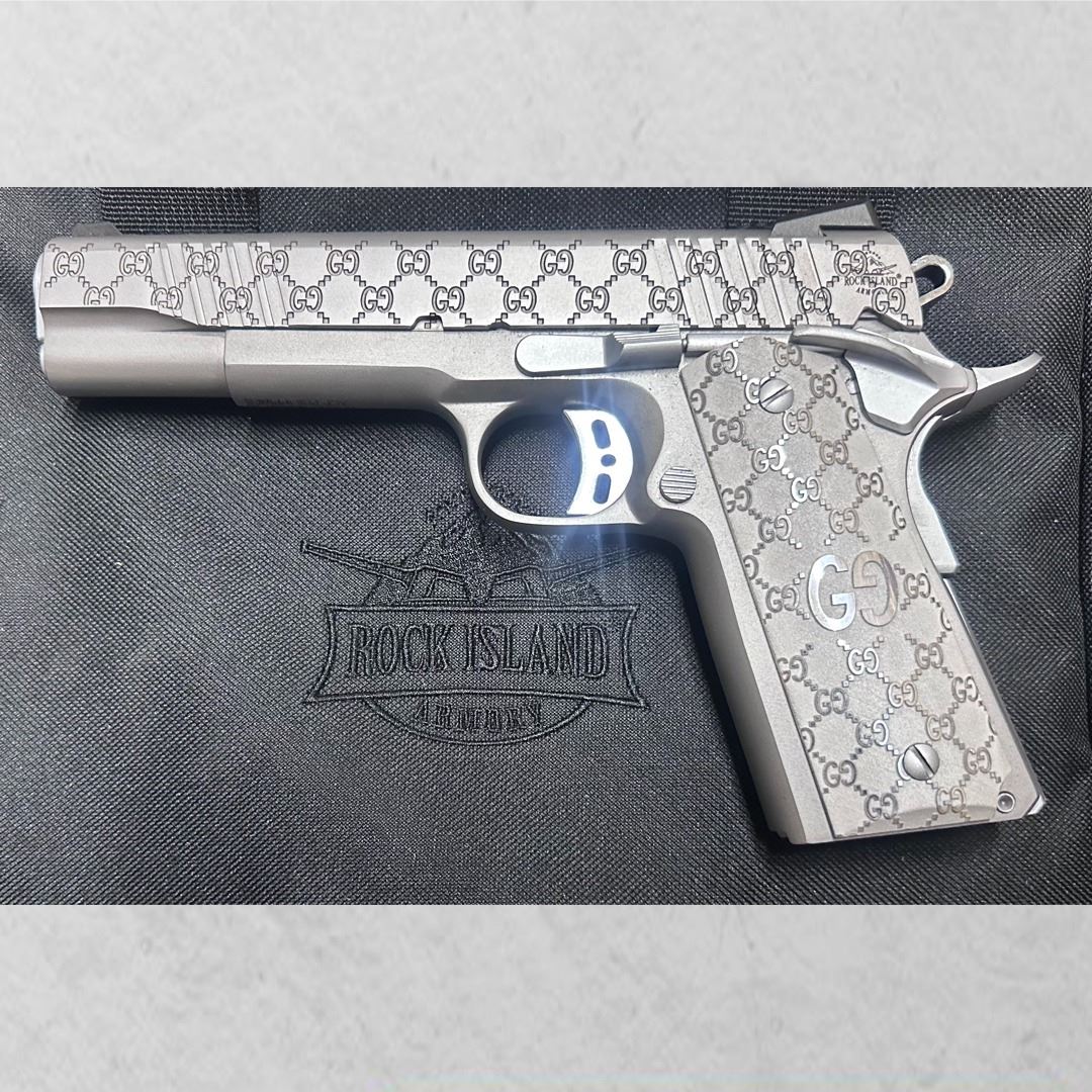 This is the second in a pair of stylish handguns offered this evening! Stylish but effective, this Rock Island Armory 1911 pistol in .45 ACP with patented Gucci cerakote finish has it all. While the 1911 is among the most iconic American firearms ever produced, here it is decked out with the Gucci theme which is a world-renowned symbol of excellence, creativity, and innovative design. Express your individuality by showing up at the range with your Gucci handgun, letting people know your respect for high quality, unique designs, and luxury goods.
