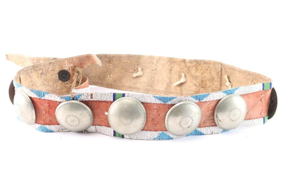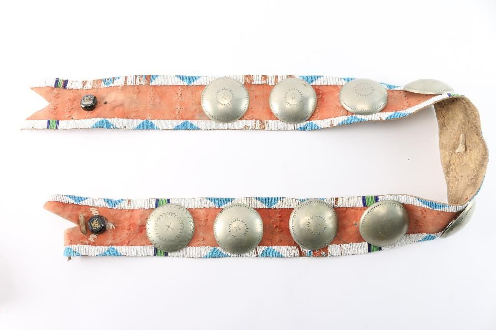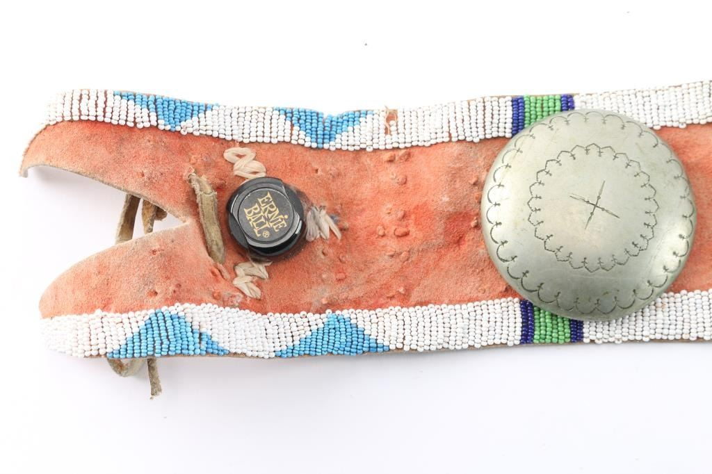 Ten early Kiowa tribe conchos on beaded leather custom guitar strap. Measures 53". Missing portions of beadwork.