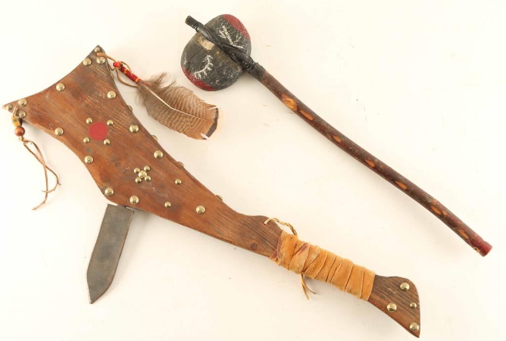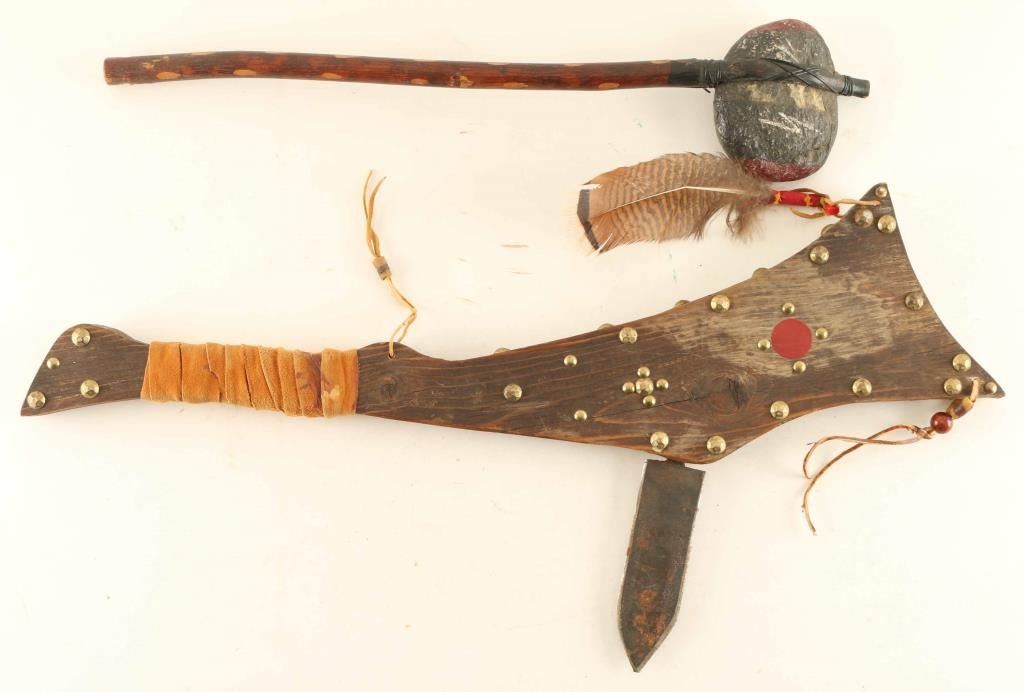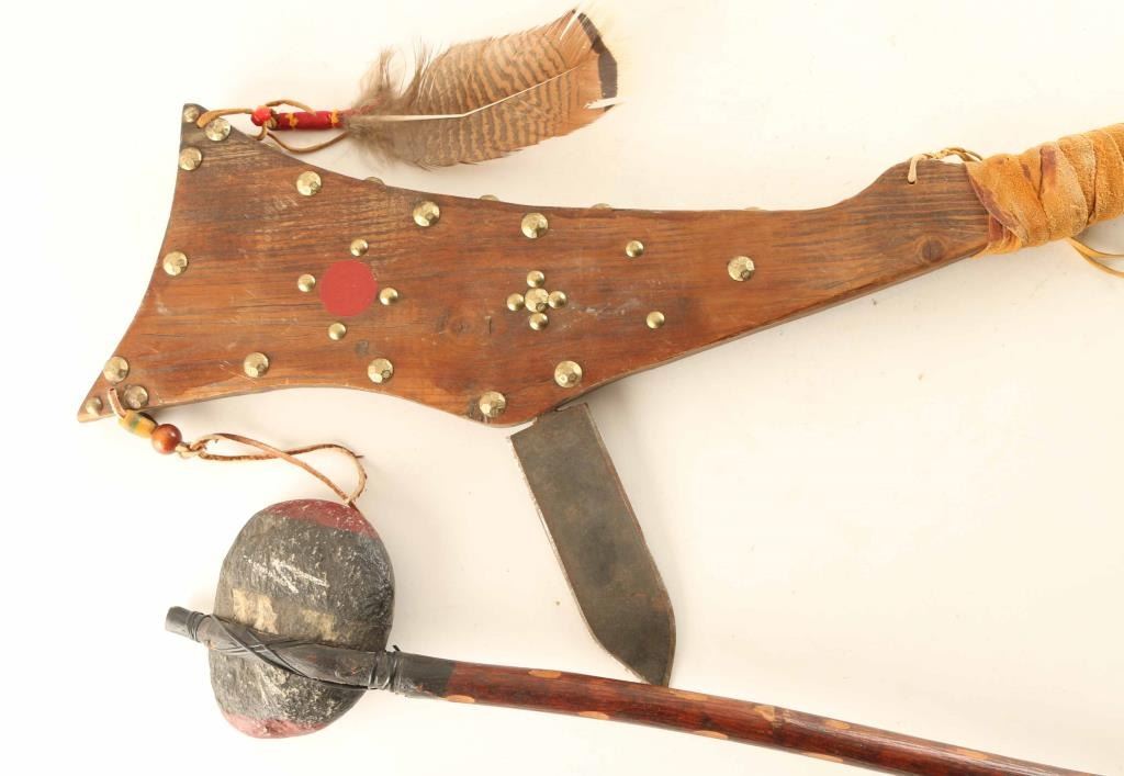 Includes a beautiful gunstock war club in very good condition, shows age, measures 22" and the stone club measures 19".