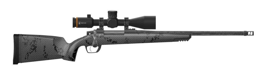Gunwerks Magnus MTX rifle system in 7 mm PRC. It has a right hand, titanium action, 20 inch carbon wrapped barrel with a directional brake and a metal finish of graphite (black). The stock is Carbon Black with a Gunwerks floorplate and a 13.5 inch length of pull. The rifle is topped with a Revic Acura RS25i 5-25x50 rifle scope with a ballistic turret for Gunwerks 7mm 180gr Berger Hybrid loads.