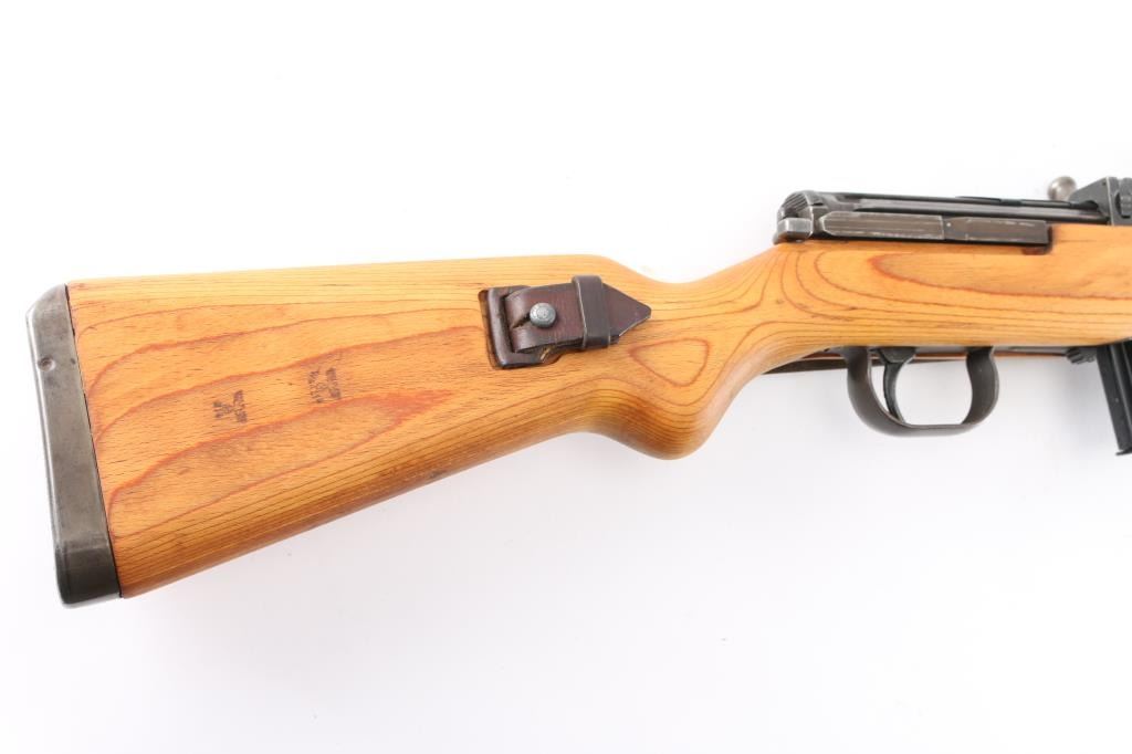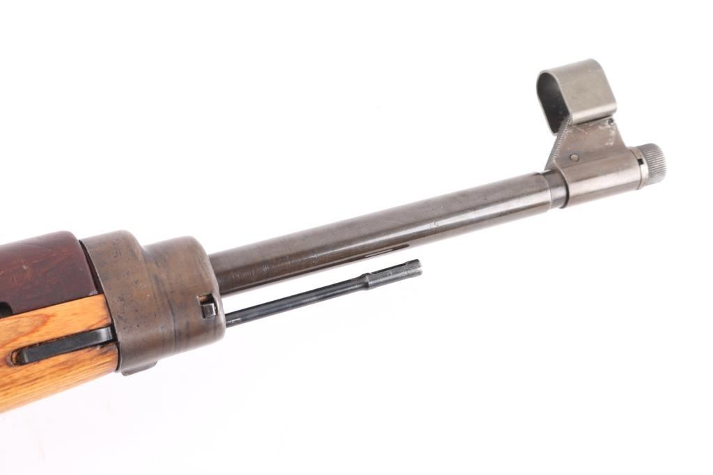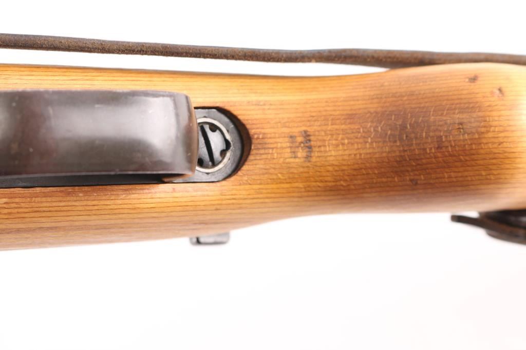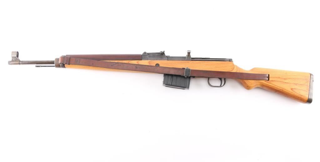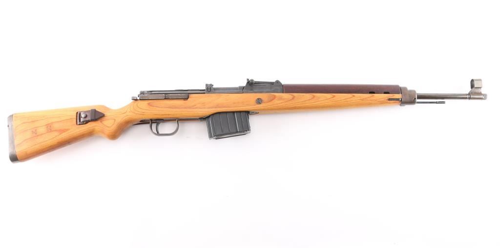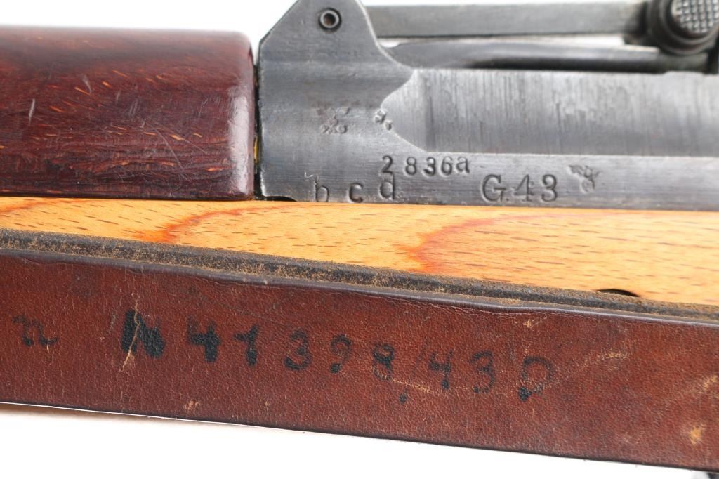 Rarest of makers. German WW2 semi-automatic military issued rifle. 10-rd detachable box magazine. Gas-operated short-stroke piston, flapper locking. 21.5" barrel. Produced 1943-45 with a total of 402,713 made. Threaded muzzle with removable nut for blank adapter. Hooded serrated ramp front blade and tangent rear sights. Rough milled receiver, and bolt carrier. Serrated bolt hold open lever to the right of the charging handle locks/releases the bolt. Left side of the receiver stamped "G.43 "bcd" Eagle proof. Small waffenamt . Serial numbers: "2836a" on receiver, "6635a" on bolt carrier, "4829" on bolt, "1178" on firing pin & "4000g" on stock. "[eagle]/WaAA44" stamped on bolt housing. Two large waffenamts Eagle/214 stamped on stock, one small Eagle WaA214 behind triggerguard. "V" in circle stamped on rear sight. Bore is very good with strong rifling. Blued metal finish is very good with some minor scratches/edge wear. Blonde laminated wood stock, and handguard are very good with a few minor scratches/dings and 1" hairline crack extending from the scope rail cutout. Cupped steel buttplate is hinged for cleaning gear has some minor pitting. Cleaning rod present. Action is crisp/tight. One blue 10-rd magazine marked "gcb", "WaAB92", & "K43". Period brown leather sling marked "H. Baran" & "N41398/43D" in marker.