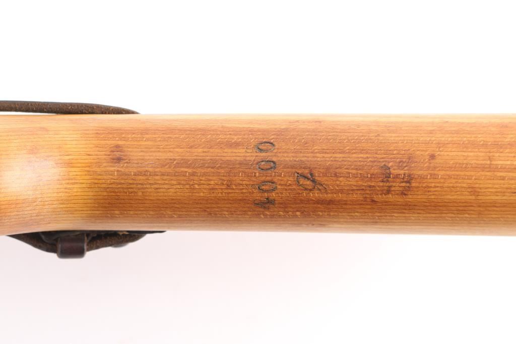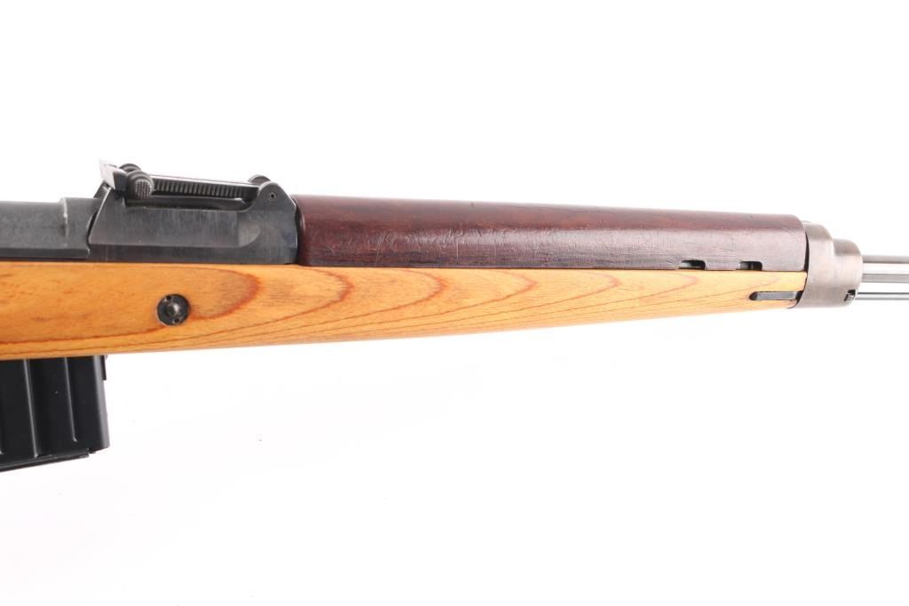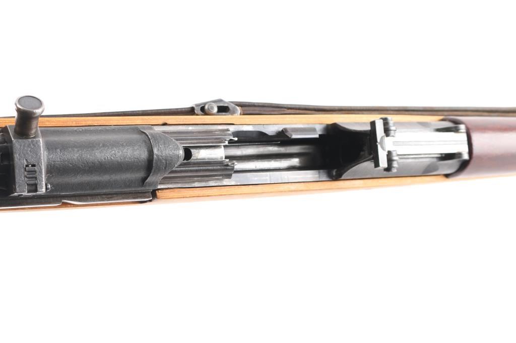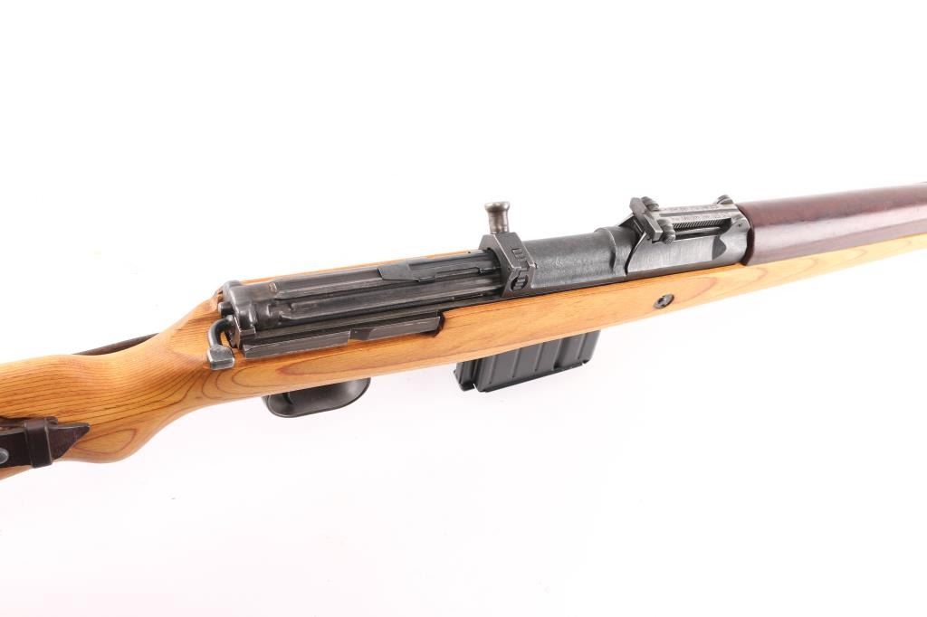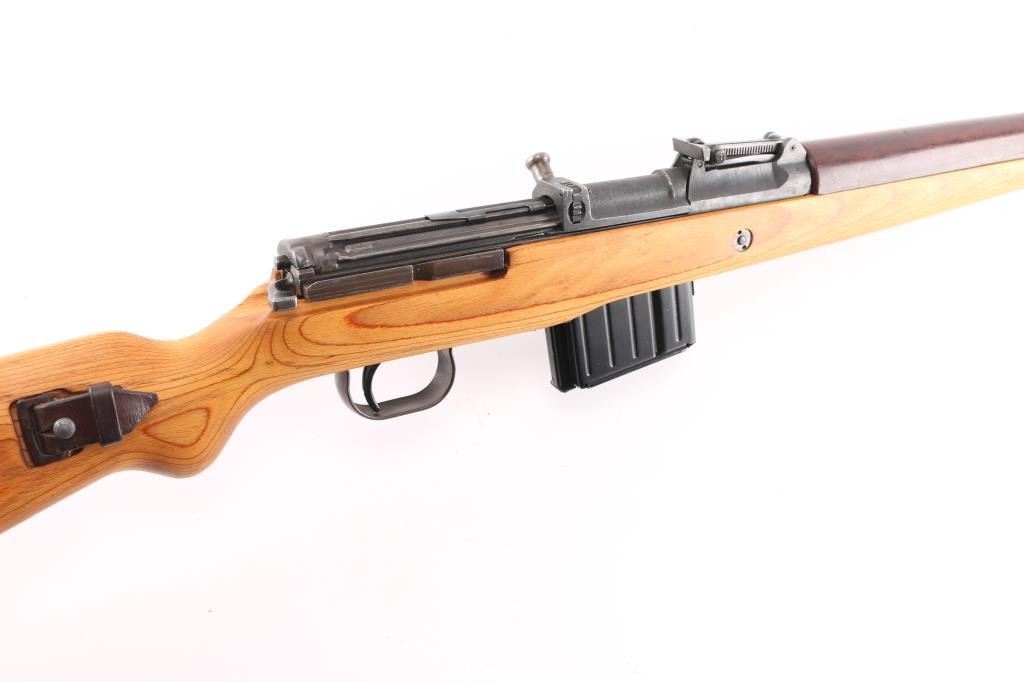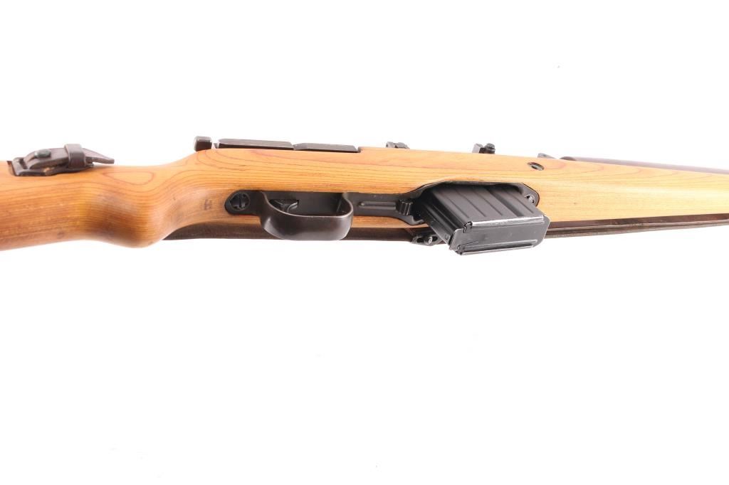 Rarest of makers. German WW2 semi-automatic military issued rifle. 10-rd detachable box magazine. Gas-operated short-stroke piston, flapper locking. 21.5" barrel. Produced 1943-45 with a total of 402,713 made. Threaded muzzle with removable nut for blank adapter. Hooded serrated ramp front blade and tangent rear sights. Rough milled receiver, and bolt carrier. Serrated bolt hold open lever to the right of the charging handle locks/releases the bolt. Left side of the receiver stamped "G.43 "bcd" Eagle proof. Small waffenamt . Serial numbers: "2836a" on receiver, "6635a" on bolt carrier, "4829" on bolt, "1178" on firing pin & "4000g" on stock. "[eagle]/WaAA44" stamped on bolt housing. Two large waffenamts Eagle/214 stamped on stock, one small Eagle WaA214 behind triggerguard. "V" in circle stamped on rear sight. Bore is very good with strong rifling. Blued metal finish is very good with some minor scratches/edge wear. Blonde laminated wood stock, and handguard are very good with a few minor scratches/dings and 1" hairline crack extending from the scope rail cutout. Cupped steel buttplate is hinged for cleaning gear has some minor pitting. Cleaning rod present. Action is crisp/tight. One blue 10-rd magazine marked "gcb", "WaAB92", & "K43". Period brown leather sling marked "H. Baran" & "N41398/43D" in marker.