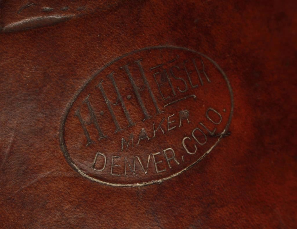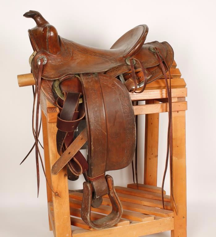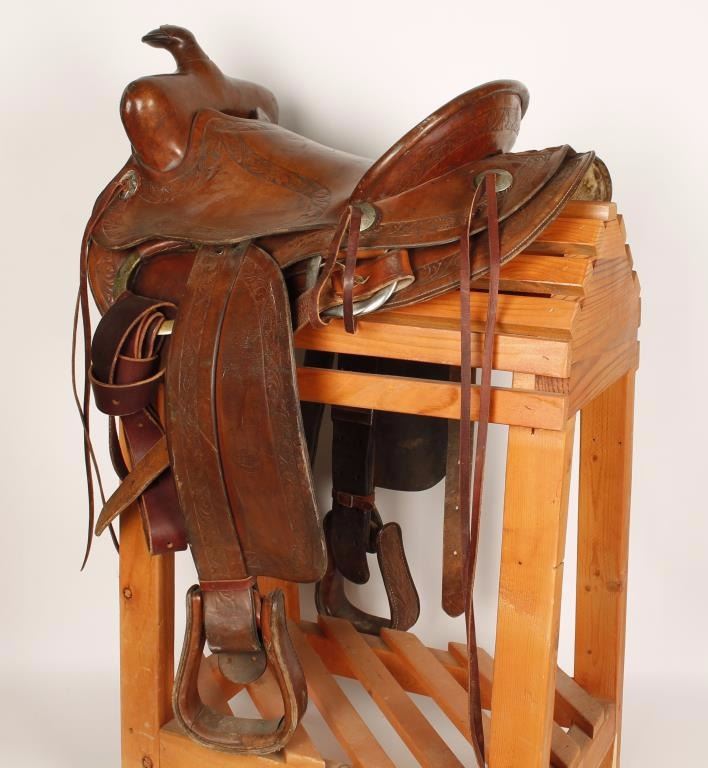 Brown leather with floral design, maker marked three times. Nickel star conchos, seat measures 15".