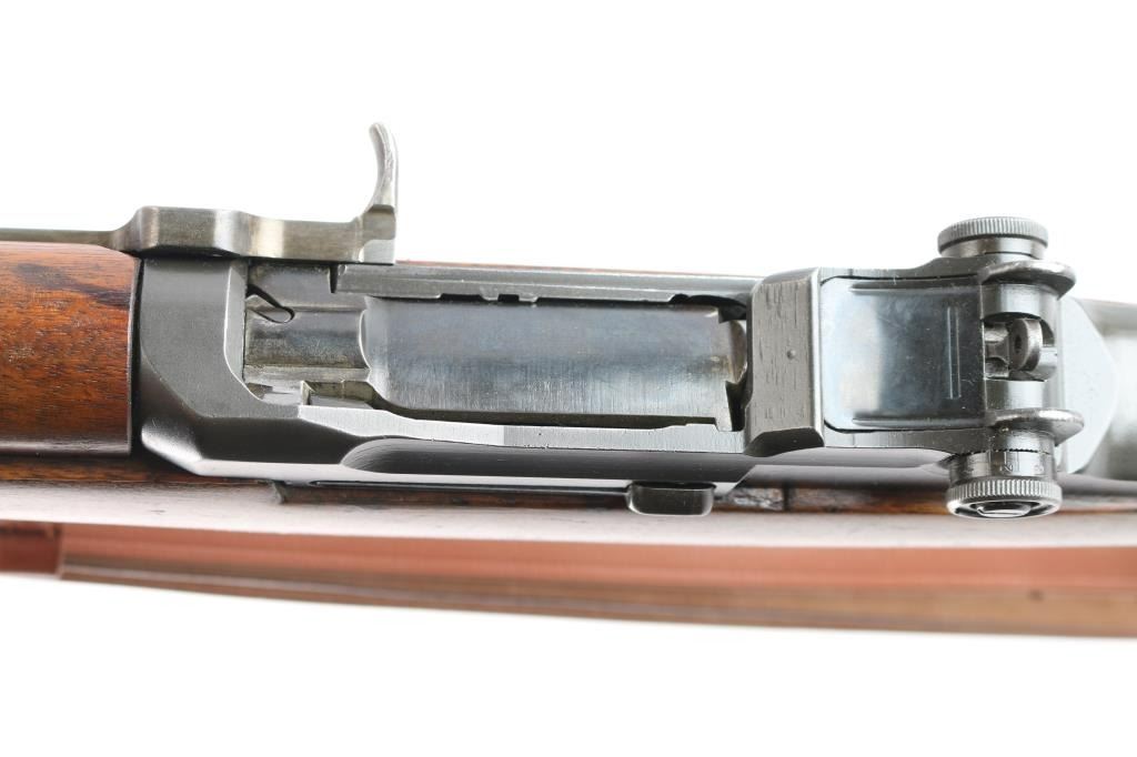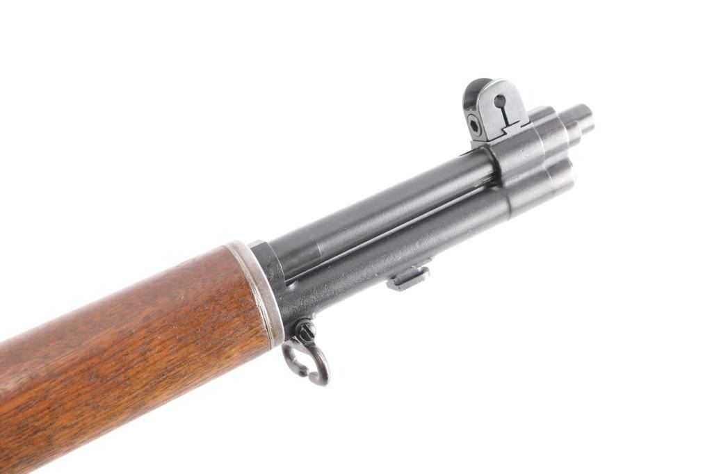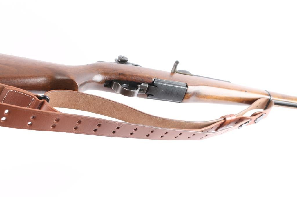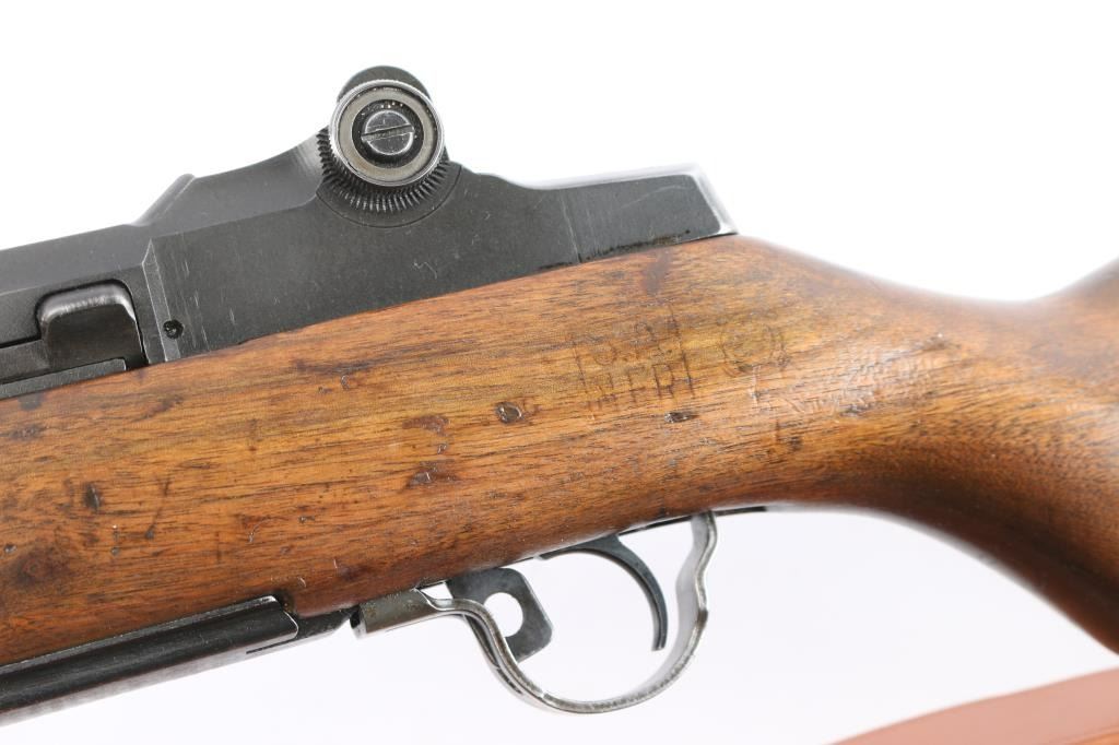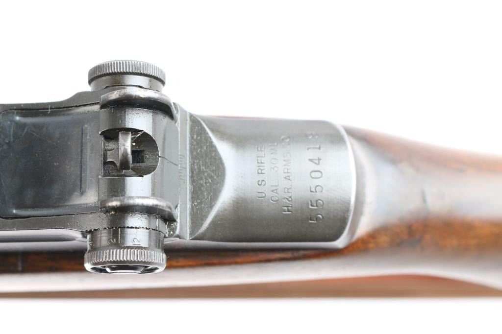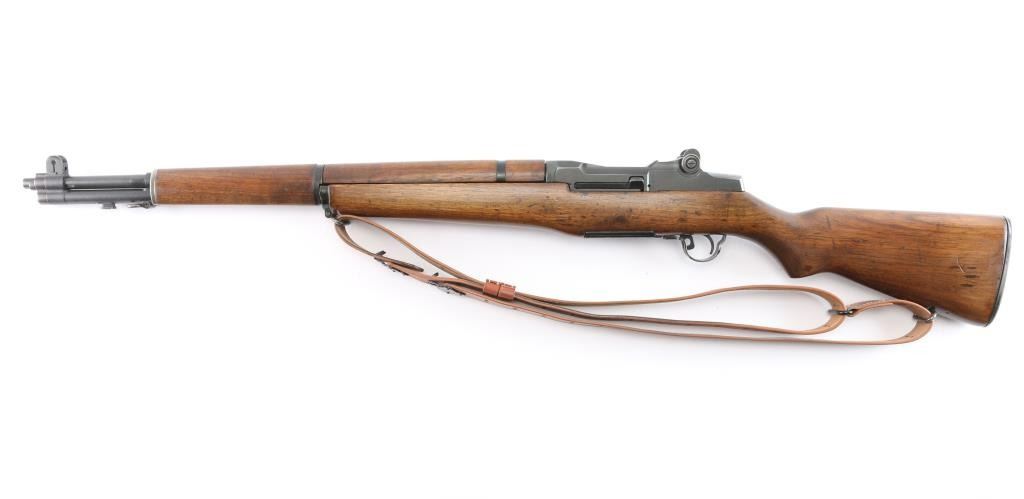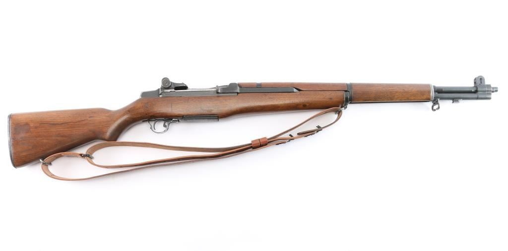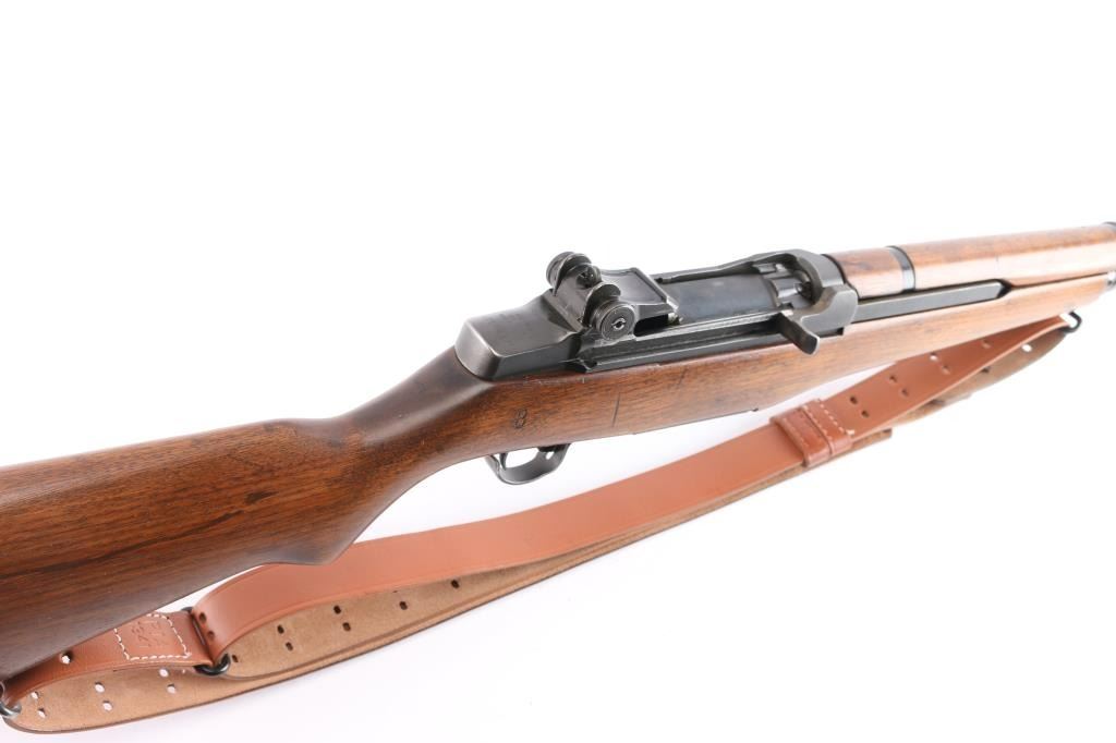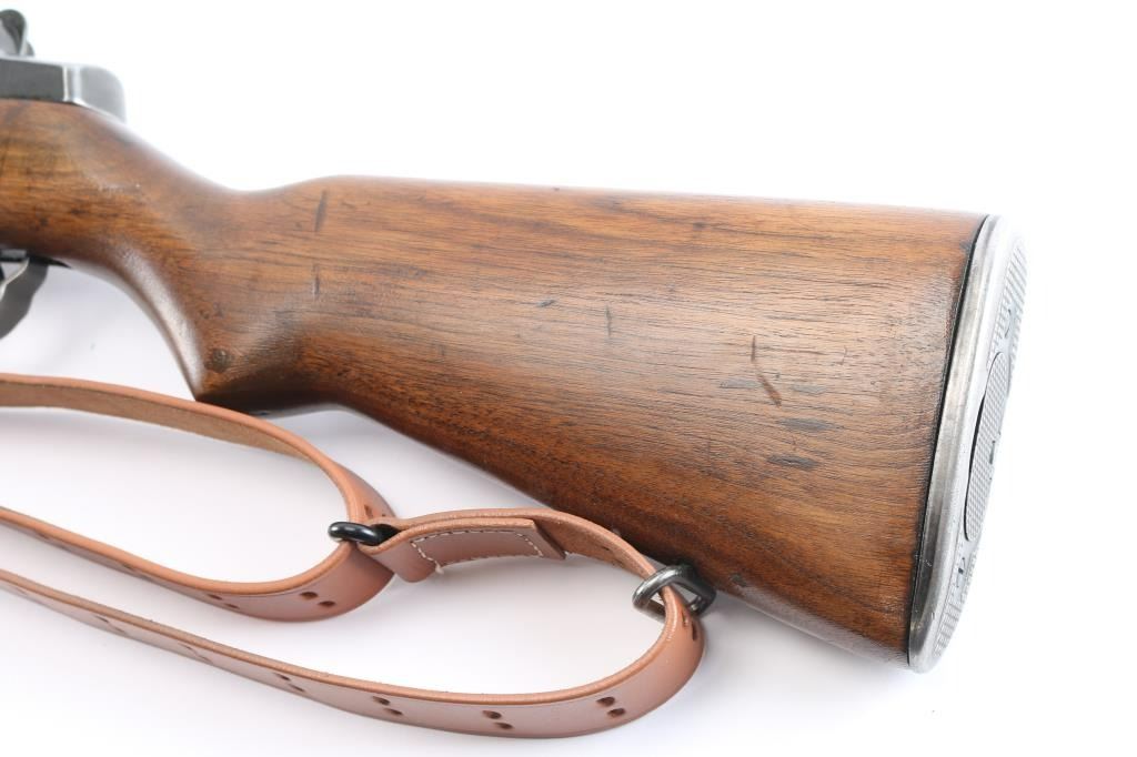 US military semi-automatic rifle, manufactured circa 1954. The workhorse rifle of the US military in WWII and beyond.. Features parkerized finish, wood stock & hand guards, 24" barrel, adjustable sights with protected front blade & protected rear peep, fixed magazine for en-bloc clip, manual safety. Trigger guard has stamped style trigger guard. Barrel marked "HRA 6535448 10-54 RS40". Bolt markings removed. Rear sight marked "DRC". "HRA" observed on trigger housing, hammer, safety. Bore is shiny/bright. Various metal parts show different shades of parkerized finish, 85% coverage, with edge losses and rubbing wear. The wood is very good condition, sanded and tung oil type finish, with scratches and gouges, "P" in circle on bottom of wrist, stamped "8" forward of wrist on right side. Includes replica leather sling, M1917 type, marked "RIA 1941".