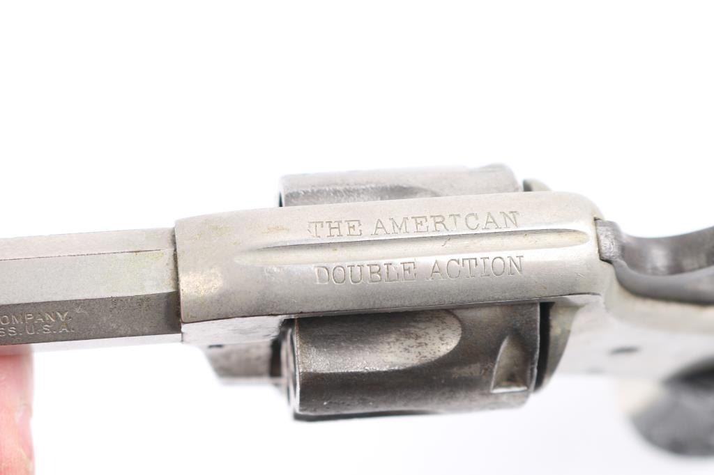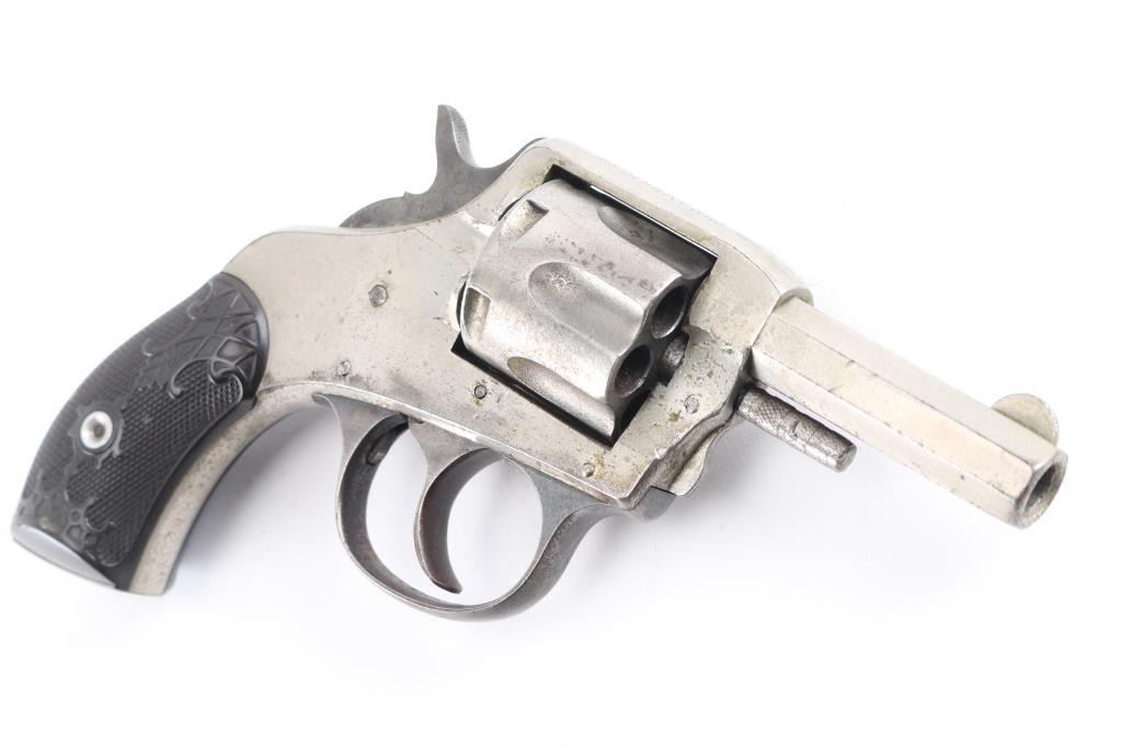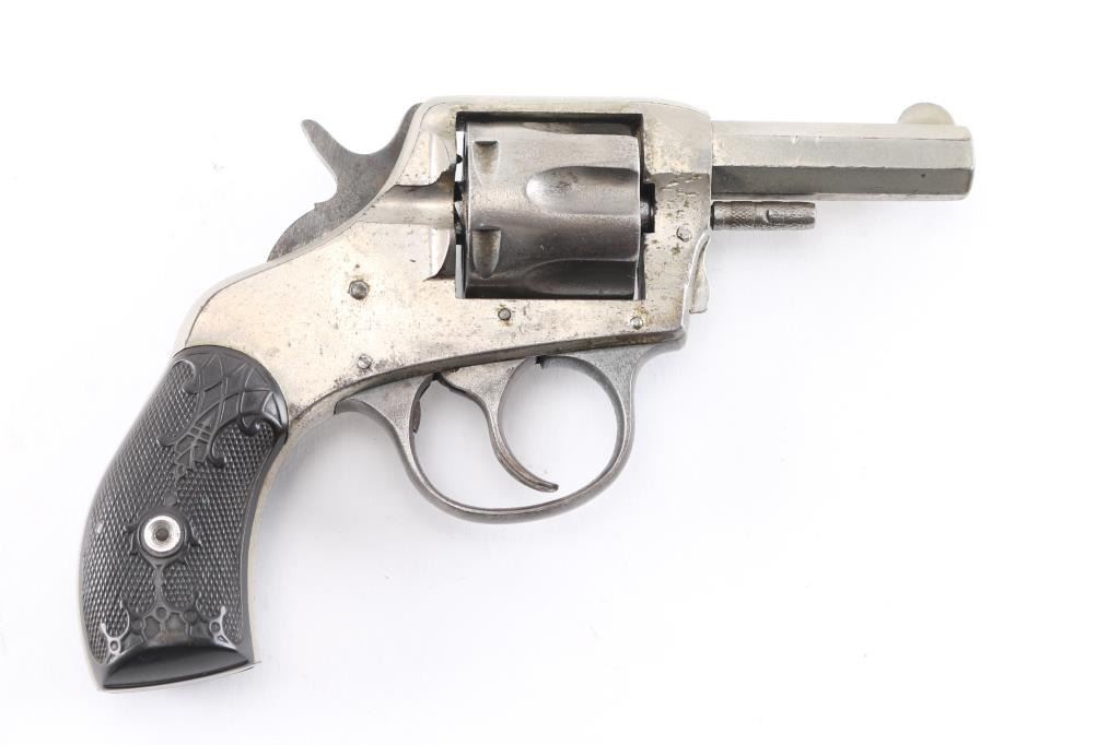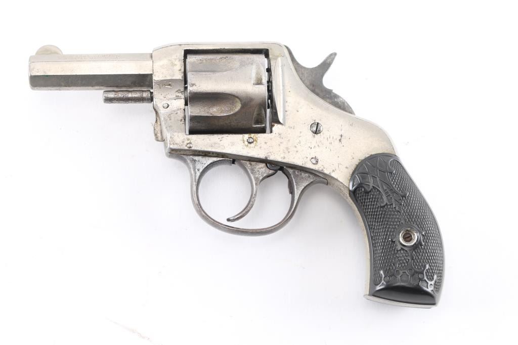 Note* Parts/repair gun, main spring is broken. Double/single action 6 shot revolver chambered in .32 S&W caliber circa 1905-1942. Half moon blade front sight, checkered cylinder rod and hammer spur, smooth trigger, nickel finish, blue triggerguard with checkered black hard rubber grips and 2 1/2" octagonal barrel. Retains about 85% of its finish with handling wear, scattered light patina. Hammer does not cock, cylinder locks up when hammer is held back. Circa 1910s.Condition is NRA Fair. C&R Firearm.