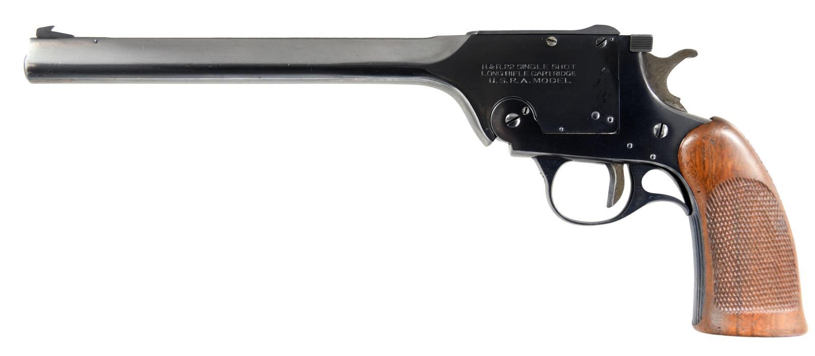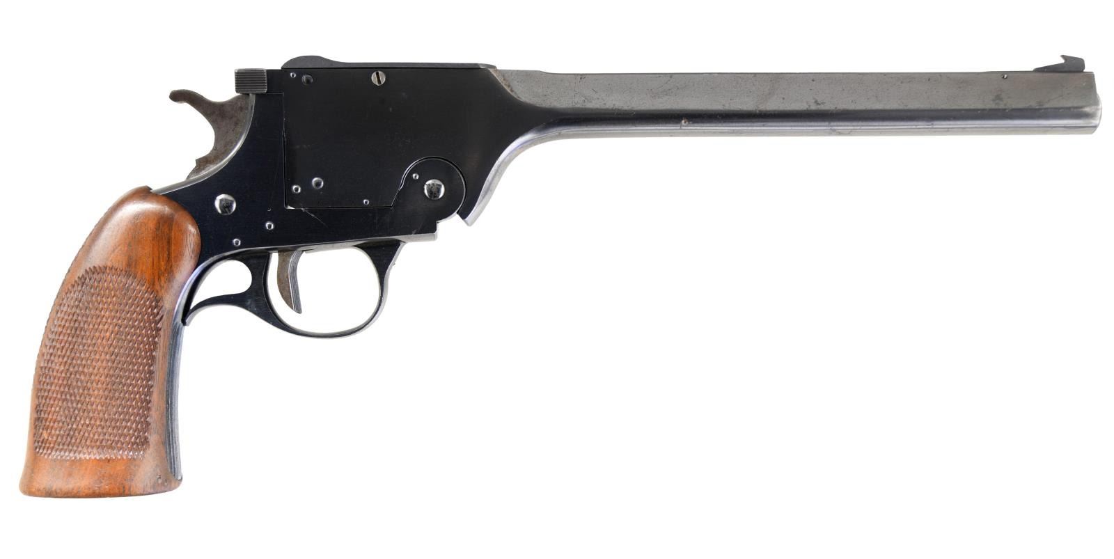 Cal. 22 LR. S# 2297. Bbl. 10". Adjustable front & rear sights, blued finish, automatic ejector, grooved trigger & one piece checkered walnut grips. CONDITION: metal retains about 92% original finish w/ high edge wear & some finish loss on the bottom of the Bbl. Grips show strong checkering w/ numerous fine impact marks on the base. Bore is very good, bright & strongly rifled. (23-764/CW). CURIO. $700-1,000.