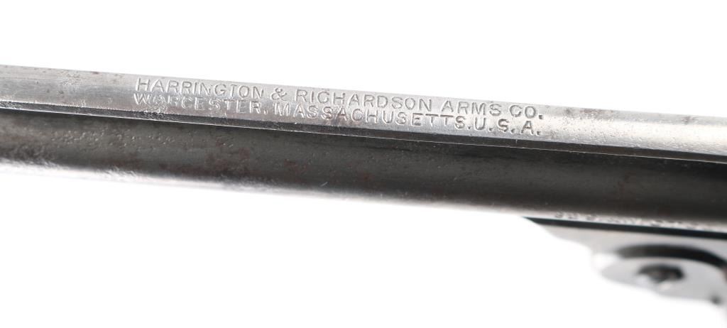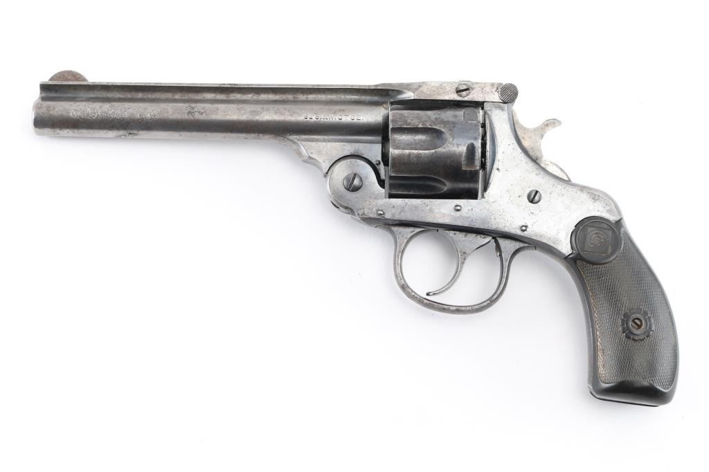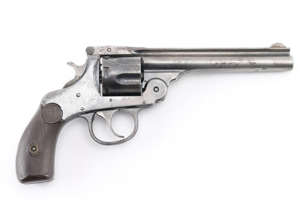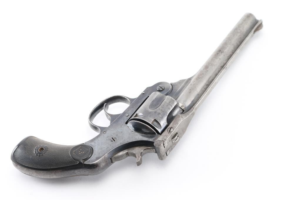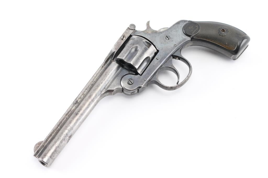 Vintage single action top-break revolver chambered in .32 Smith & Wesson Long. Features a blued finish, 5" ribbed barrel, fixed round blade front sight, shallow square notch rear sight cut into the top of the "T" shaped barrel latch, smooth trigger, knurled hammer spur, fluted six-shot cylinder, automatic ejector, round butt frame and two-piece checkered black hard rubber grips with target insignias. Matching serial numbers are found on grip frame, butt, cylinder, extractor star. Revolver retains approximately 50% original bluing mostly on the frame, showing small amounts of pitting on the left barrel, barrel is mostly gray. Action is crisp/tight, bore is fair to good with some small areas of light pitting. Condition is NRA Good. C&R firearm.