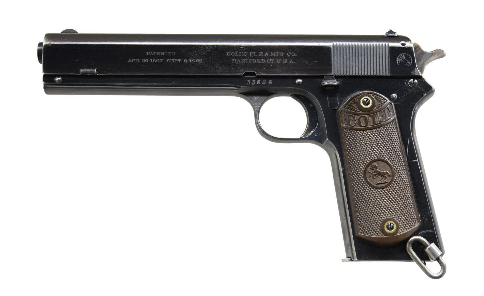 Cal. 38 Rimless. S# 33646. Bbl. 6". Standard production w/ serrations at rear of slide. Semi-circular front sight w/ U notch rear sight. Blue finish w/ case colored hammer. 2 piece checkered hard rubber rampant colt grips. Left side of grip frame has lanyard ring. Mfg. 1911. MAGS: 1 detachable 8 rd. CONDITION: high condition pistol retaining over 95% blue showing light muzzle & carry wear w/ scattered scratches. Grips show light wear. Bore retains strong rifling. (24-952/DS). CURIO. $3,750-4,500.