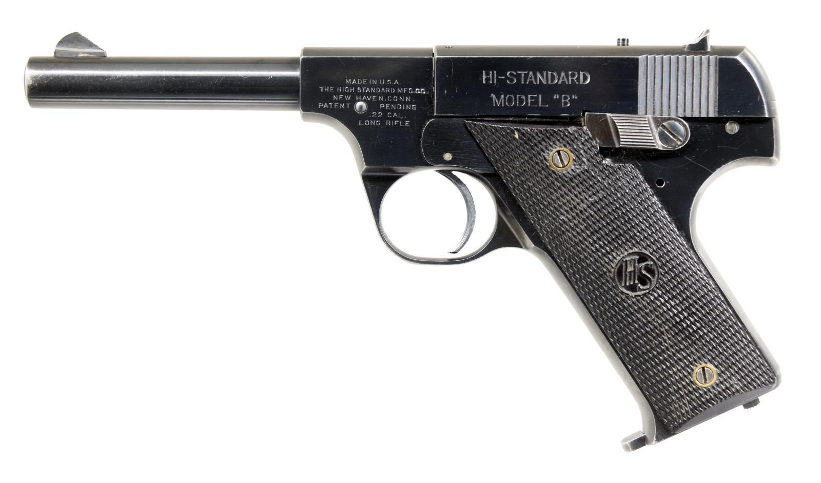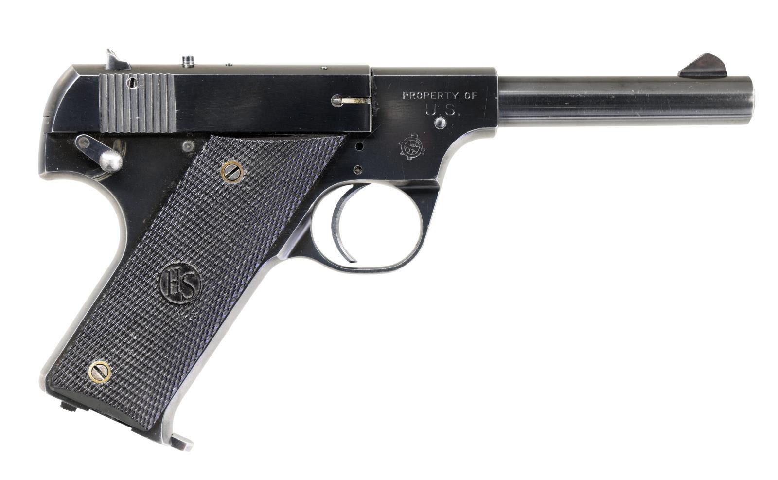Cal 22 LR. S# 104543. Bbl. 4 1/2". Serrated ramp front & fixed notch rear sights. “PROPERTY OF US” atop Bbl. & right side of frame above Ordnance crossed cannon. Blued finish & checkered “HS” monogramed hard rubber grips. MAGS: 1-10 rd. unmarked. CONDITION: metal retains about 90% original blue w/ scattered light dings, marks & scratches. Grips show light chipping & a few broken points. Bore is very good plus, bright & strongly rifled. (23-900/CW). CURIO. $500-750.
