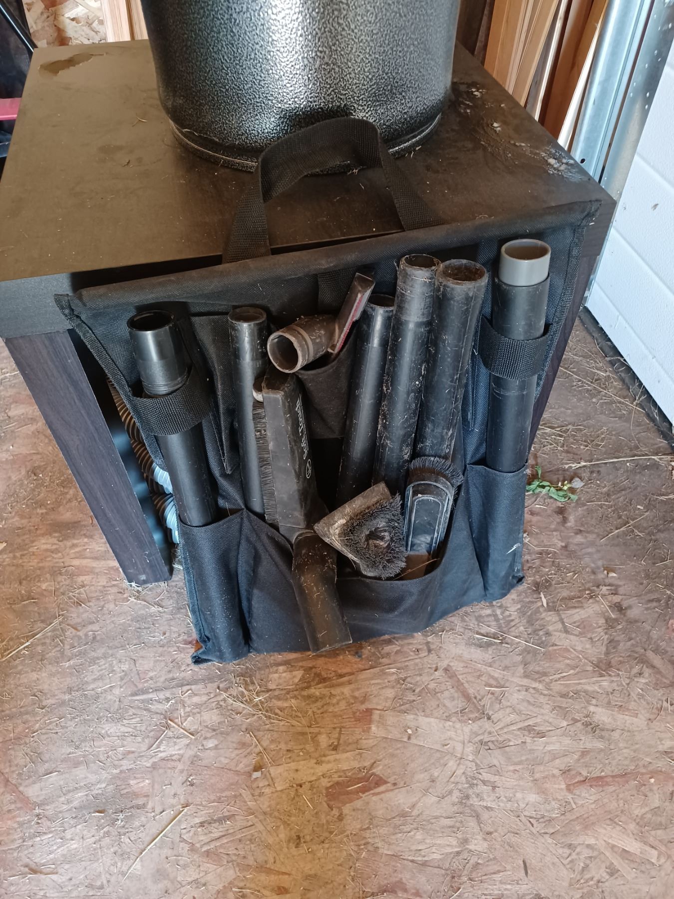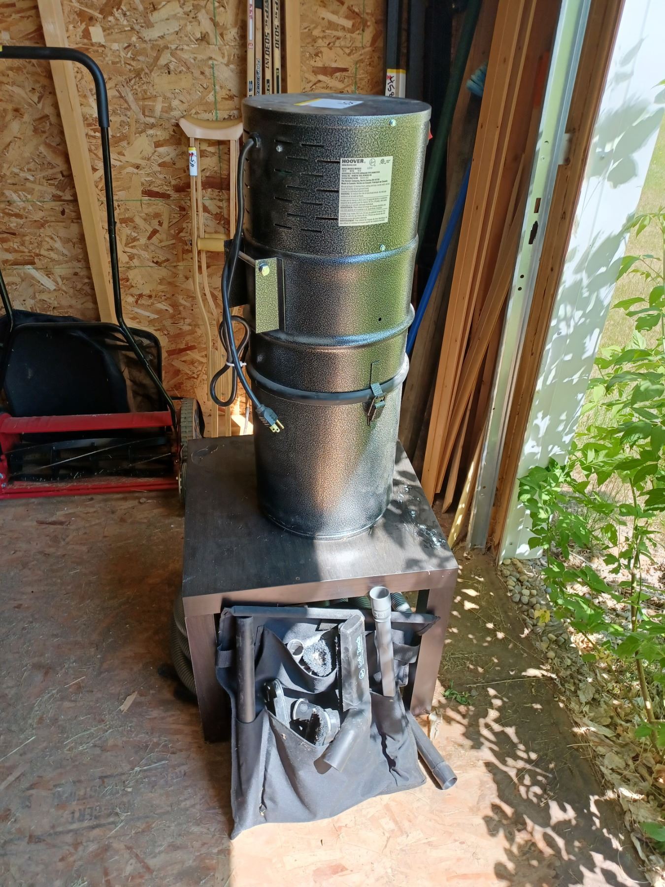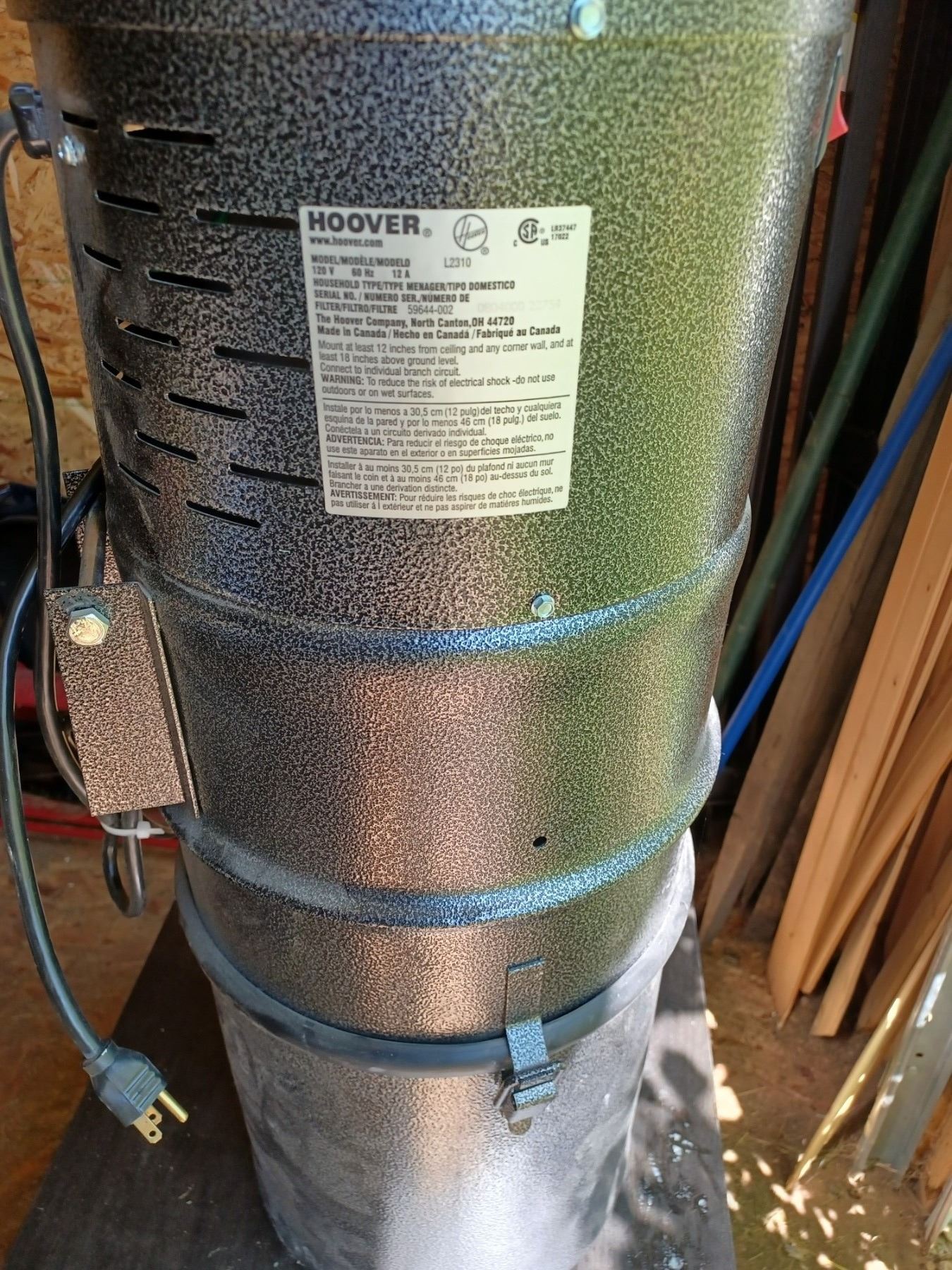 "HOOVER" L2310 GUV (GARAGE UTILITY VAC. 120 V) C/W MOUNTABLE CANNISTER S/N: 0804000 22754 Incl: 30FT. HOSE W/ 7 EXTENSIONS +PLUS+ 8 VACUUM ACCESS.
