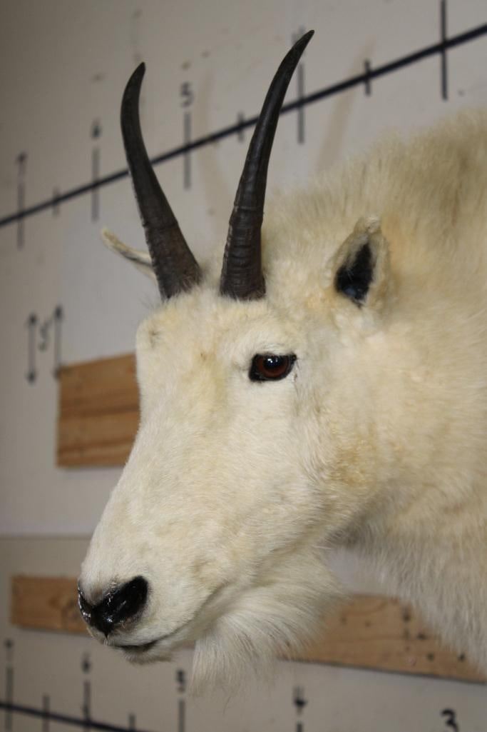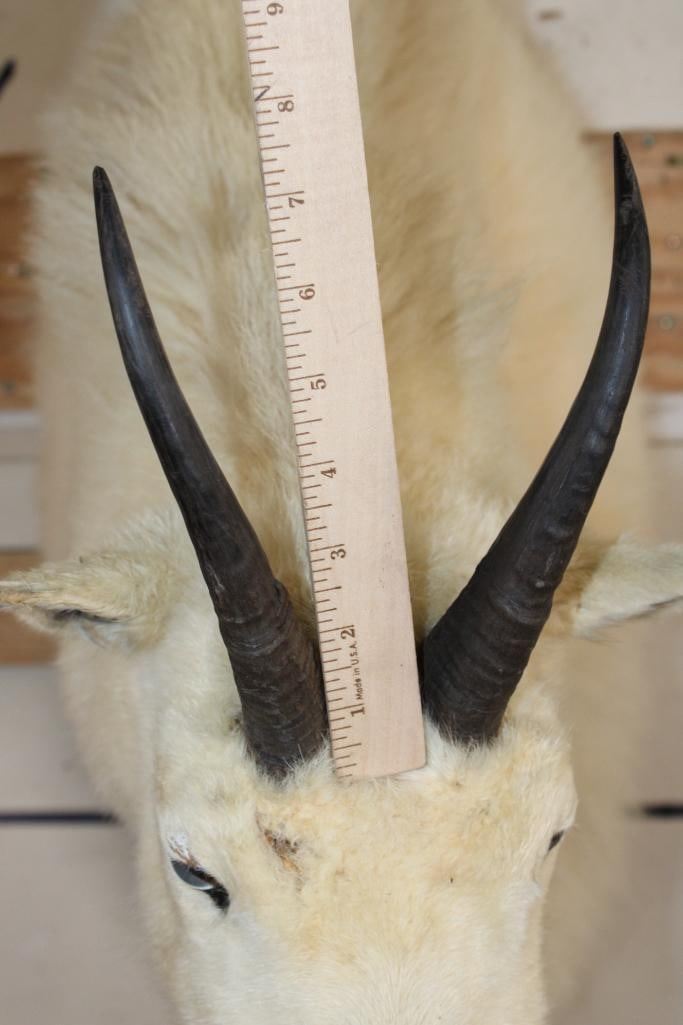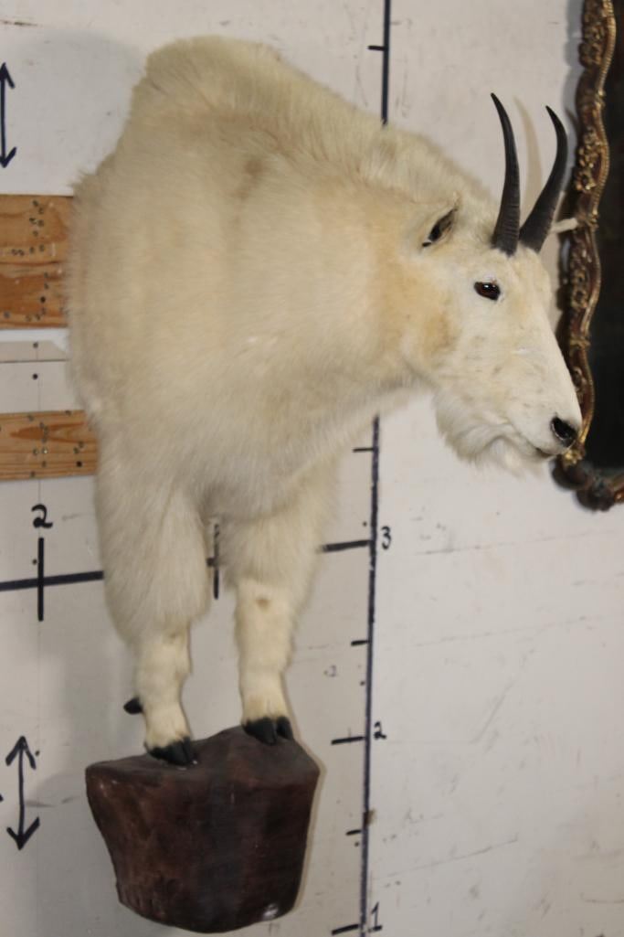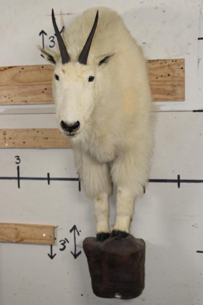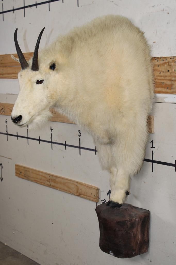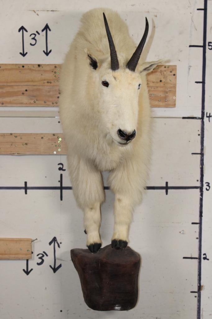 Half Body MOUNTAIN GOAT on a simulated Rock Wall Hanging Base. The Left Horn measures 8.25" Long and the Right Horn measures 8" Long. The Total Mount measures 4' Tall x 13" Wide x 30" Depth. TAXIDERMY