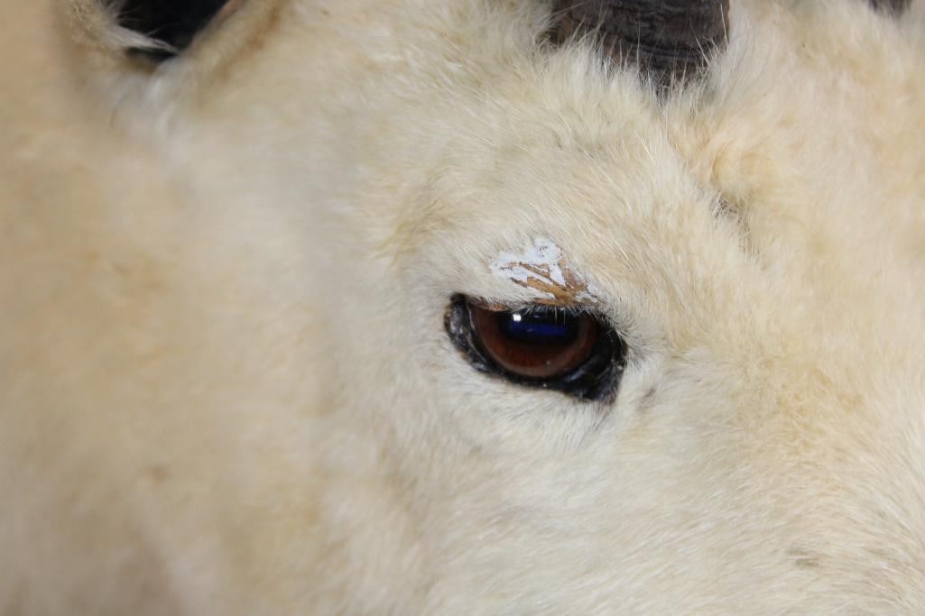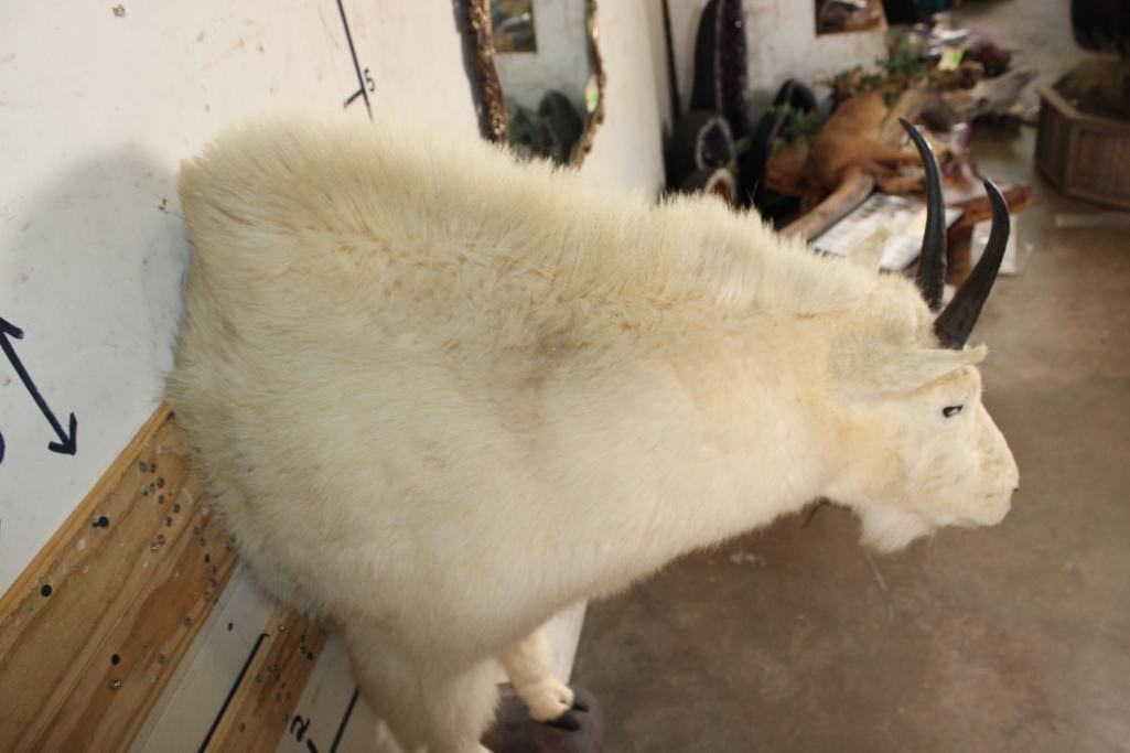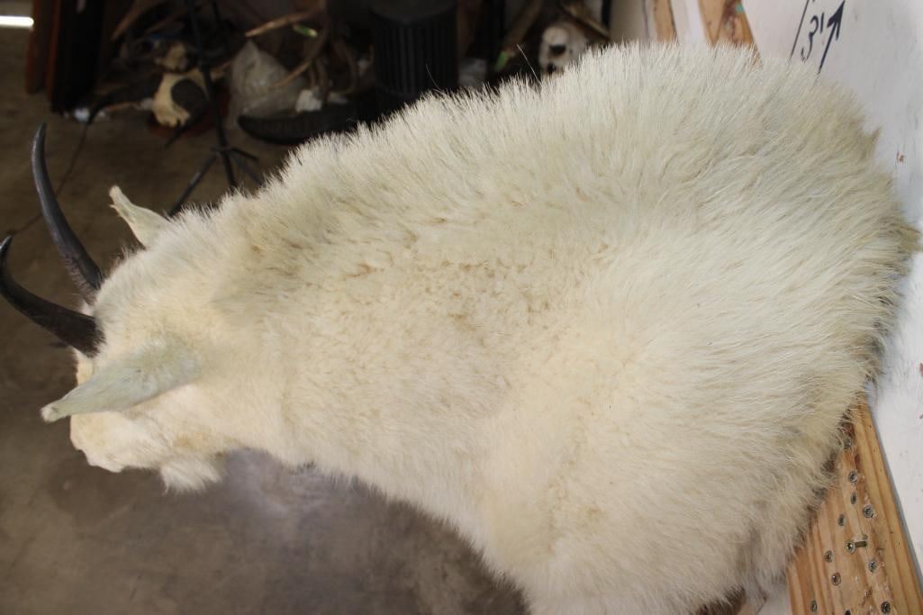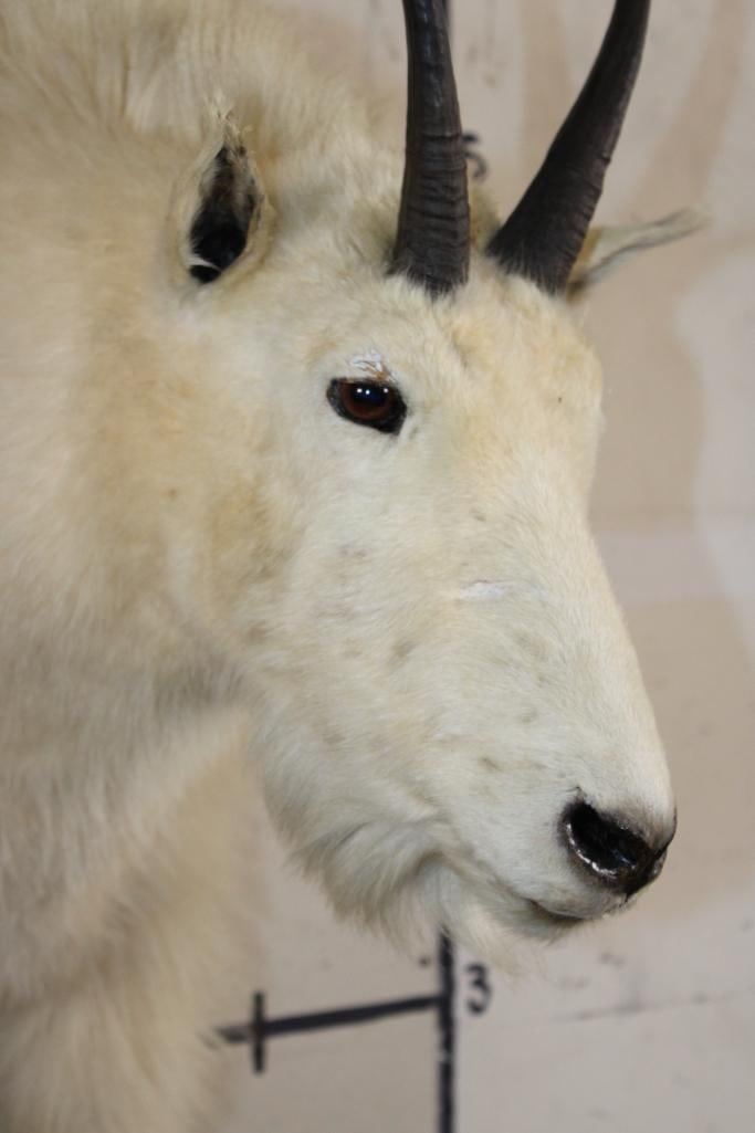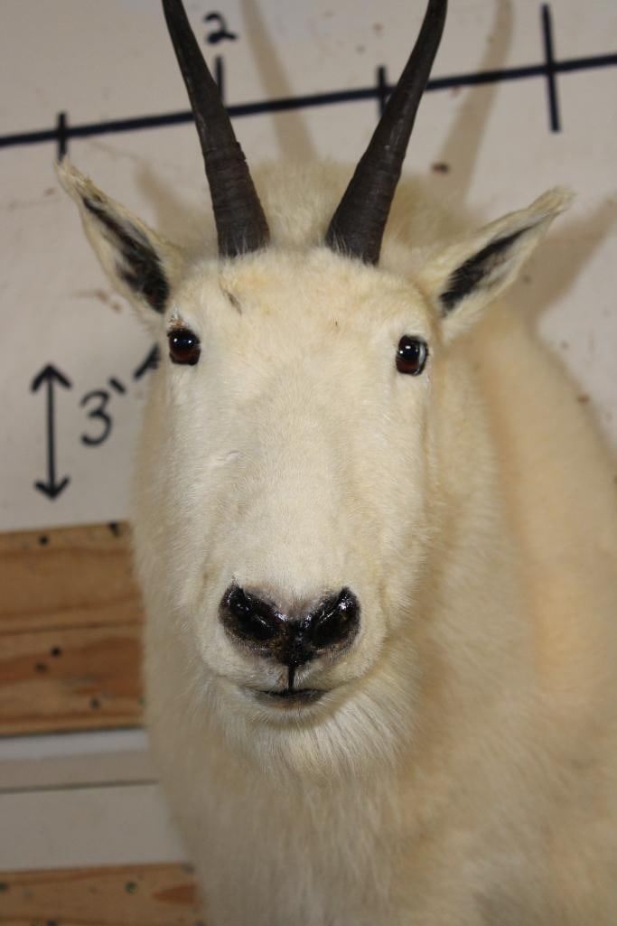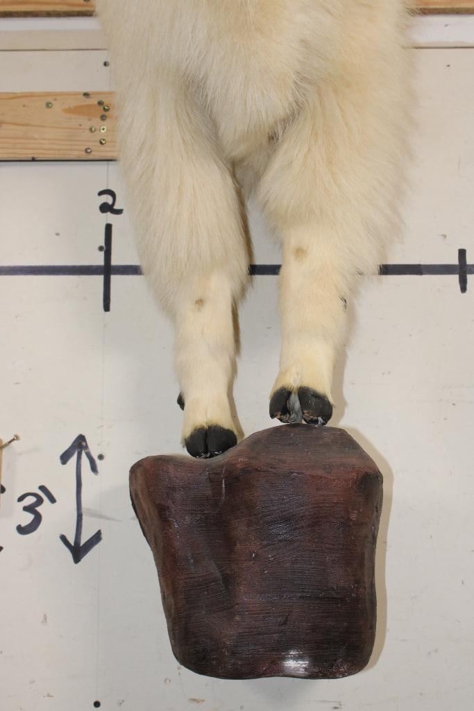 Half Body MOUNTAIN GOAT on a simulated Rock Wall Hanging Base. The Left Horn measures 8.25" Long and the Right Horn measures 8" Long. The Total Mount measures 4' Tall x 13" Wide x 30" Depth. TAXIDERMY