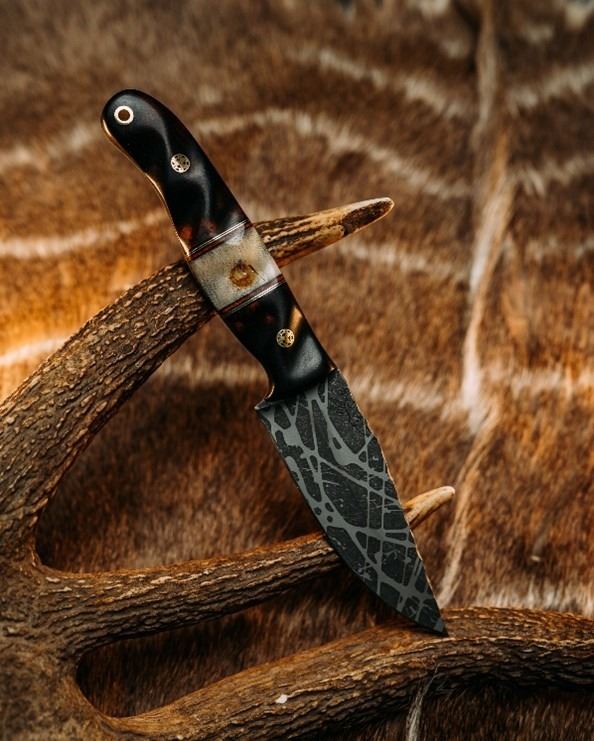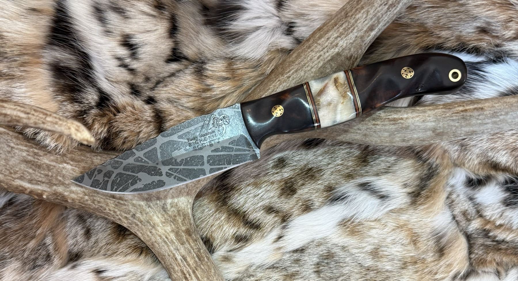 This one-of-a-kind “Crow Jr.” knife has been handcrafted and features a Rams horn center split, ironwood top and bottom, red G10 and brass pin striping, mosaic pins, a brass lanyard pin, and a splachshed acid etched finish on the blade. This knife also features the RMBS logo engraved on the blade.