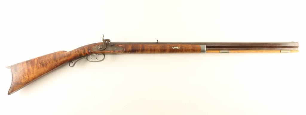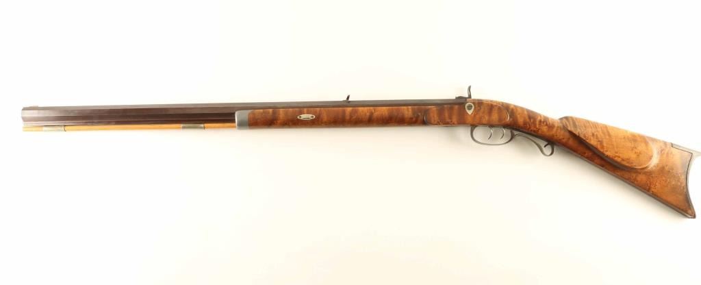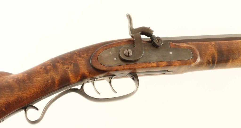 No markings observed. Features 30" octagon barrel, blade front sight & notch rear sight in dovetails, ramrod under barrel, double set triggers, right hand cheek piece, crescent buttplate. Triggerguard and other fittings are steel. Bore has a light coating of thin rust, strong sharp rifling. Barrel is browned, with even color and full coverage. Lock plate has a thinner coloration, with a slightly mottled appearance. Buttplate shows mottled silver and brown colors. Stock is a very attractive dark maple or similar wood, with bird's eye and flame figure, especially at butt. Wood to metal fit is generally good. Hammer does not stay cocked, unless rear set trigger is first "set", then hammer will stay cocked. Condition is NRA Very Good - lock needs attention *** Antique Firearm ***