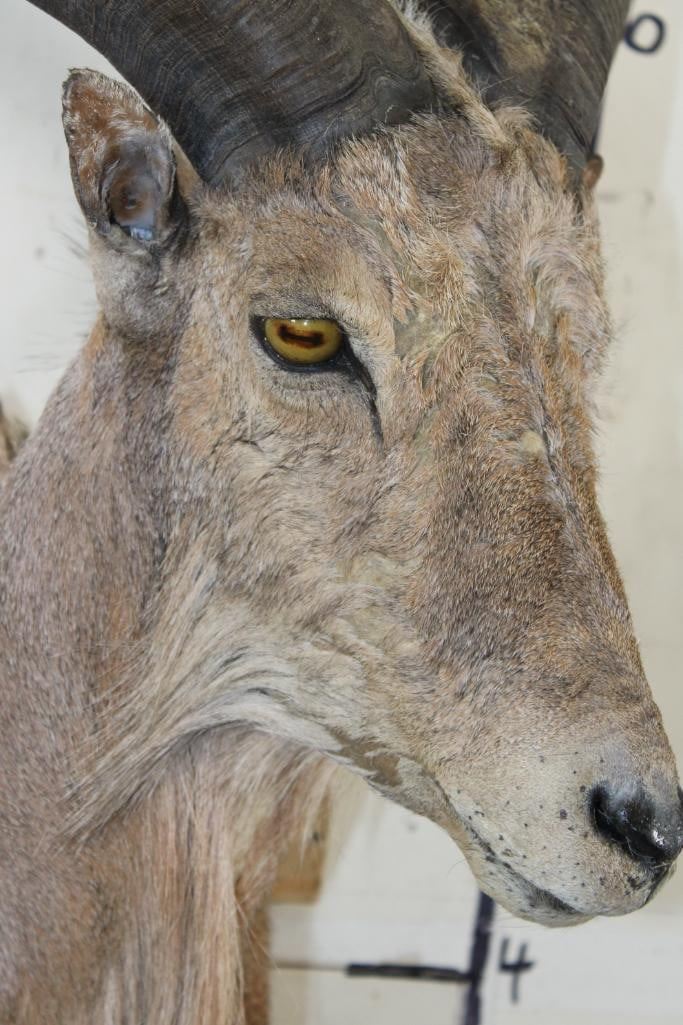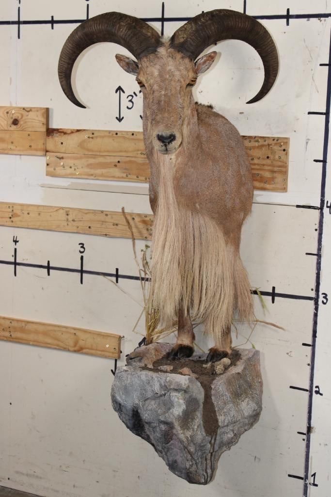 Half-body AOUDAD on a Simulated Rock Base. The Left Horn measures 27.5" Long and the Right Horn measures 27" Long. It has some minor hair loss in some spots. TAXIDERMY