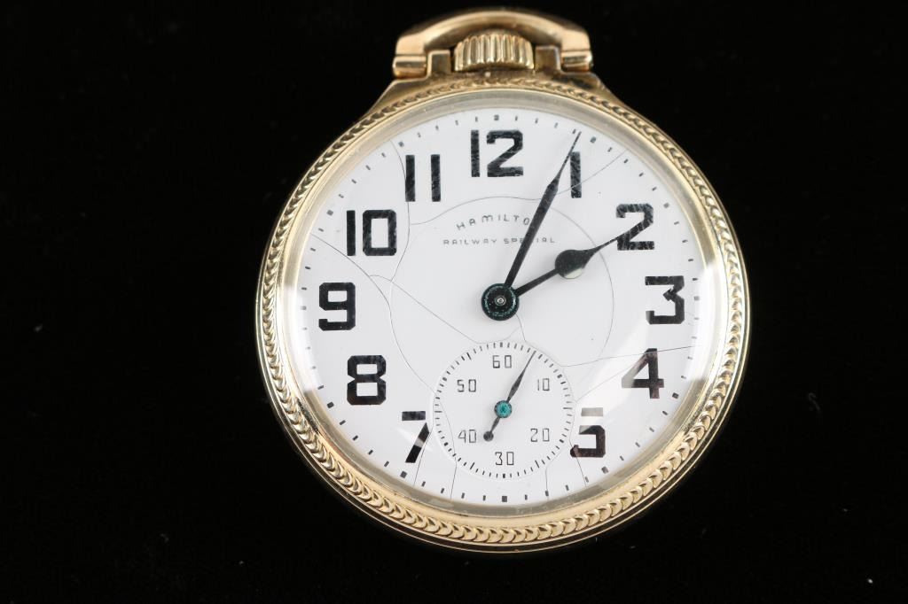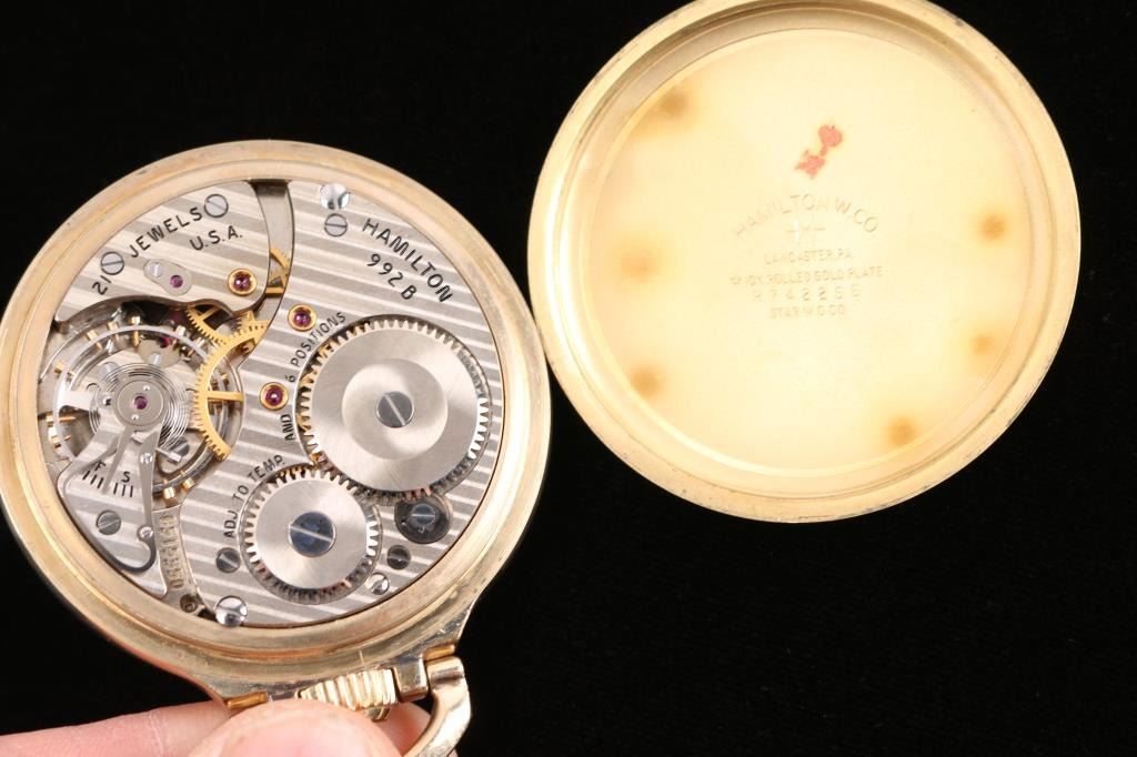 Hamilton ' Railway Special' grade 992B, model 5, size 16, 21 jewel. Number C515350, manufactured 1968.( Production ceased in 1969) Hamilton/Star10K gold rolled plate case. Railroad grade. In good working order. Has minor 'spider' dial.
