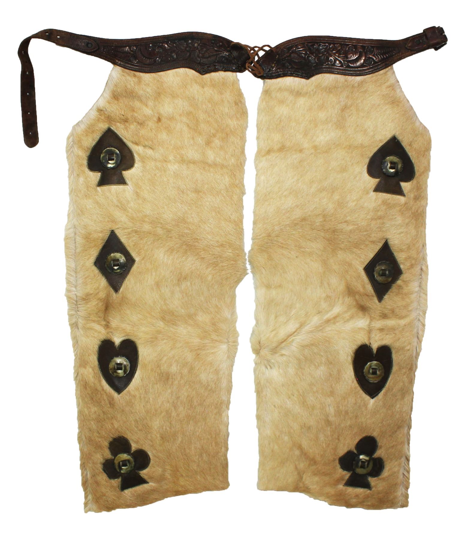 An unusual pair of hair-on cowhide chaps with decoratively applied card suit pattern centered with nickel conchos, and topped of with a beautifully tooled and maker marked belt. Measuring 37" in length.