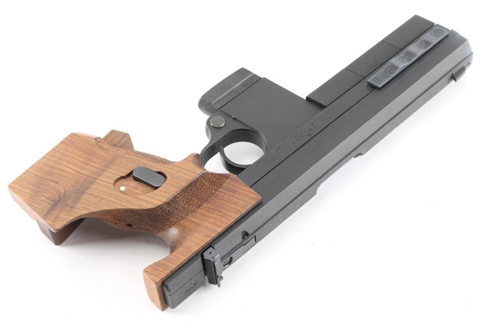 The Hammerli 280 is an Olympic Competition design target pistol. Striker-fired semi-automatic chambered in .22 Long Rifle. Manufactured in Switzerland by Hammerli, imported by Sig Arms, Exeter NH, manufactured between 1991-1993. Stippled ergonomic grip with adjustable palm shelf. safety in the left side of grip. 4 1/2" barrel, smooth wide trigger, 3.6mm front sight blade, adjustable square notch rear sight. Three factory barrel weights installed. Matte black finish. Pistol is in like new condition, bore is pristine.