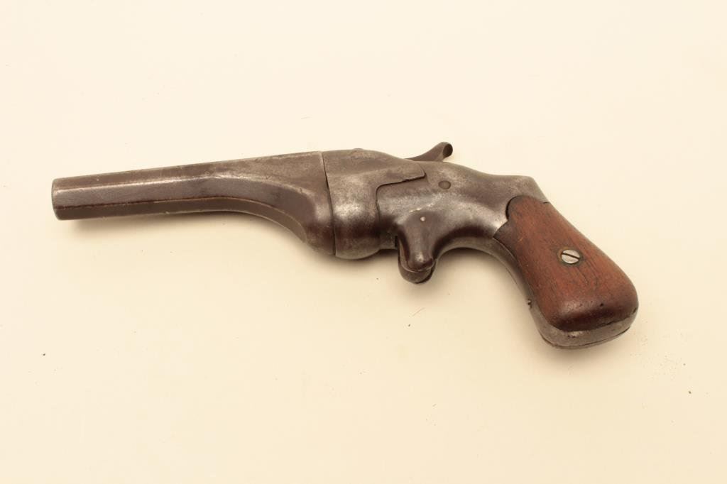 This pistol shows a brown patina finish with old wood grips and legible address. Some minor pitting and storage marks. An old west large bore belt pistol that shot the same cartridge at a Henry and 1866. (Antique) Est.: $250-$500