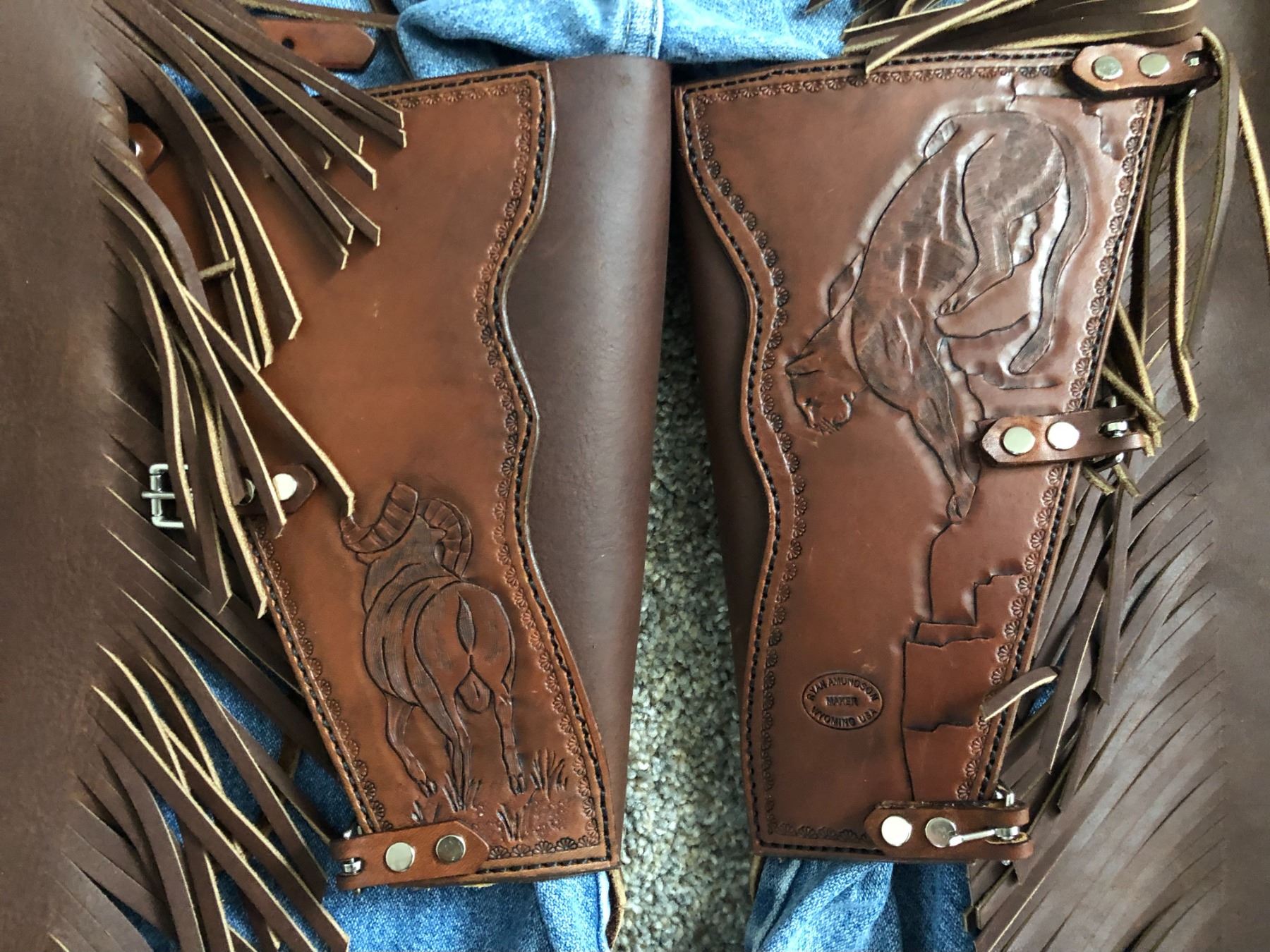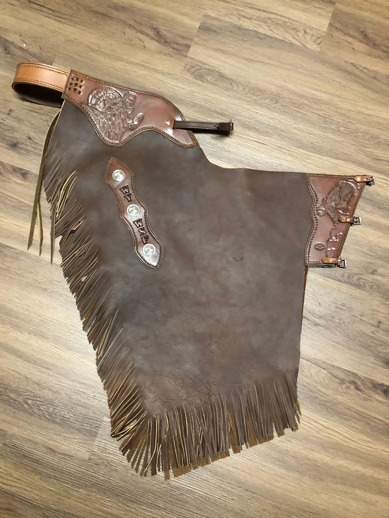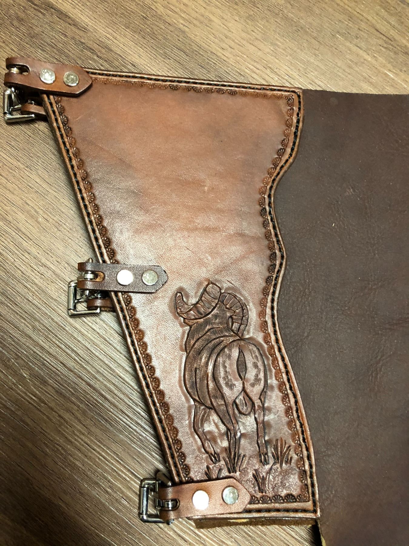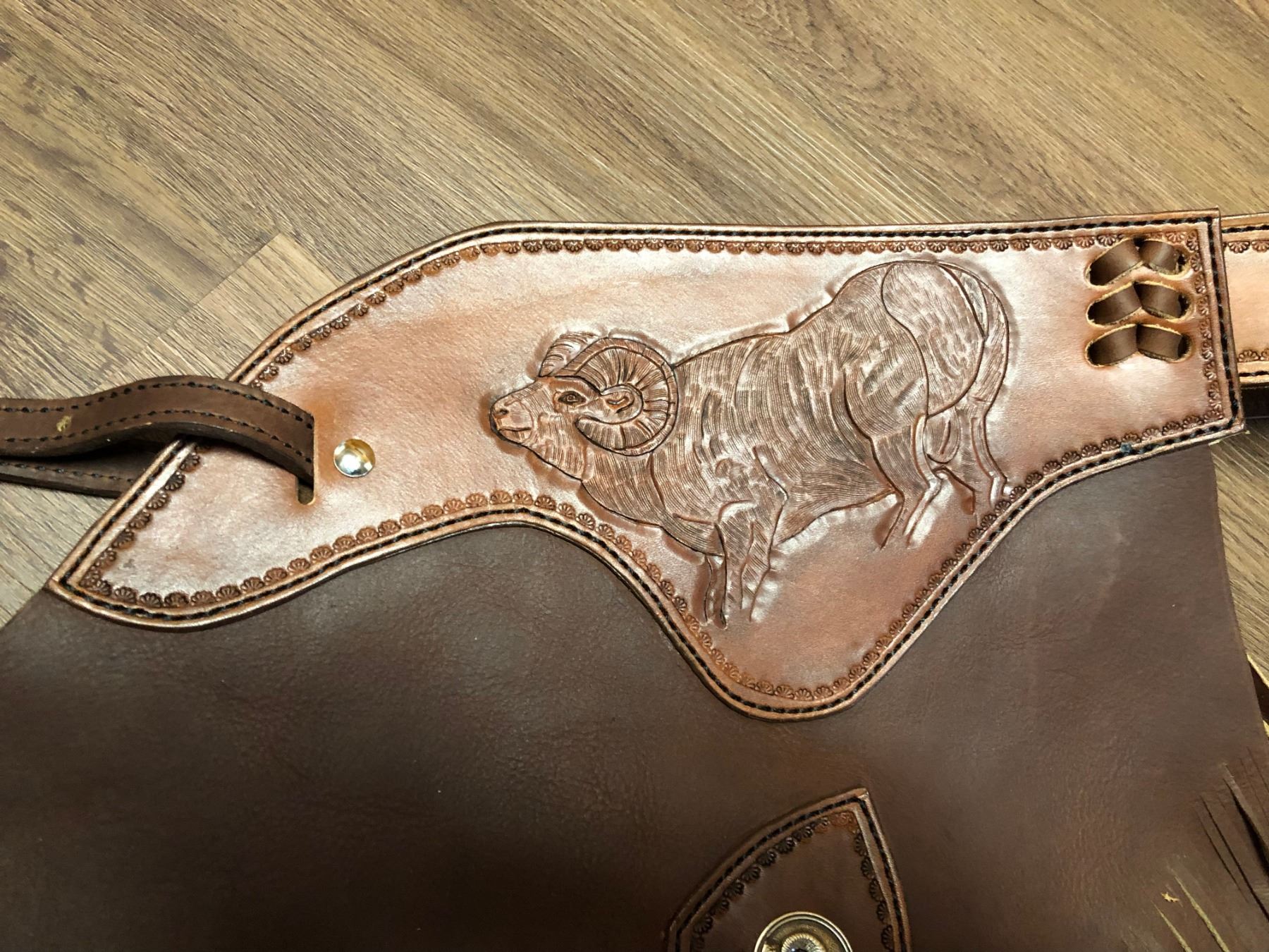 Description: A set of custom handmade leather chinks. Highest quality leather and hardware used with hand tooled images of bighorn sheep on yolks. Will fit various waist sizes and leg sizes with adjustable waist belt and leg straps.