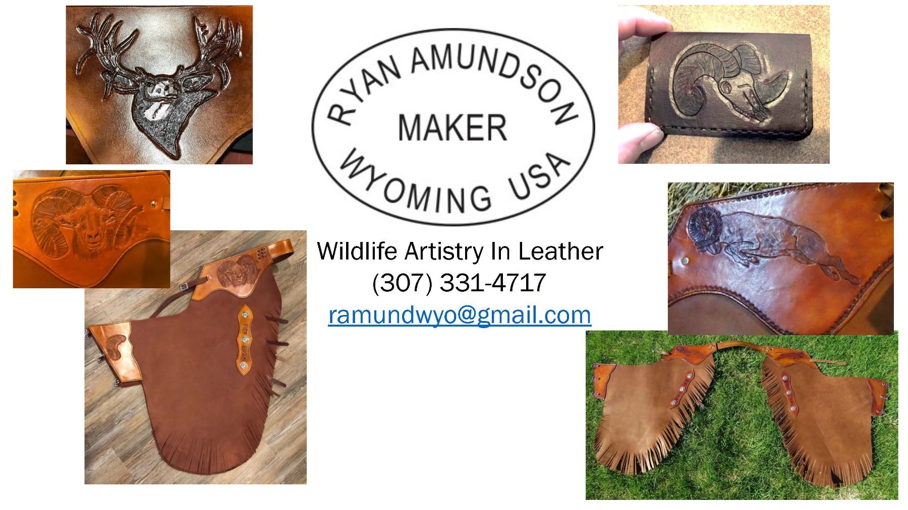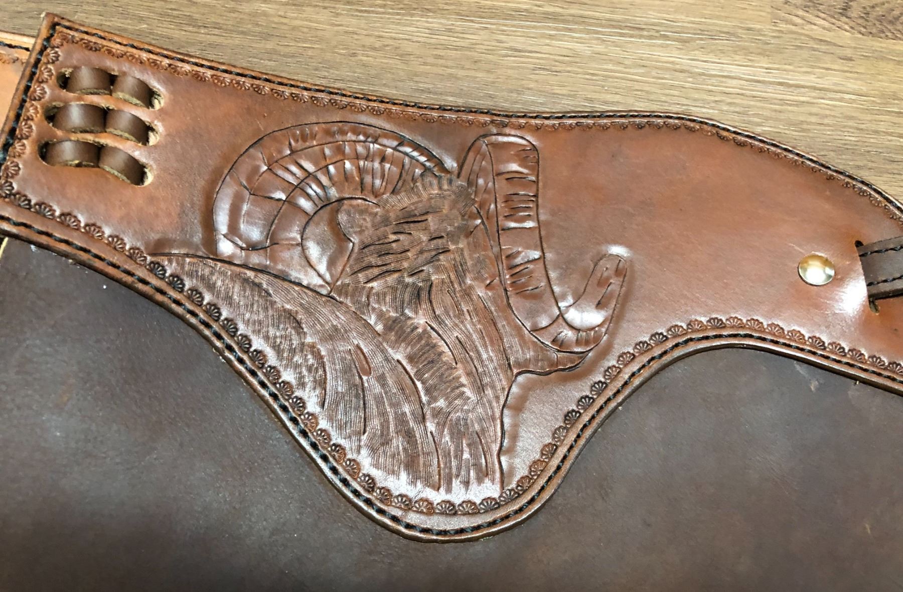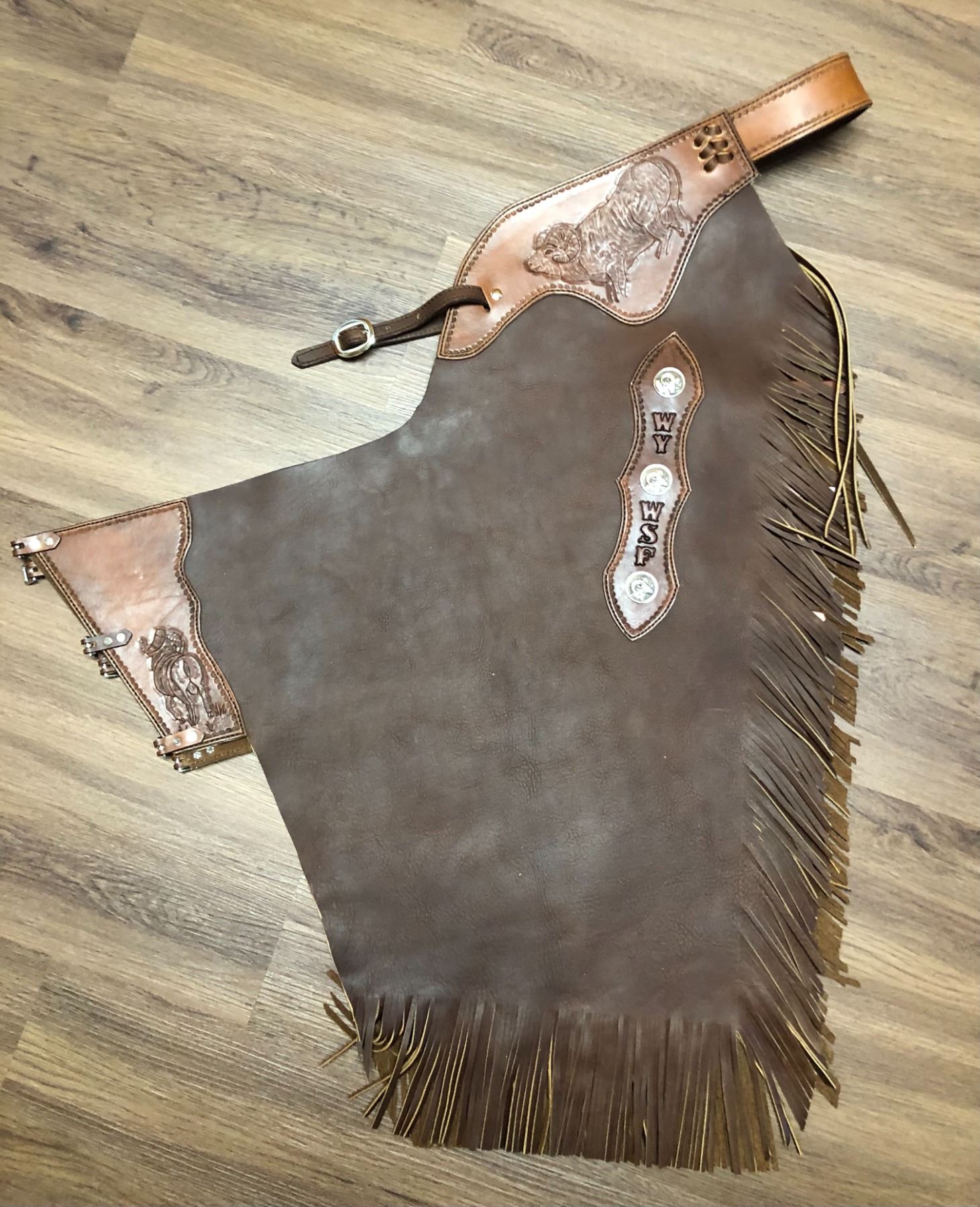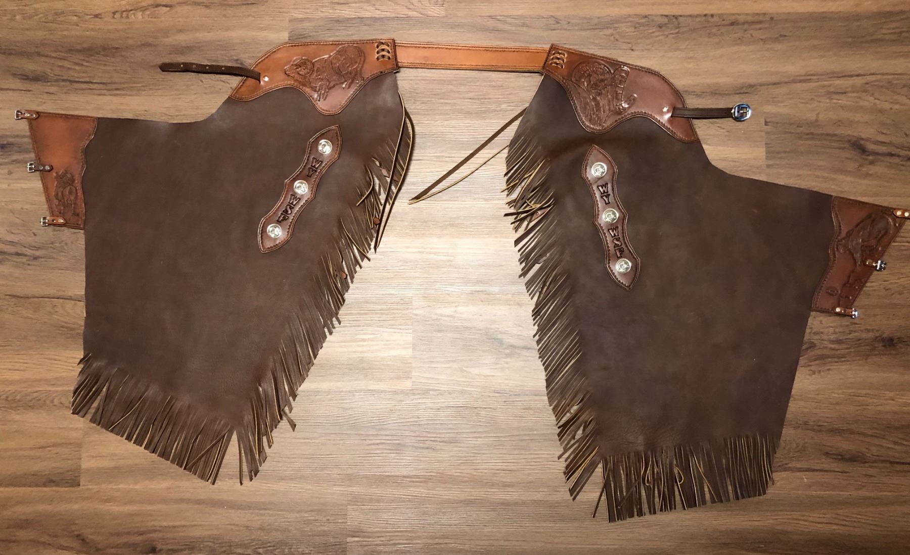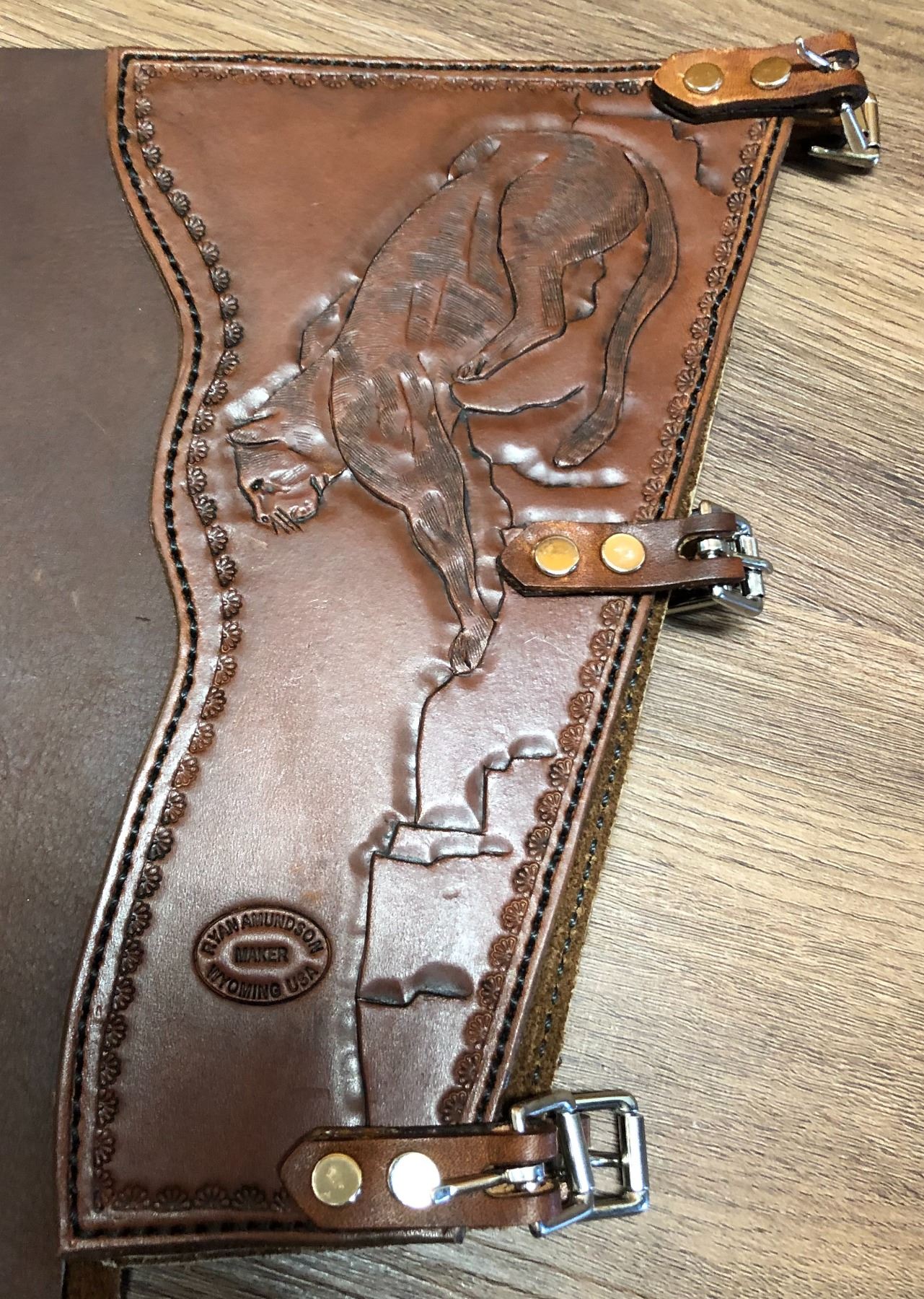 Description: A set of custom handmade leather chinks. Highest quality leather and hardware used with hand tooled images of bighorn sheep on yolks. Will fit various waist sizes and leg sizes with adjustable waist belt and leg straps.